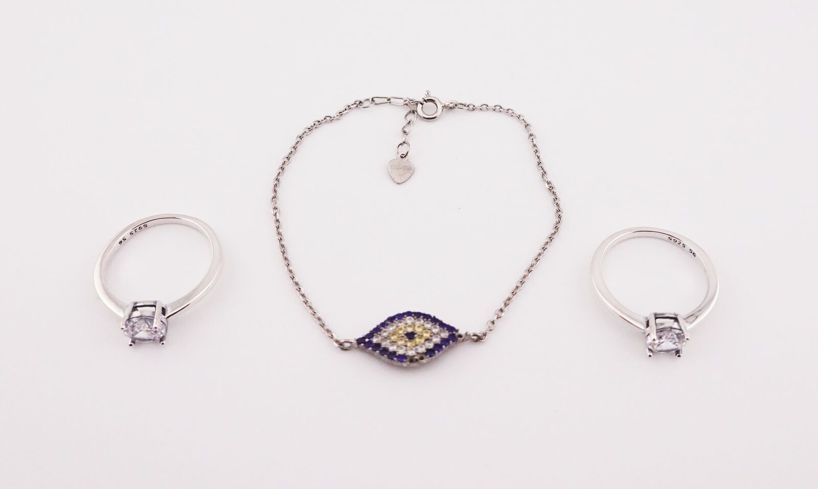 Lot consisting of a heart bracelet and two stone-set silver rings