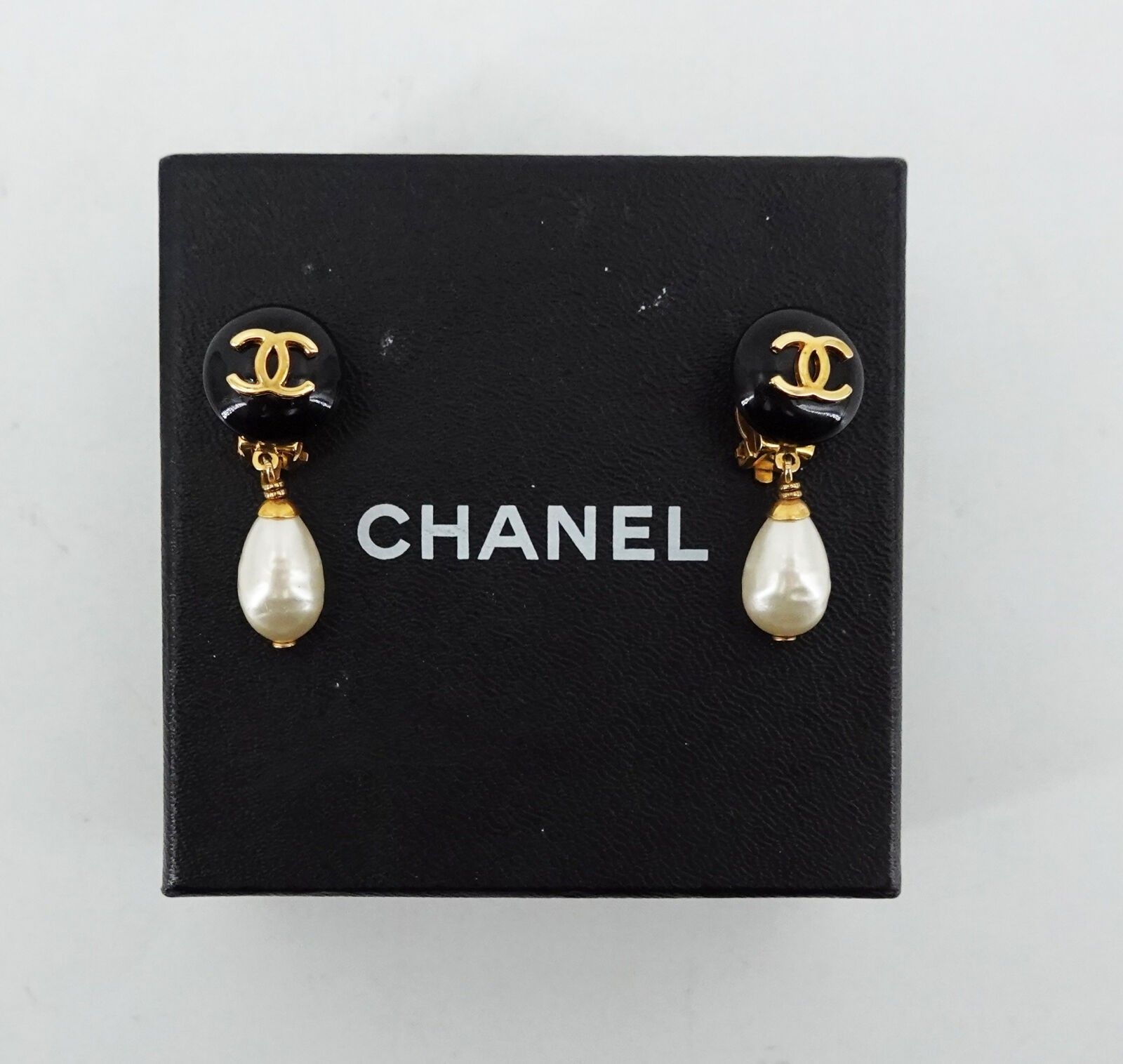 Pair of black lacquered gilt metal earrings with pendant pearls, signed and numbered 97P, with box