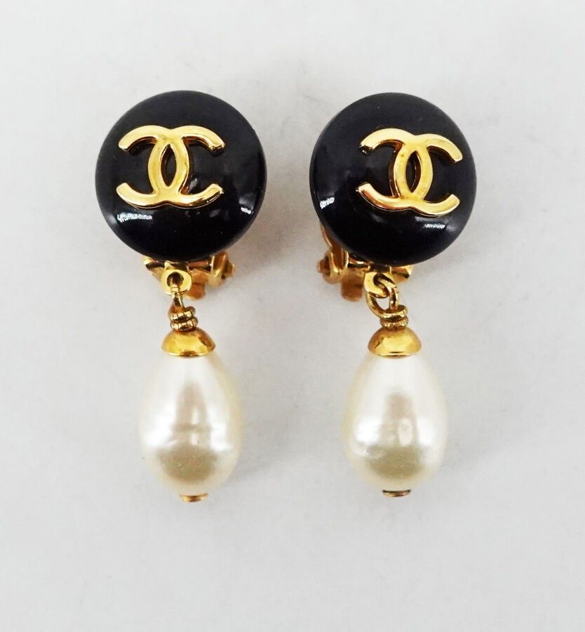 CHANEL Pair of black lacquered gilt metal earrings with pend…