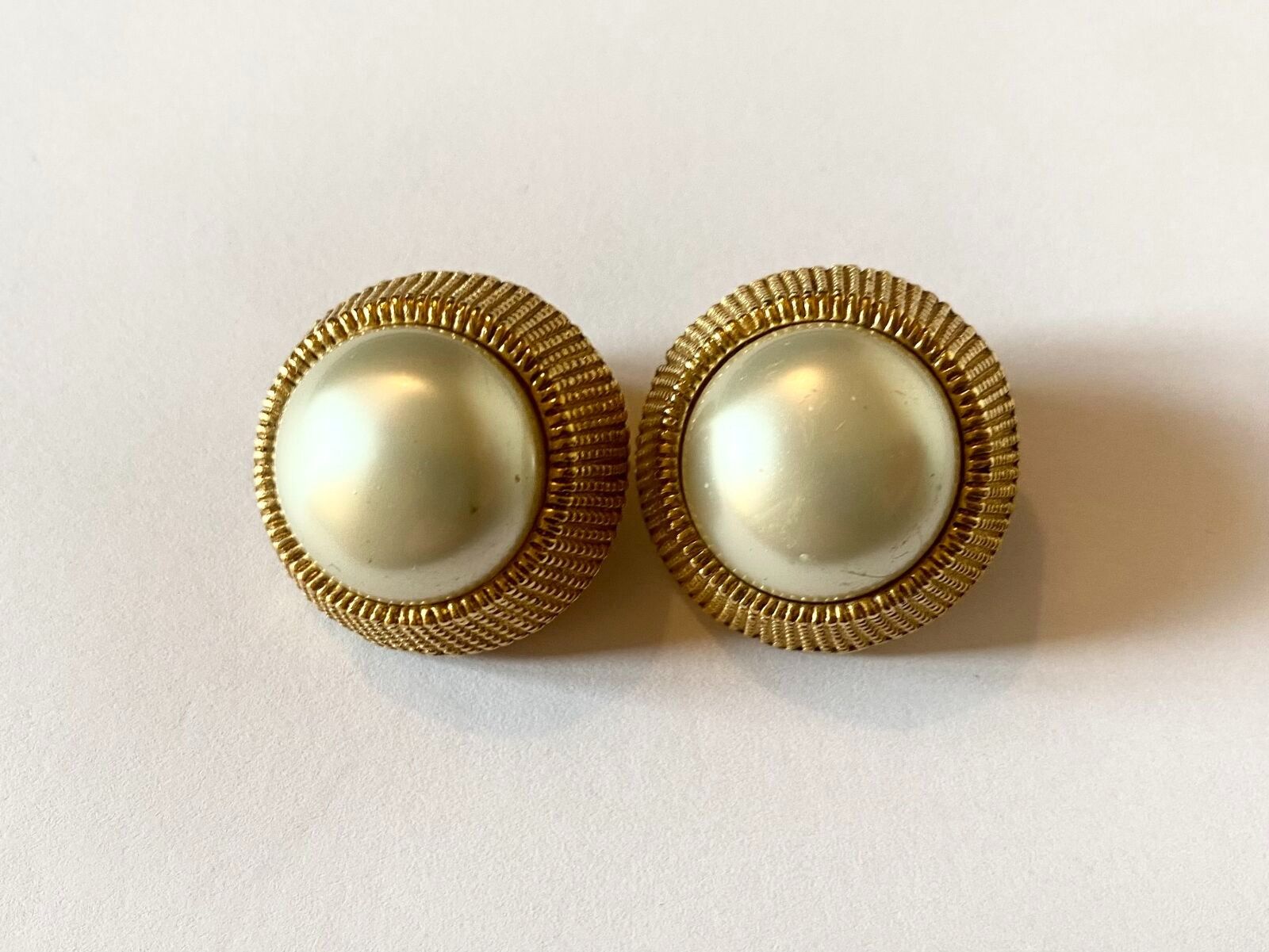 Pair of gold-plated metal ear clips with half-pearls, signed