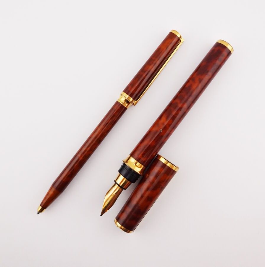 Shaded red resin set including a fountain pen with gold nib and a ballpoint pen