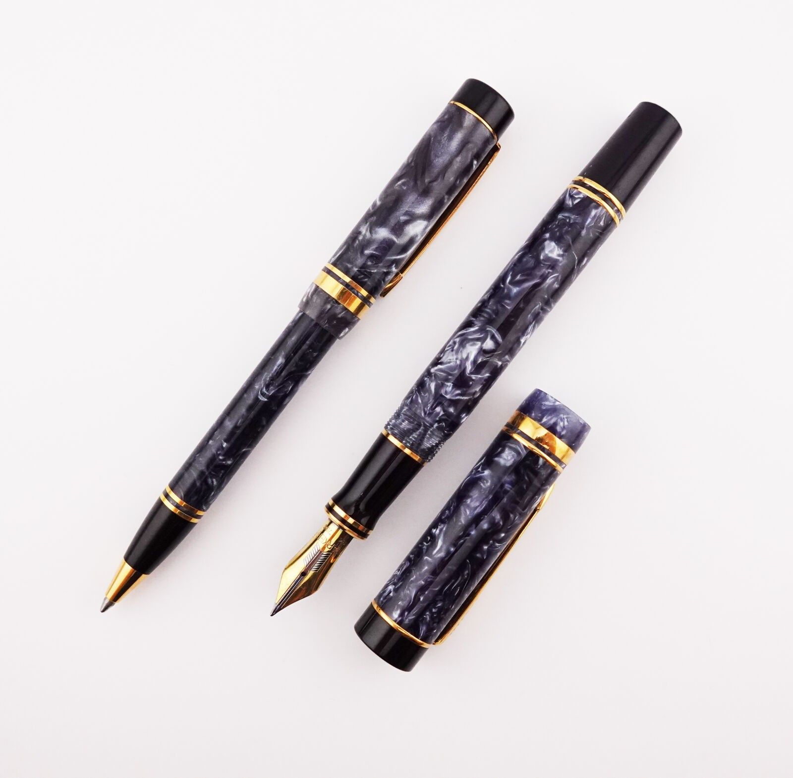 Shaded blue resin set including fountain pen with gold nib and ballpoint pen
