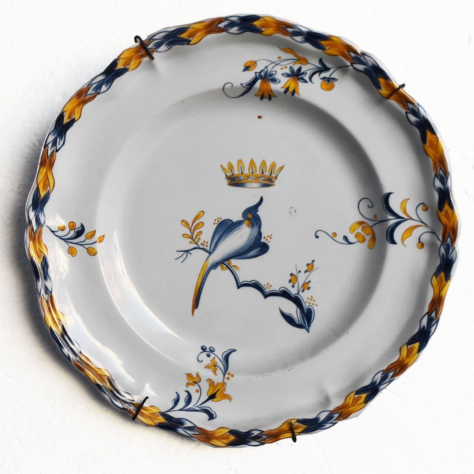 Glazed earthenware plate decorated with a bird branching out under a crown, signed under the base