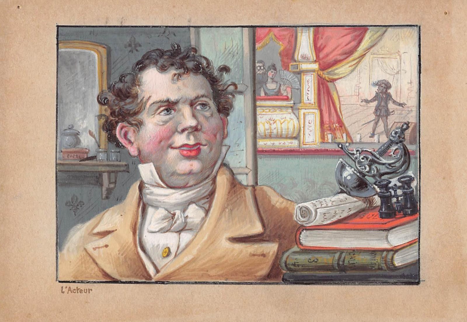 Advertising card-sized gouache drawing of an actor (series of professions)