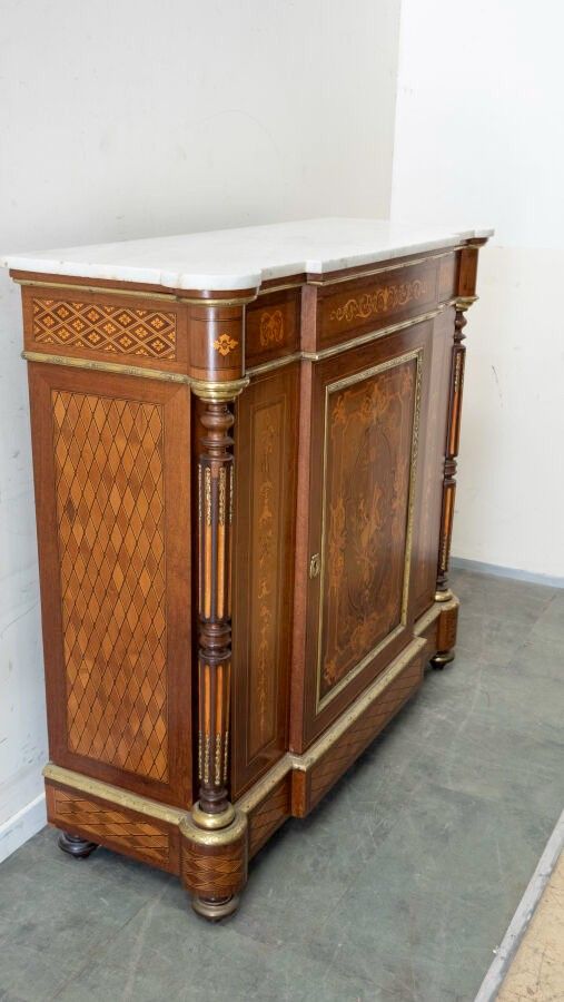 Louis XVI style veneered and marquetry high cabinet decorated with musical instrument trophies and lattice work, detached column uprights, veined white marble top, ormolu trim