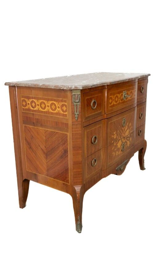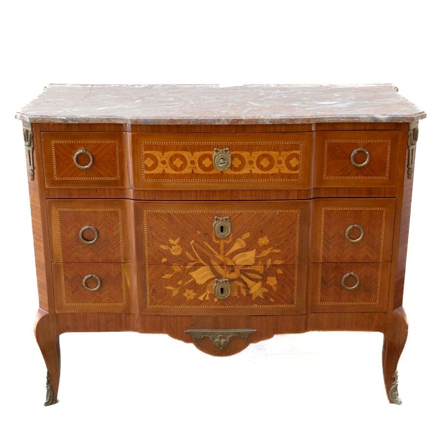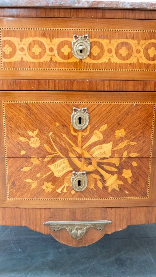 Transition style chest of drawers in veneered wood and marquetry of trophies of musical instruments opening with three drawers, two of which are railless, gilt bronze trim and veined marble top