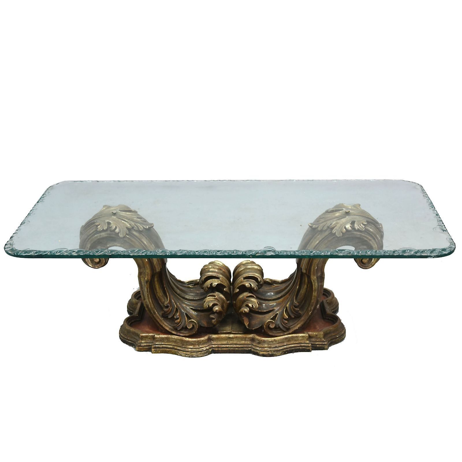 Venetian-style coffee table in carved and gilded wood with acanthus decoration, glass top, 1940s