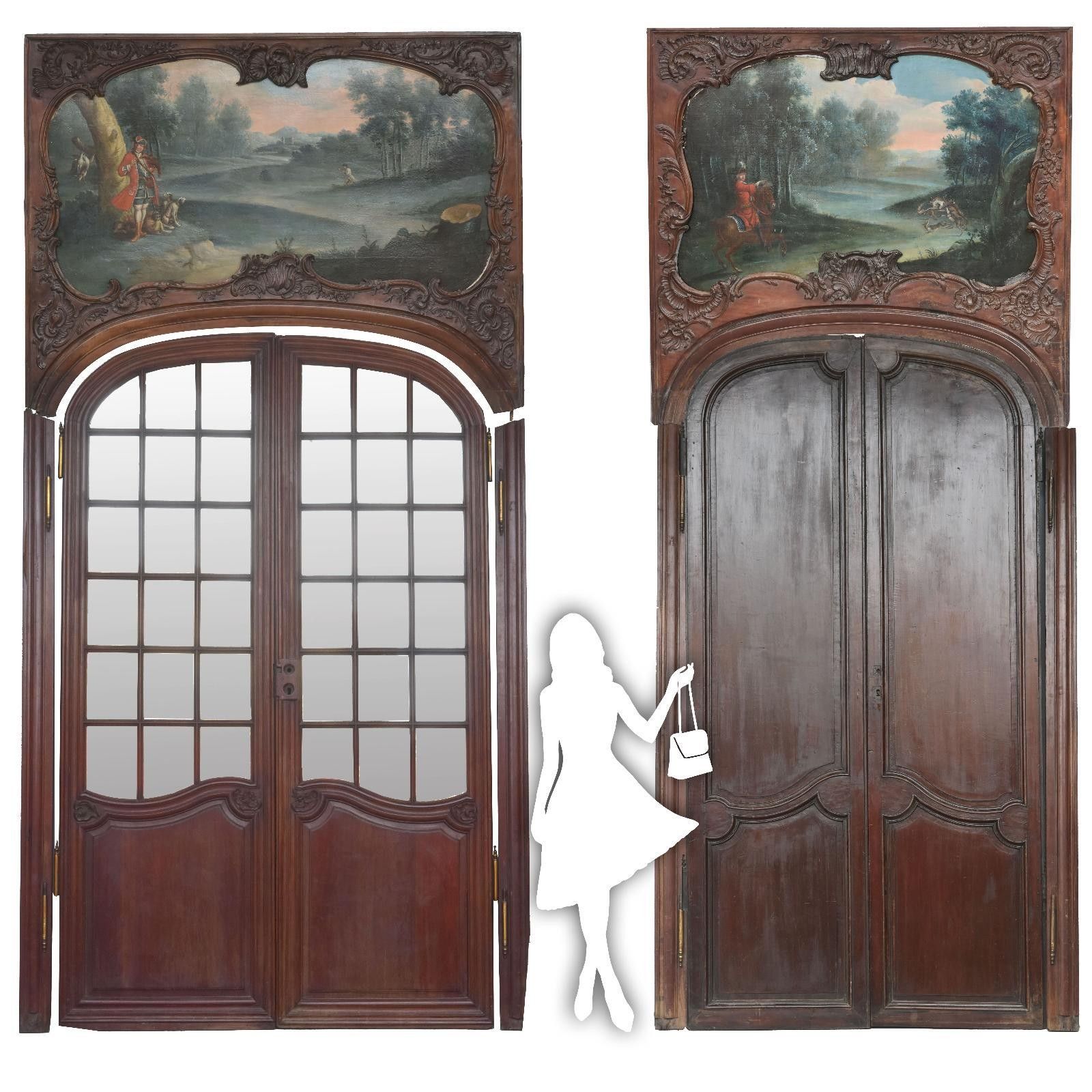 Spectacular set of complete and matching mahogany doors decorated with hunting scenes, comprising a two-leaf mirror door and a two-leaf full door, Louis XV period, 18th c.