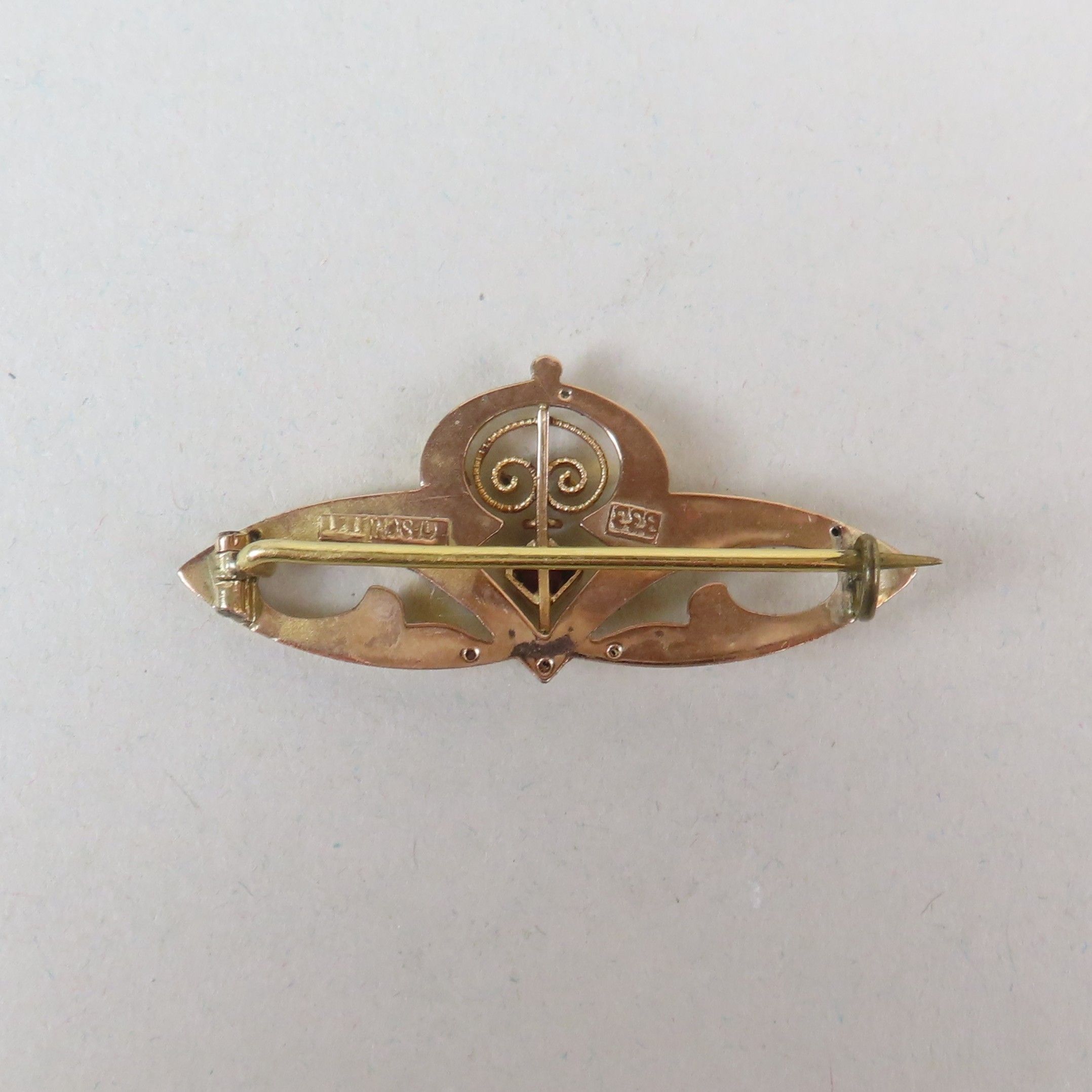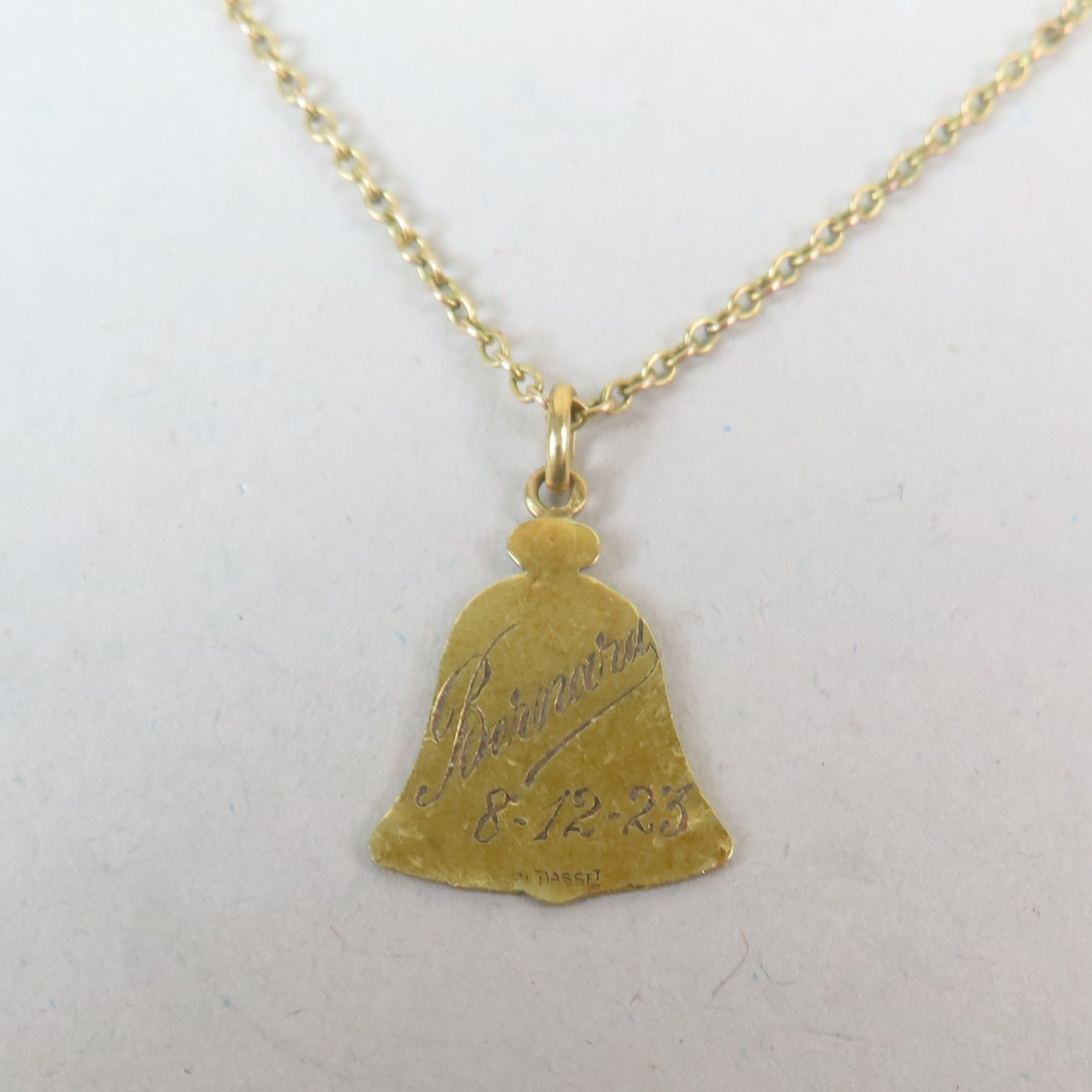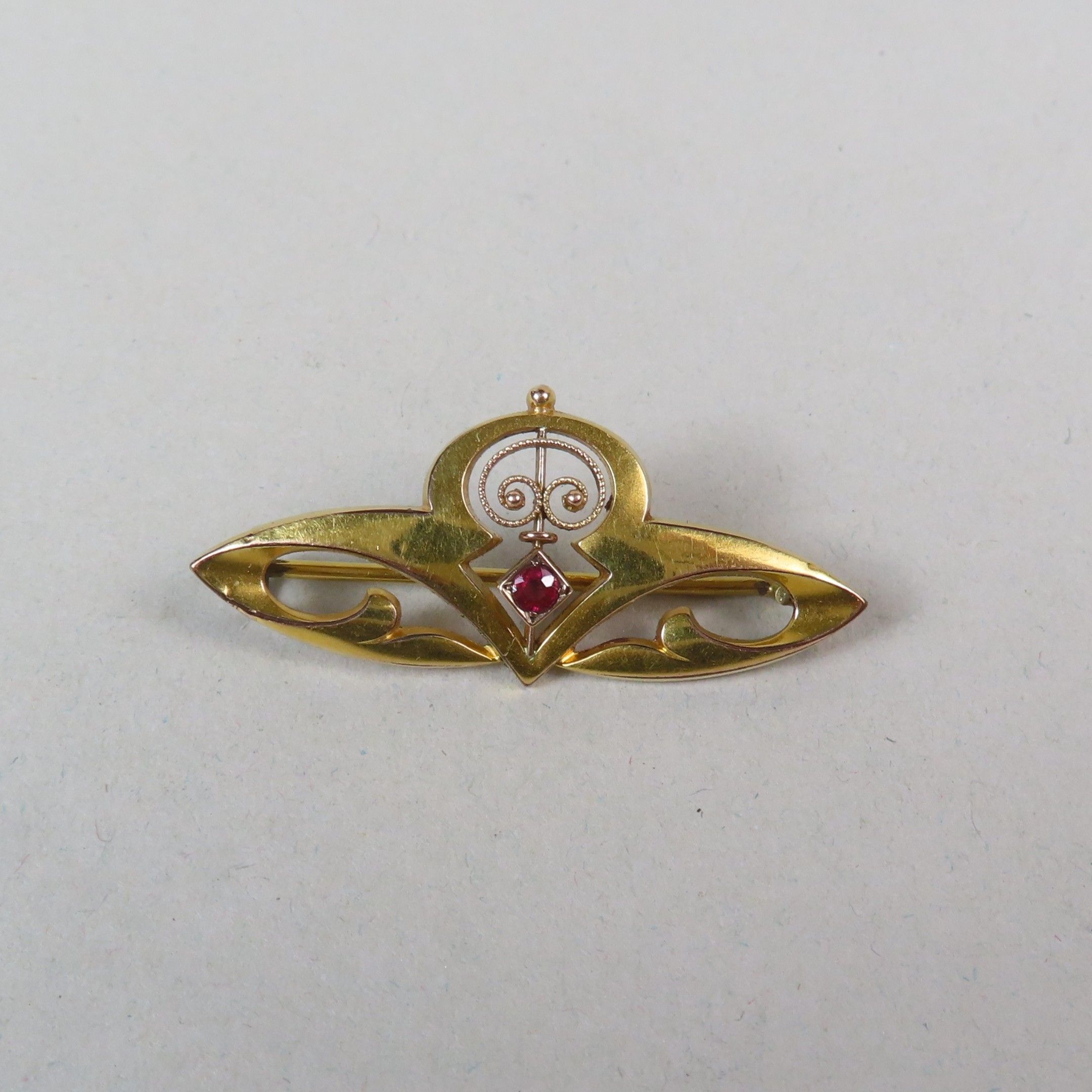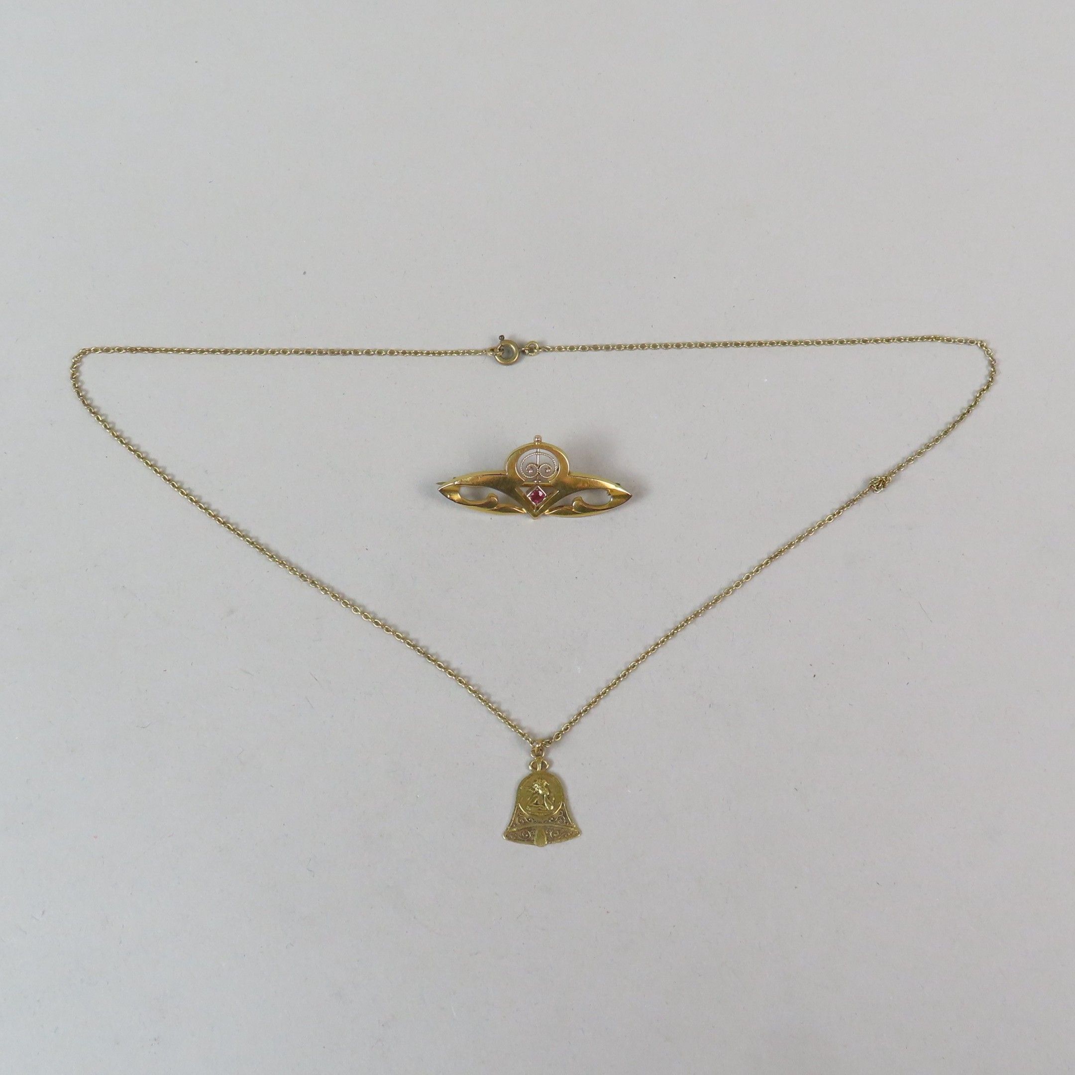 Pendant in yellow gold (750/00), depicting a cherub on a bell (with gilt metal chain). Weight = 1 g. A brooch in yellow gold (333/00) with a small red stone. Length = 37 mm. Gross weight = 1.6 g
