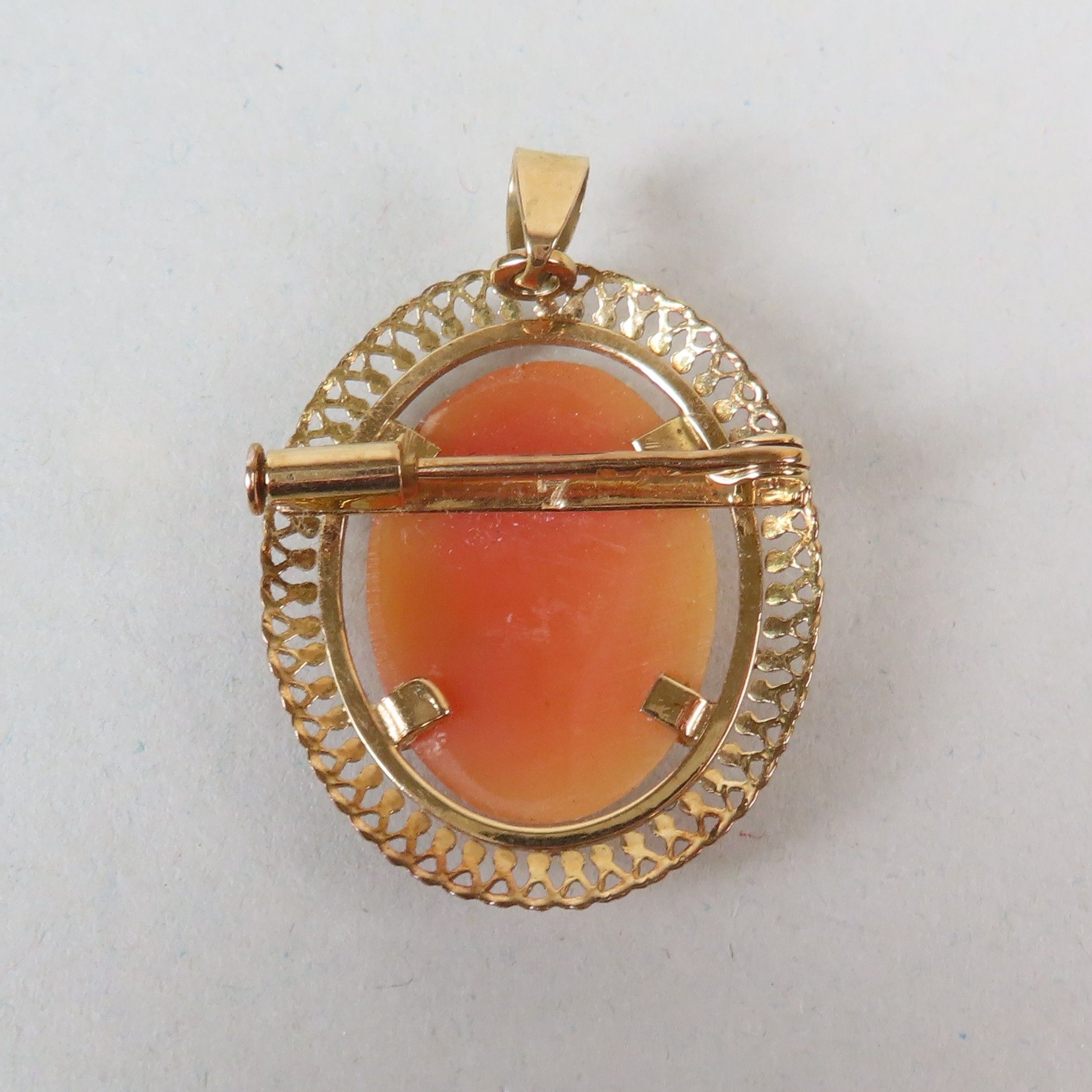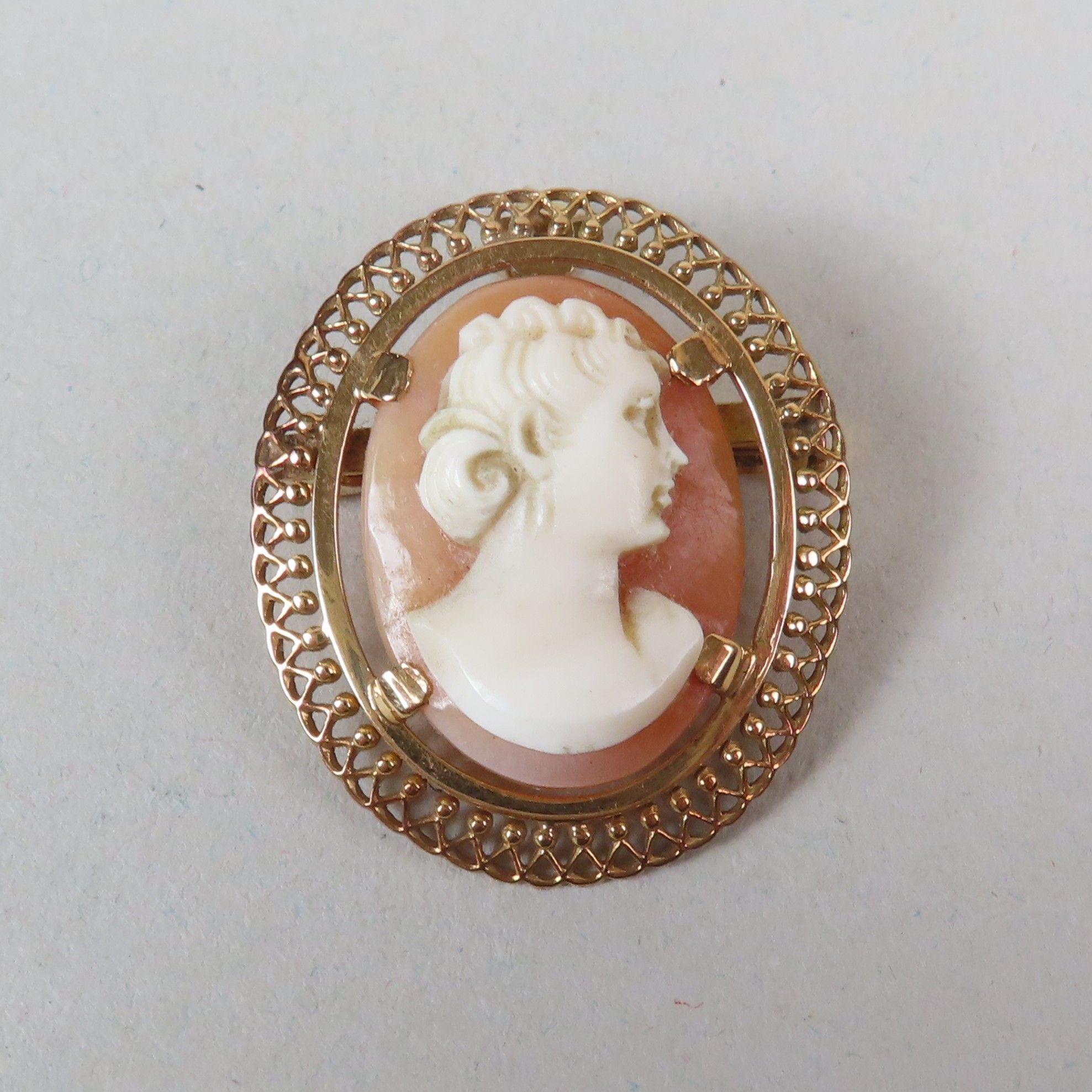 Brooch pendant in yellow gold (750/00), with a shell cameo showing a female profile. 28 x 24 mm. Gross weight = 5.2 g.