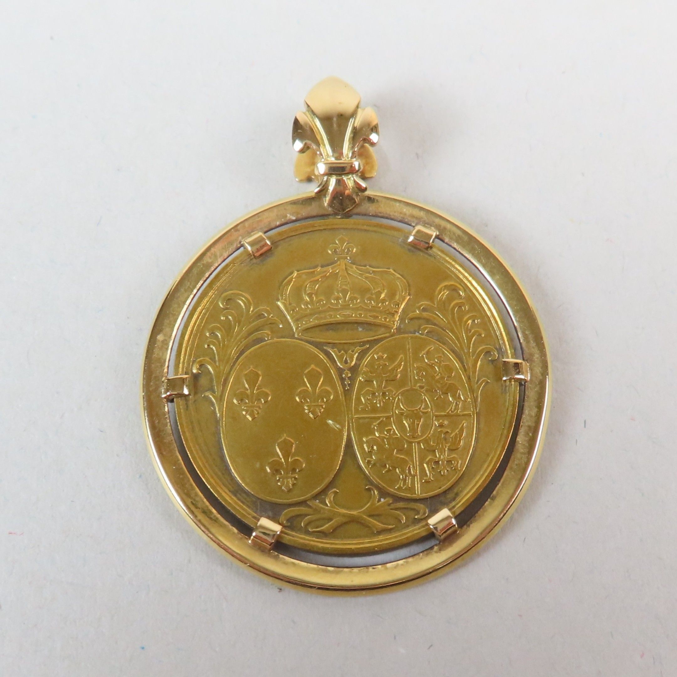 Pendant set in yellow gold (750/00) with a gilt metal medal depicting a profile of Marie Leczinska. Height = 40 mm. Gross weight = 13.7 g.