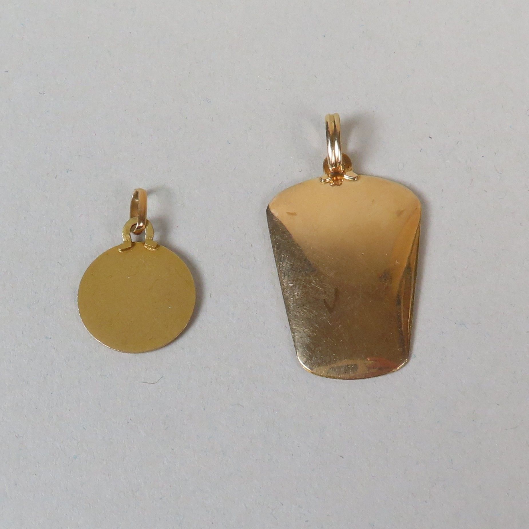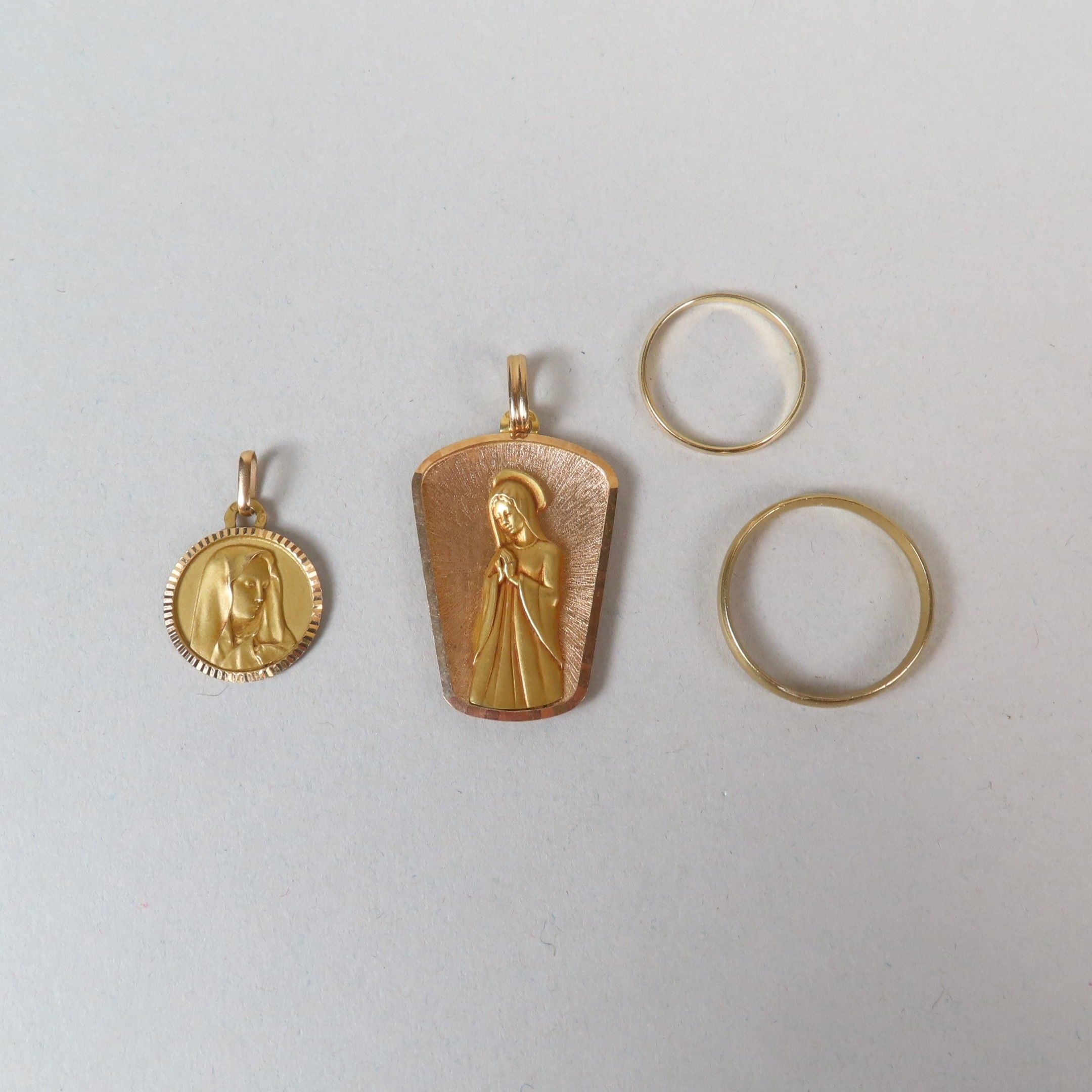 Lot of jewellery in yellow gold (750/00) comprising two wedding rings (TDD = 52 and 61/62) and two religious medals depicting the Virgin Mary (max. height = 33 mm). Weight = 7.9 g.