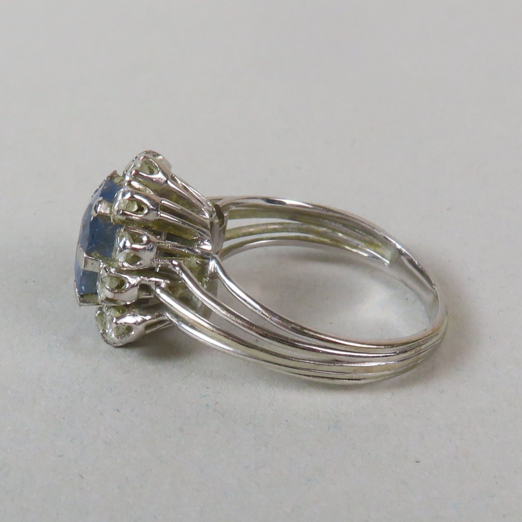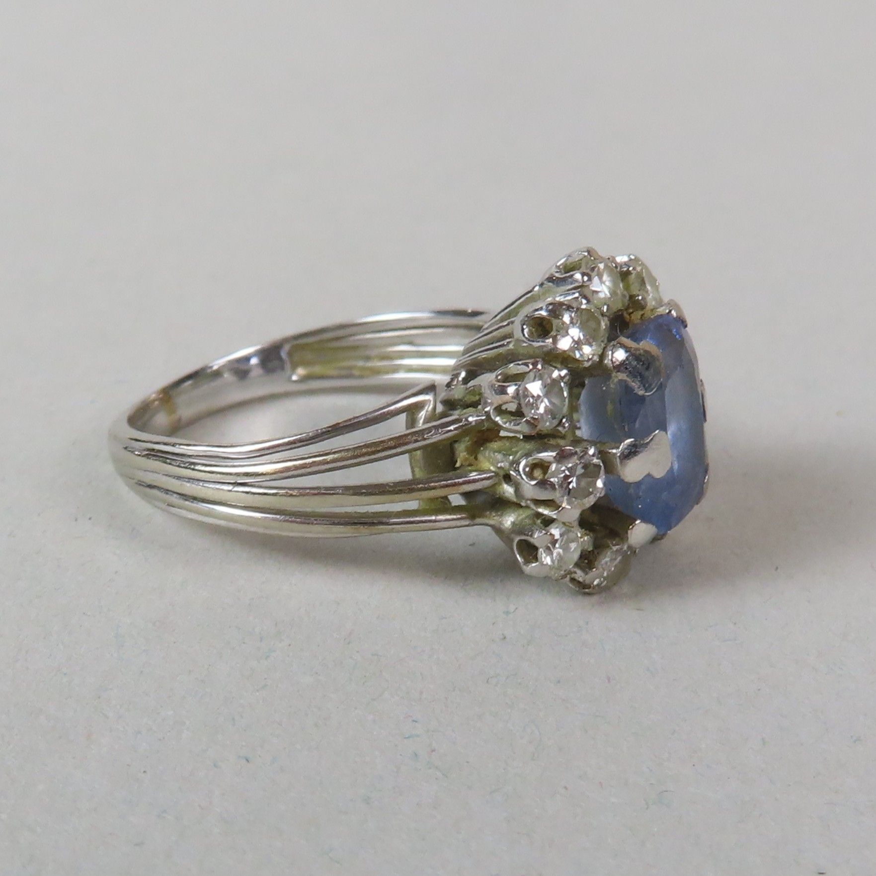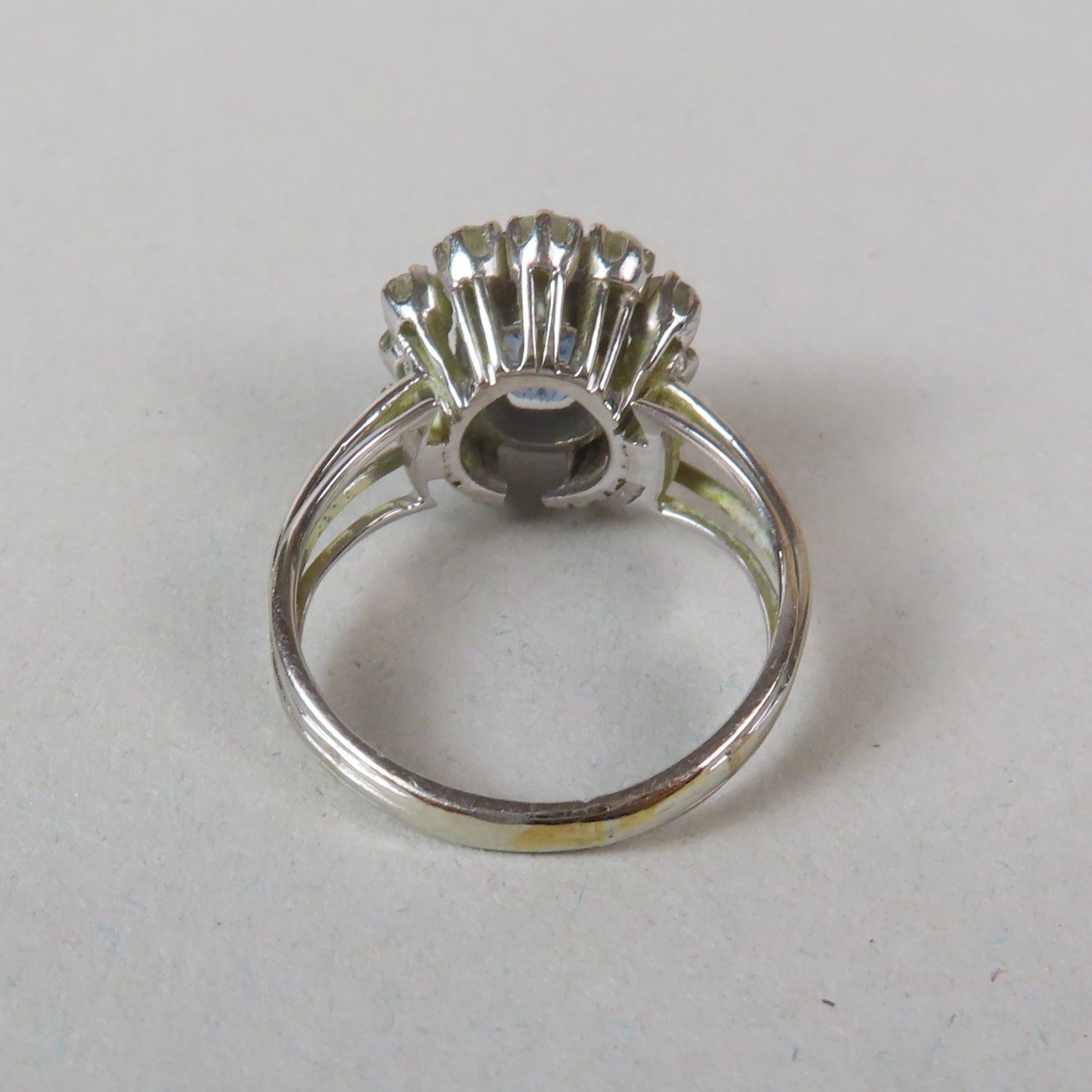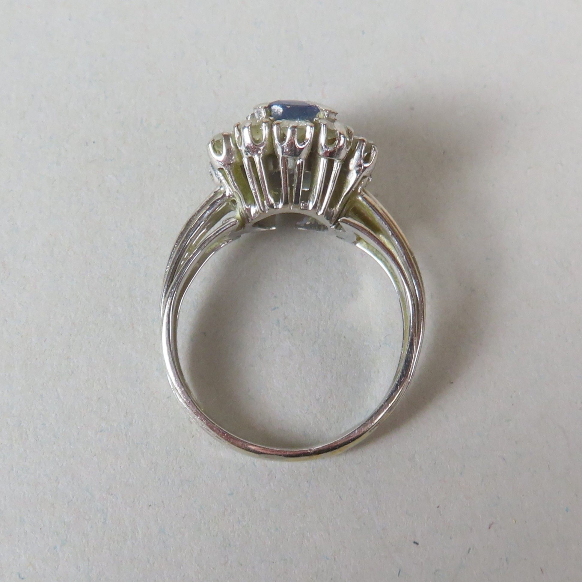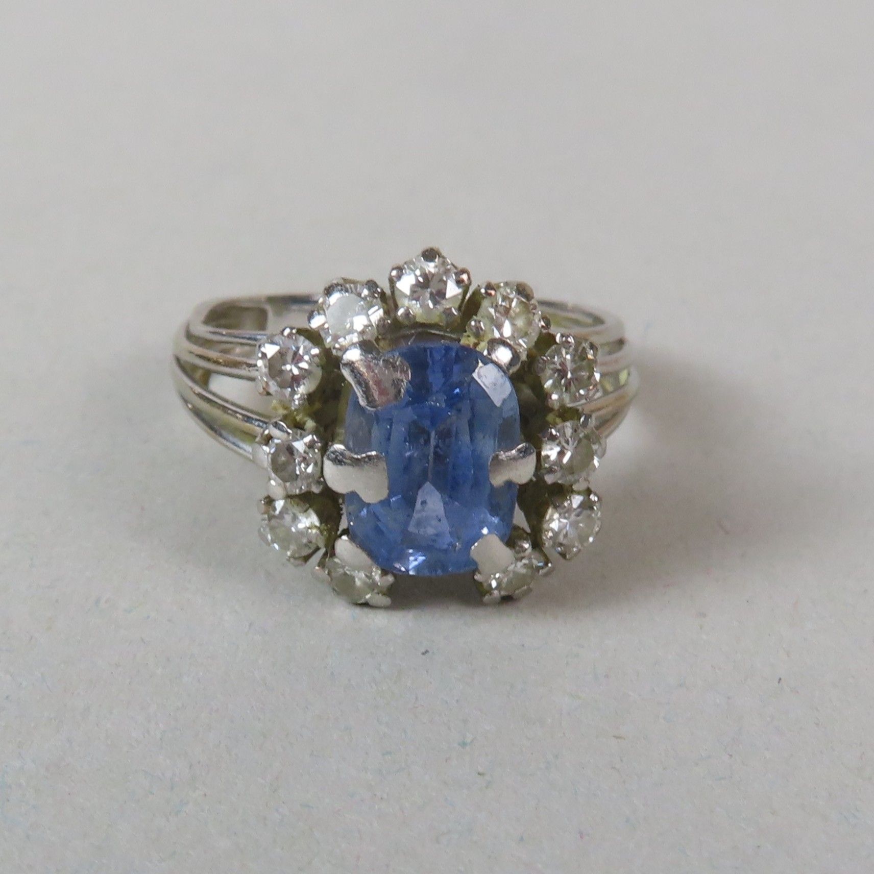 Ring in white gold (750/00), set with a faceted sapphire (8.5 x 6 mm) in a surround of diamonds (approx. 0.03 ct each). TDD = 53/54. Gross weight = 5.5 g. (chips; missing)