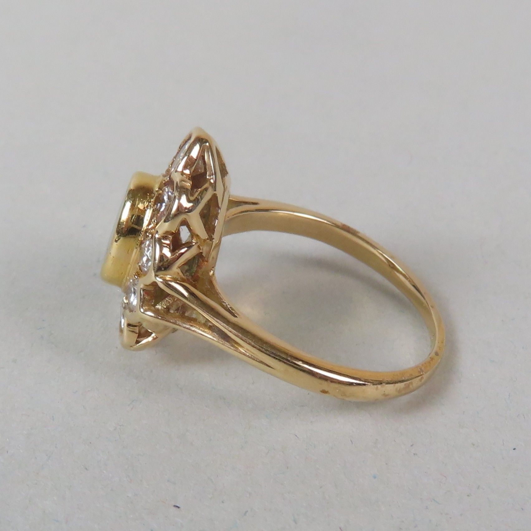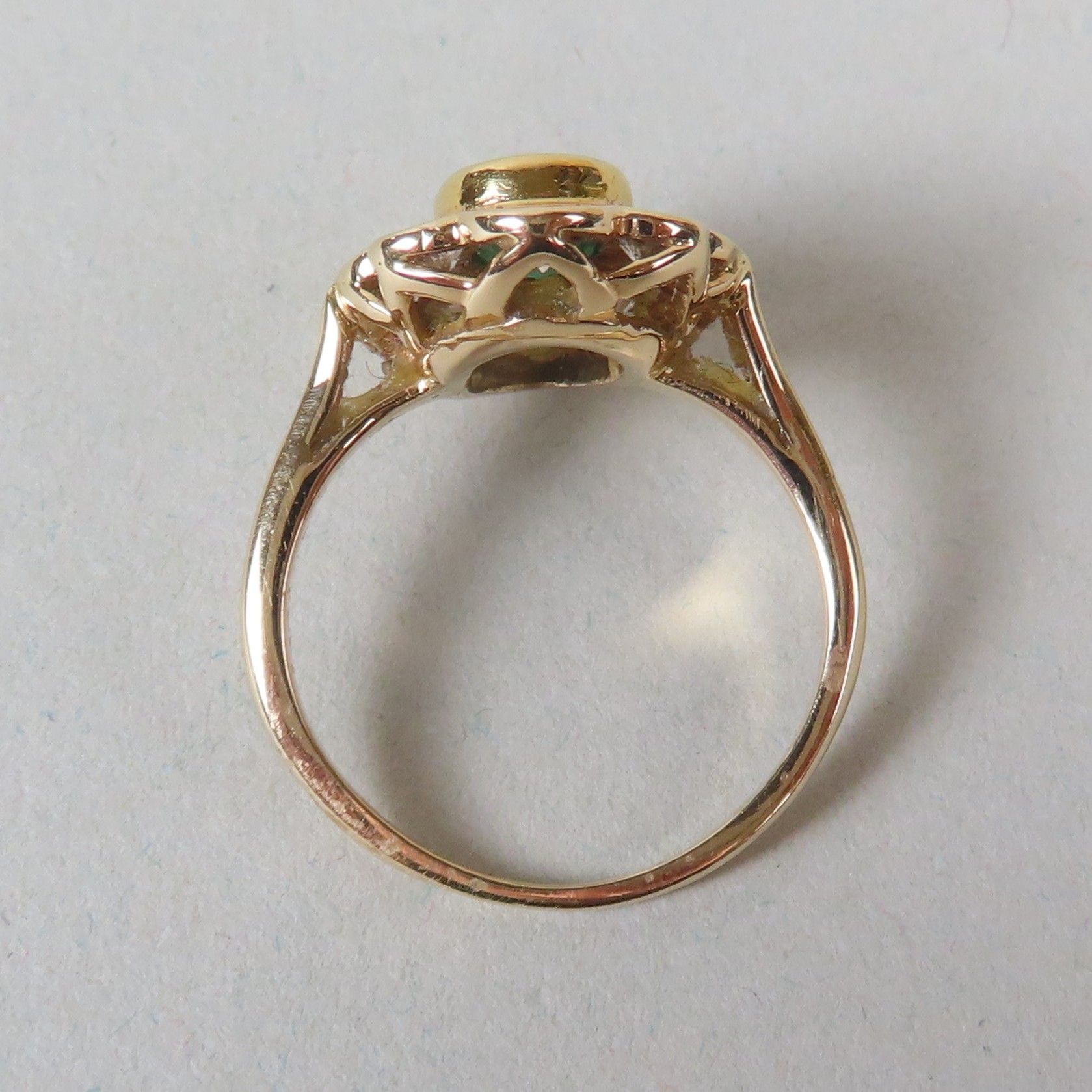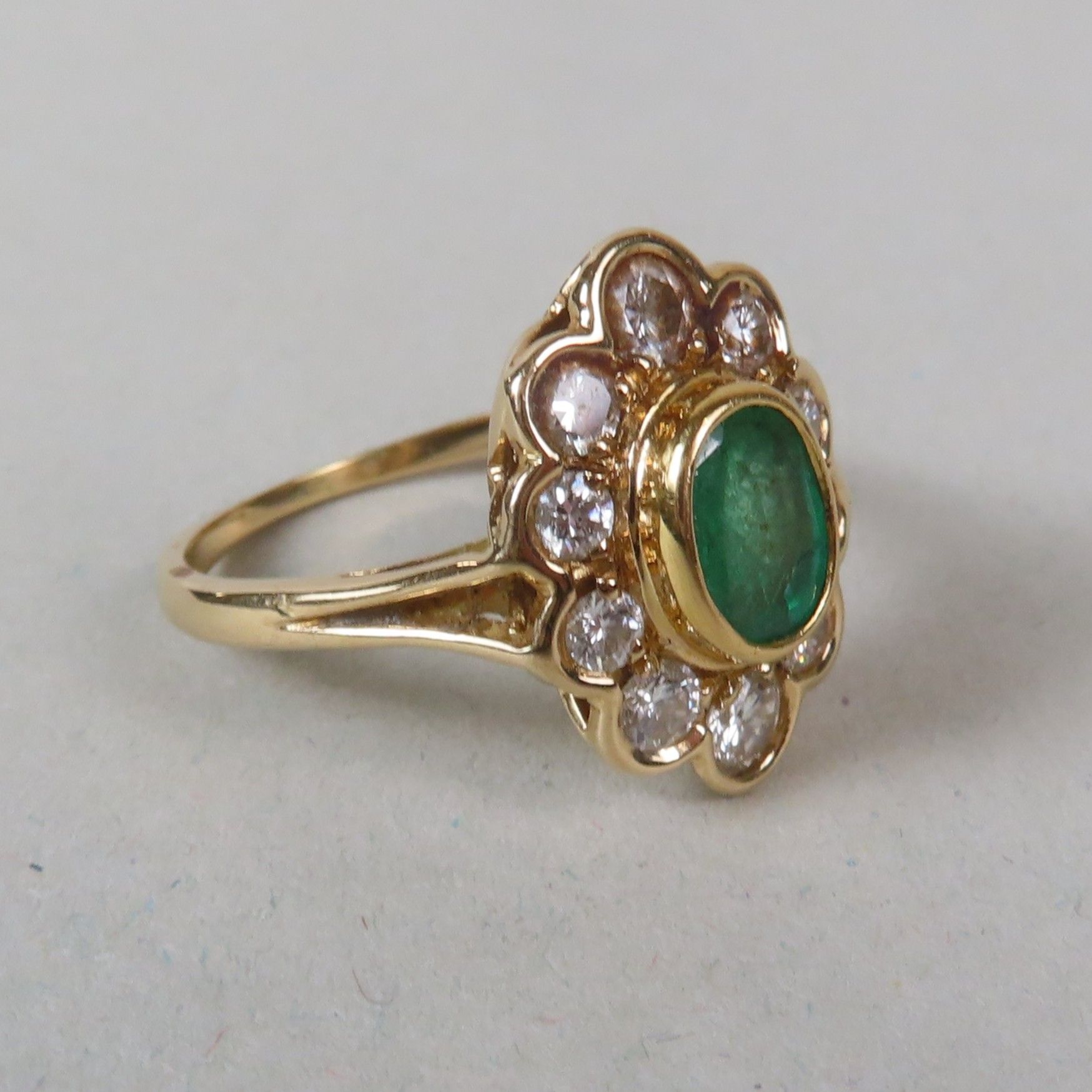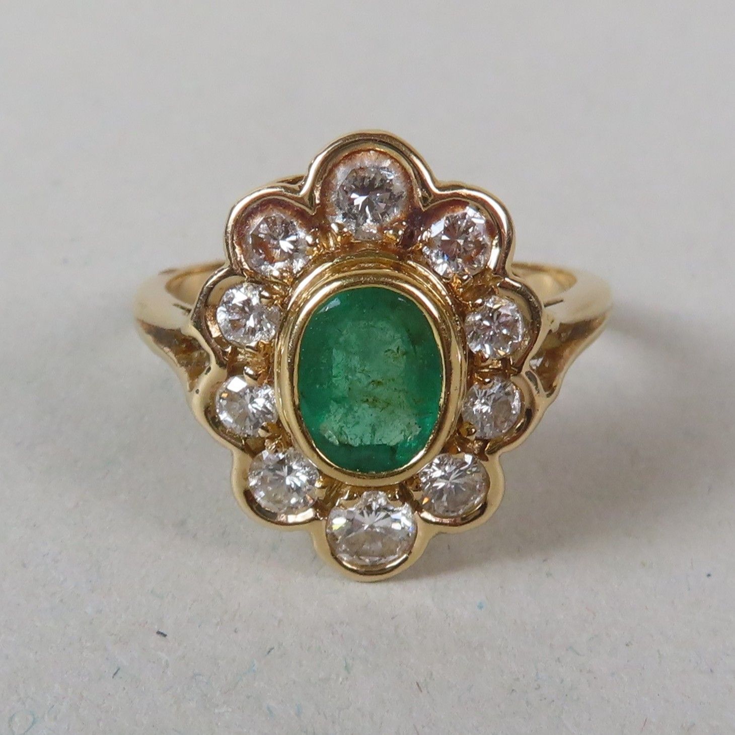 Ring in yellow gold (750/00), set with an emerald (6 x 4.5 mm) in a surround of modern-cut diamonds (the largest approx. 0.1 ct). TDD = 52. Gross weight = 4 g.