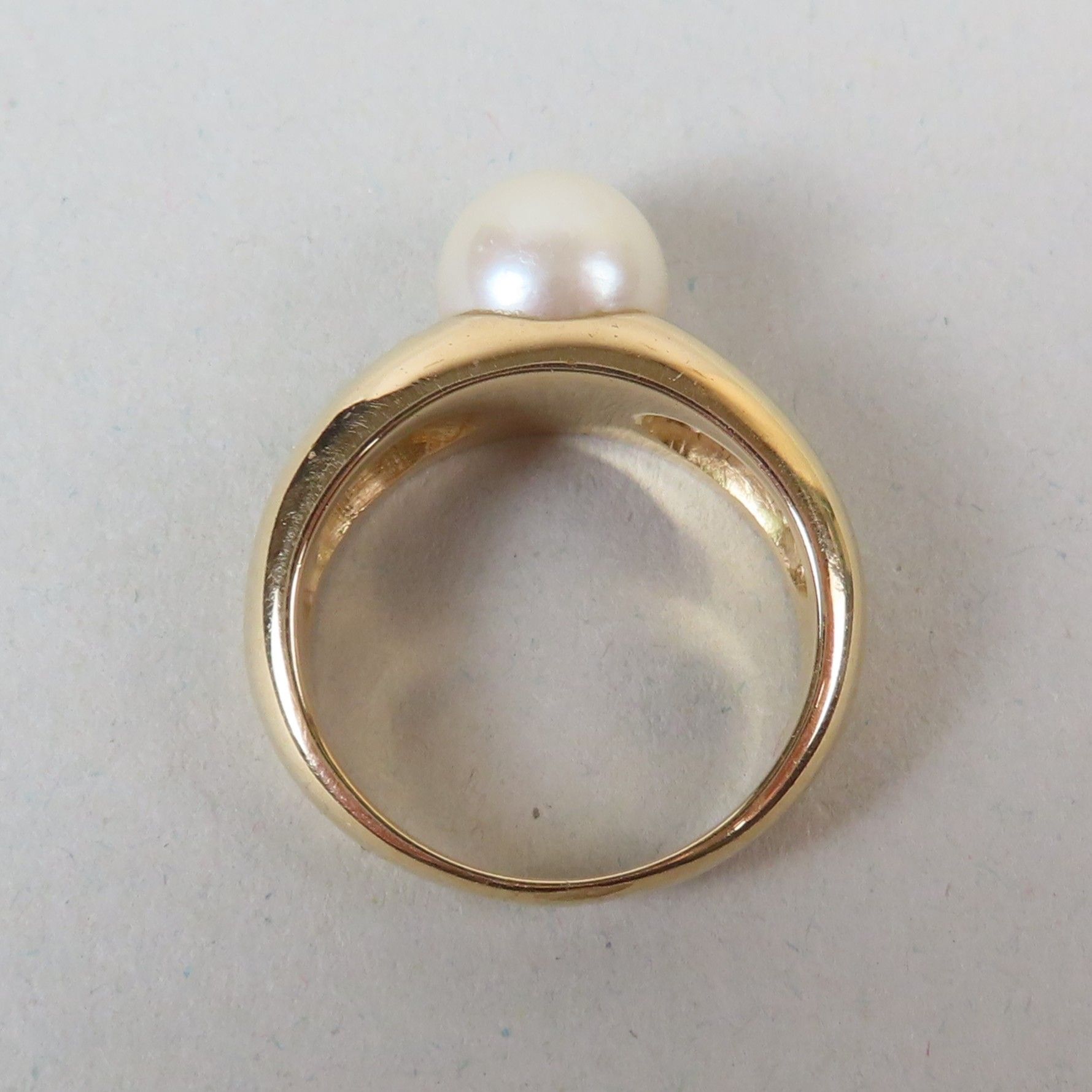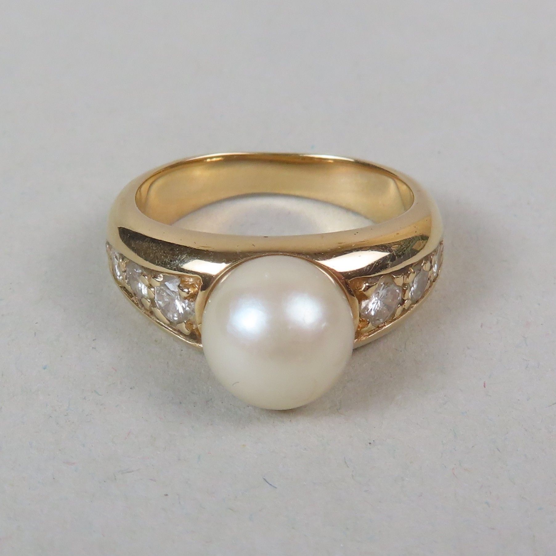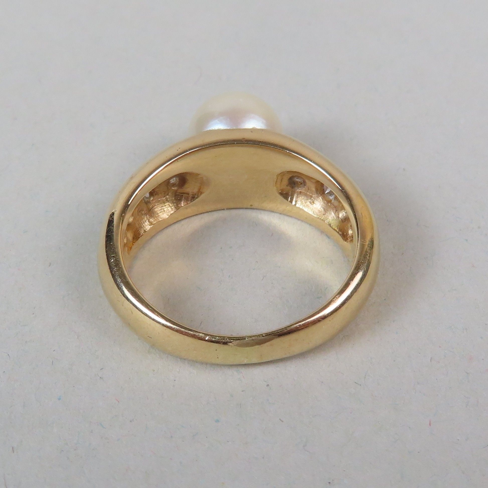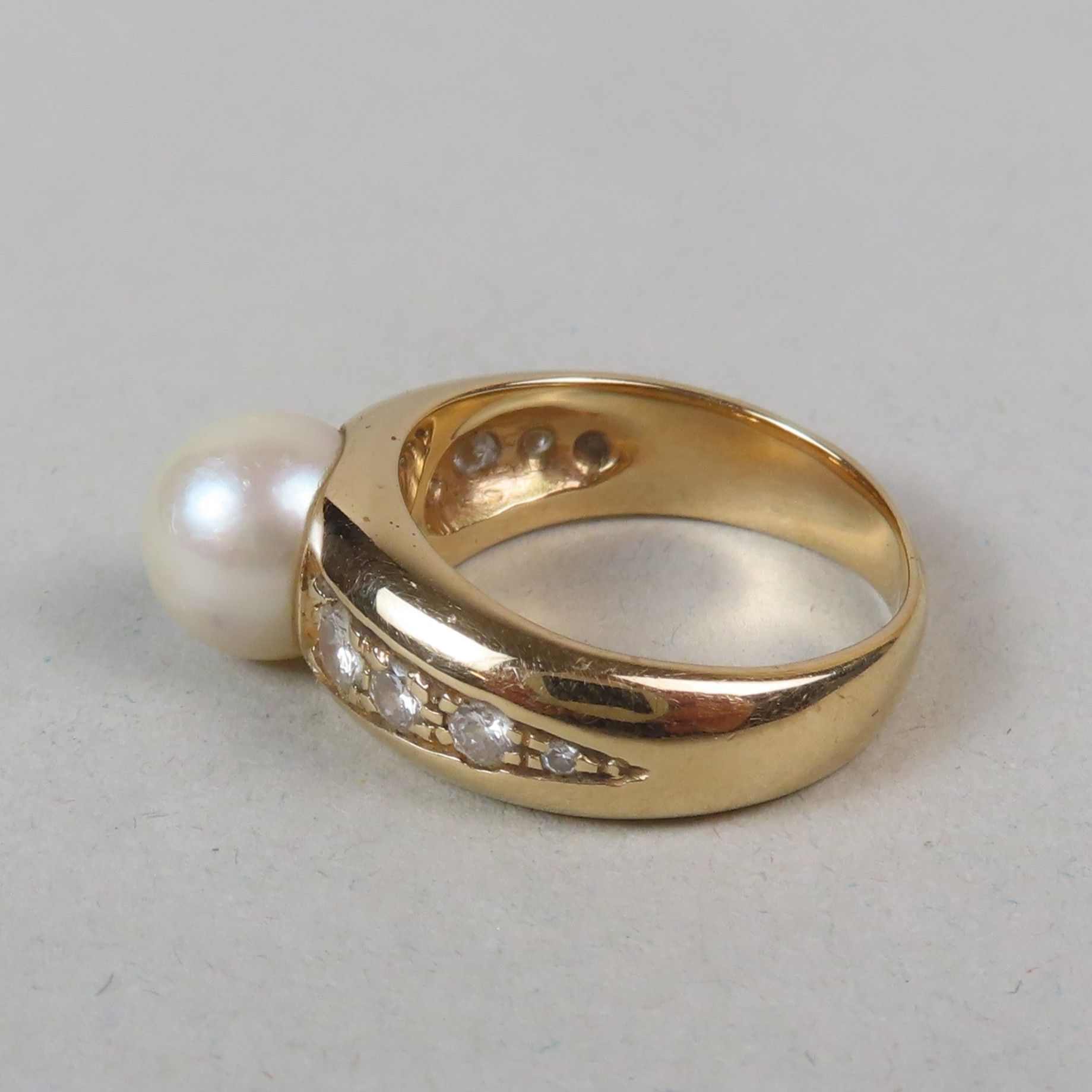 Ring in yellow gold (750/00), set with a cultured pearl with four modern-cut diamonds on either side (the larger two approx. 0.07 ct). TDD = 53/54. Gross weight = 8.4 g.