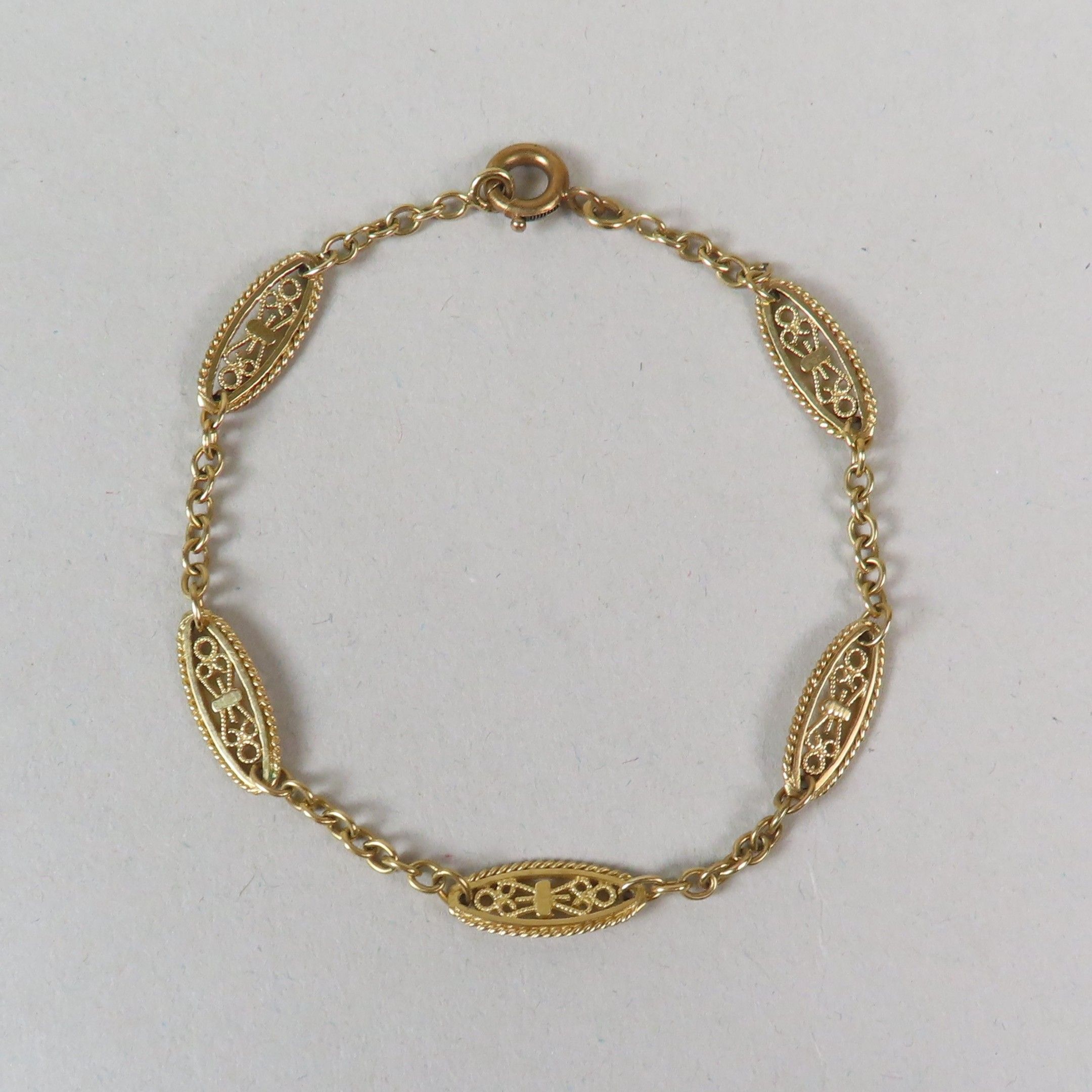 Bracelet in yellow gold (750/00) with filigree links. Length = 18.5 cm. Weight = 5 g.