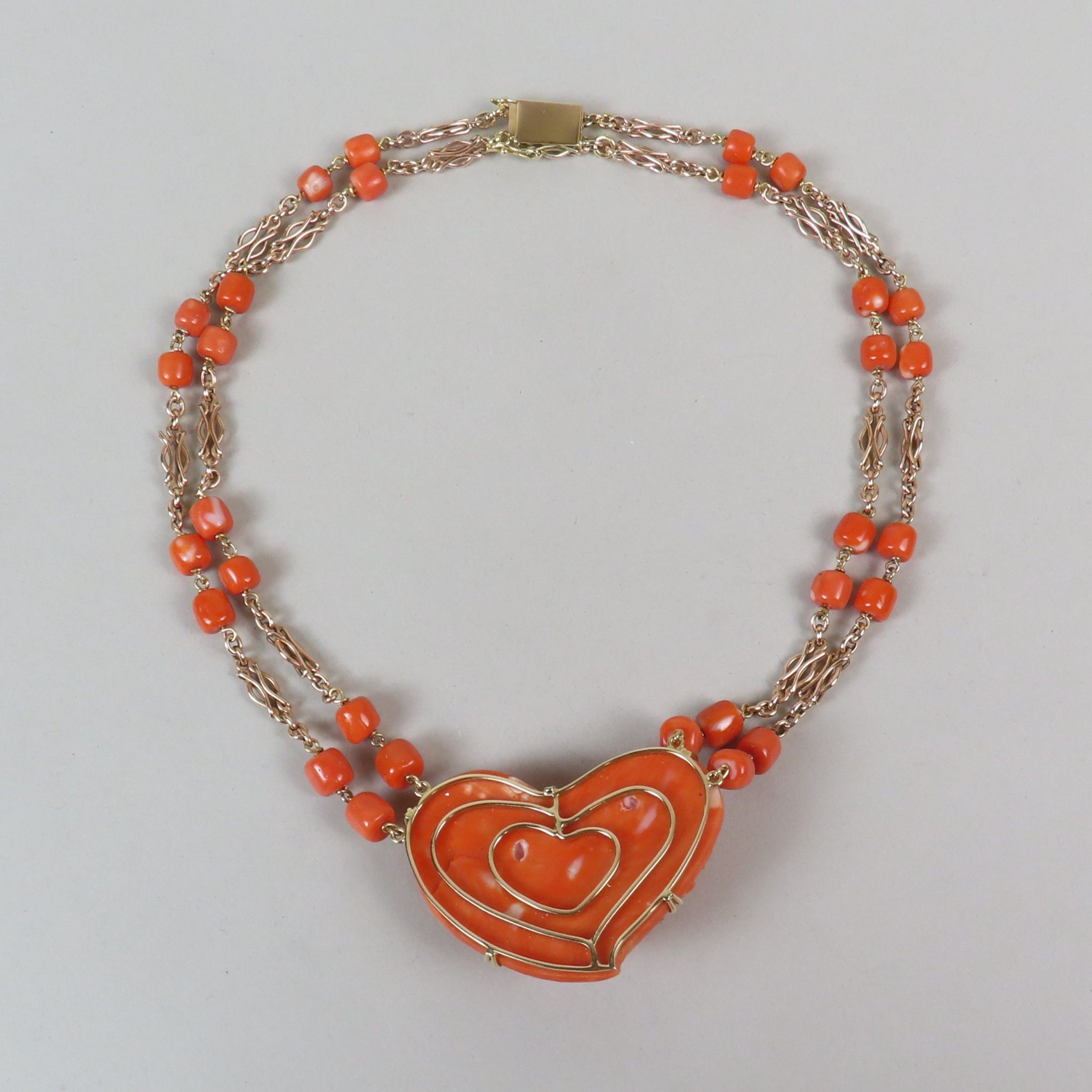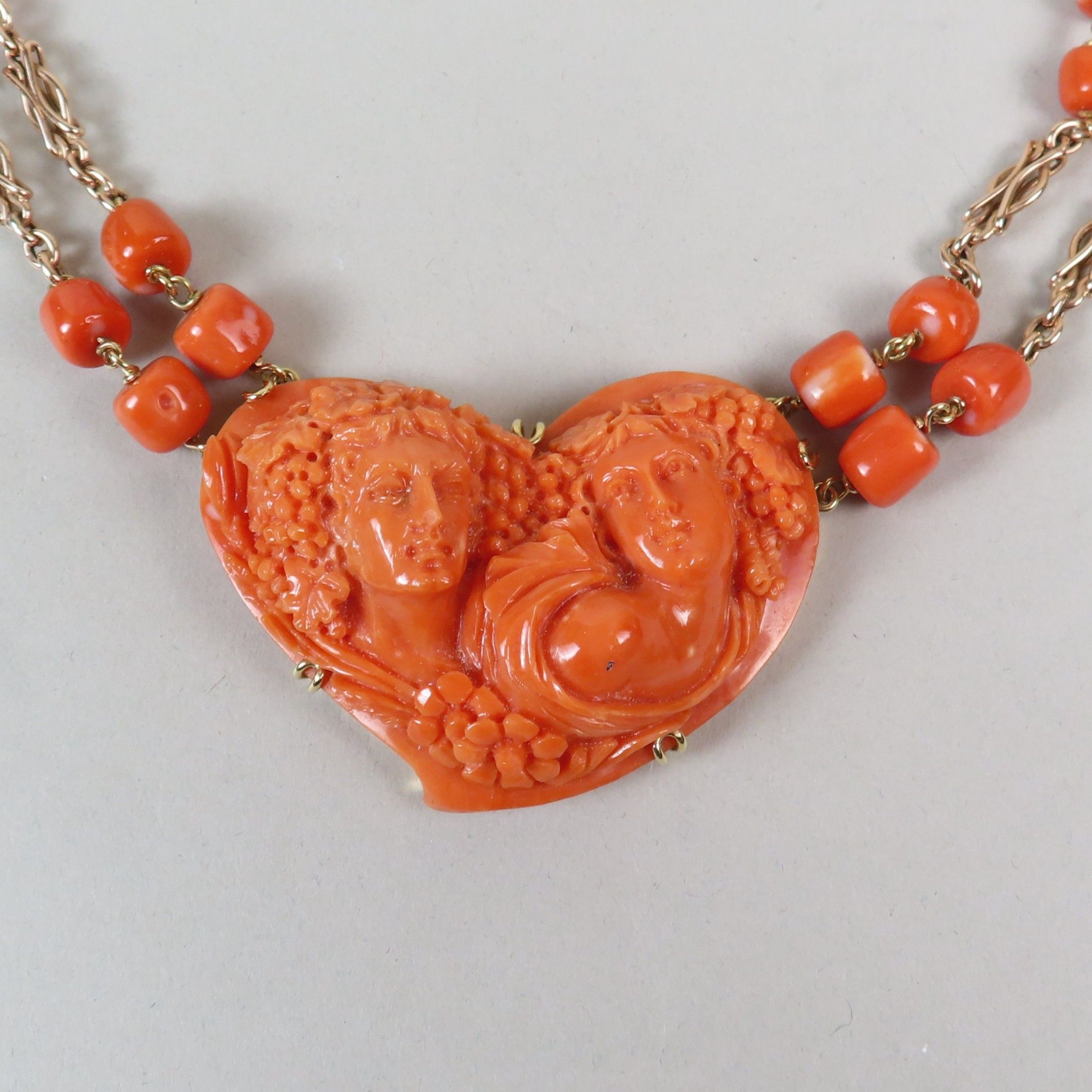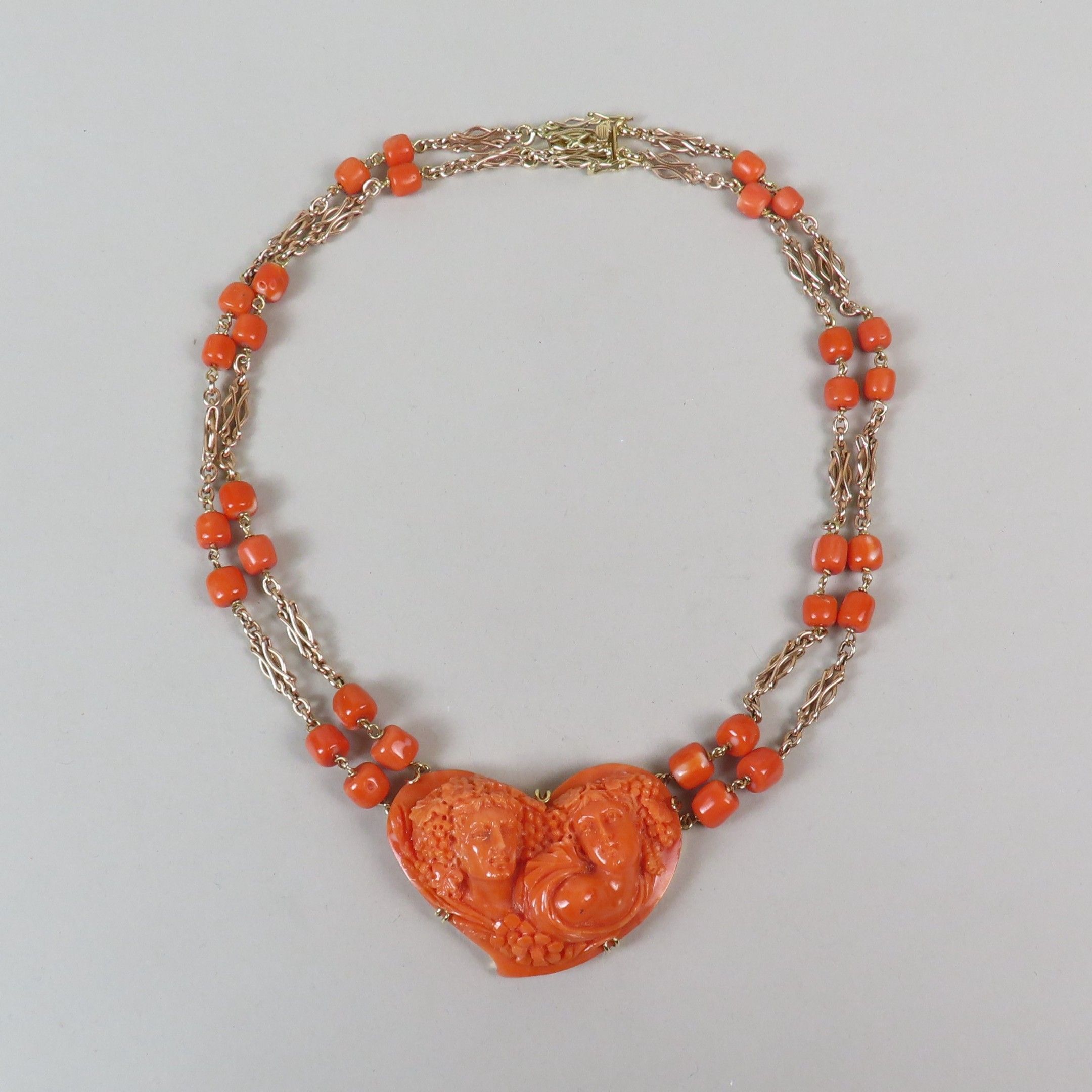 Yellow gold (585/00) and coral pearl necklace, centred on a cordial ornament, also in coral, with carved decoration of the heads of Bacchus and a bacchante. Length = 46 cm. Gross weight = 97.6 g. (a small amount of material missing from the edge of the heart)