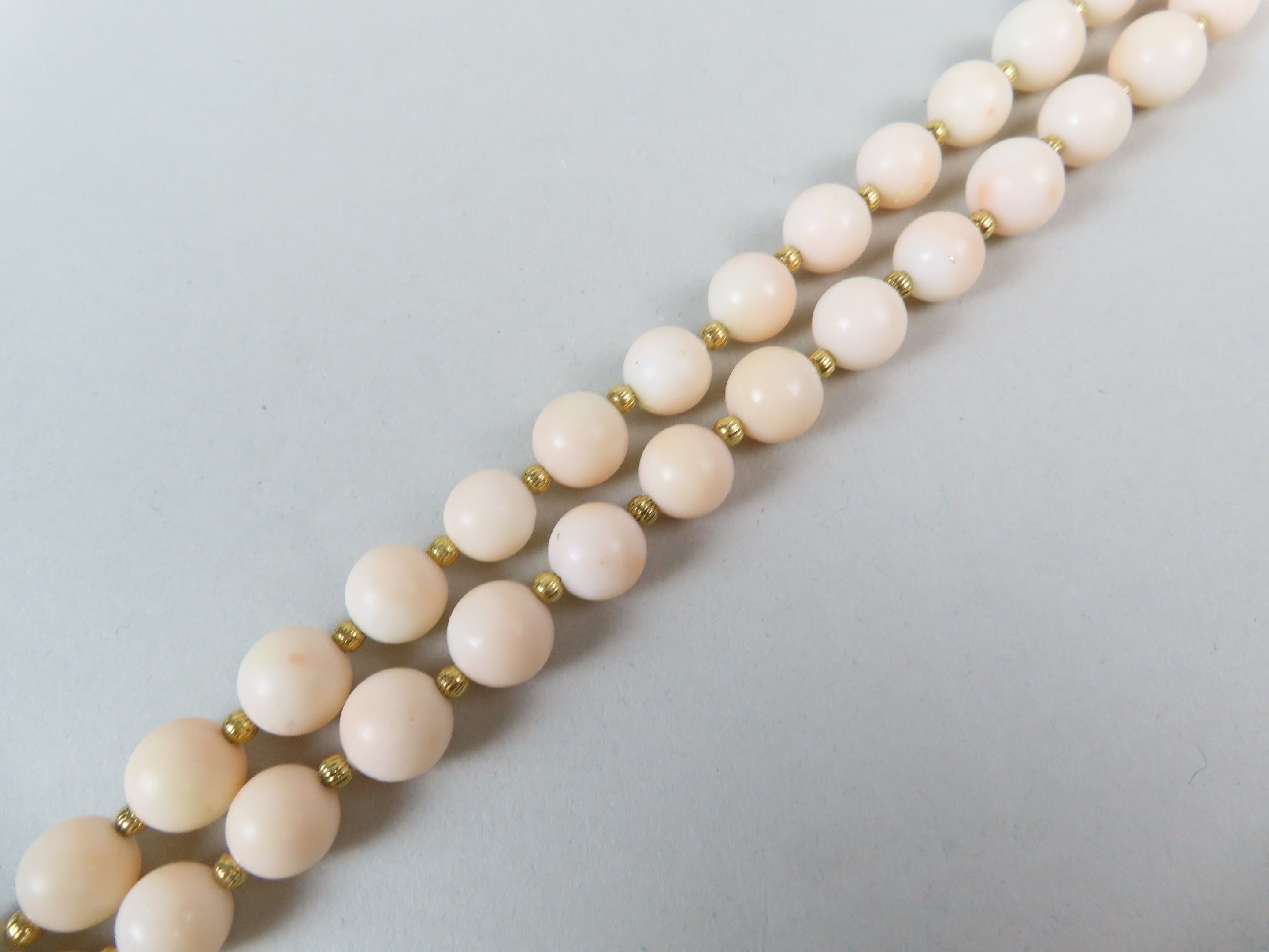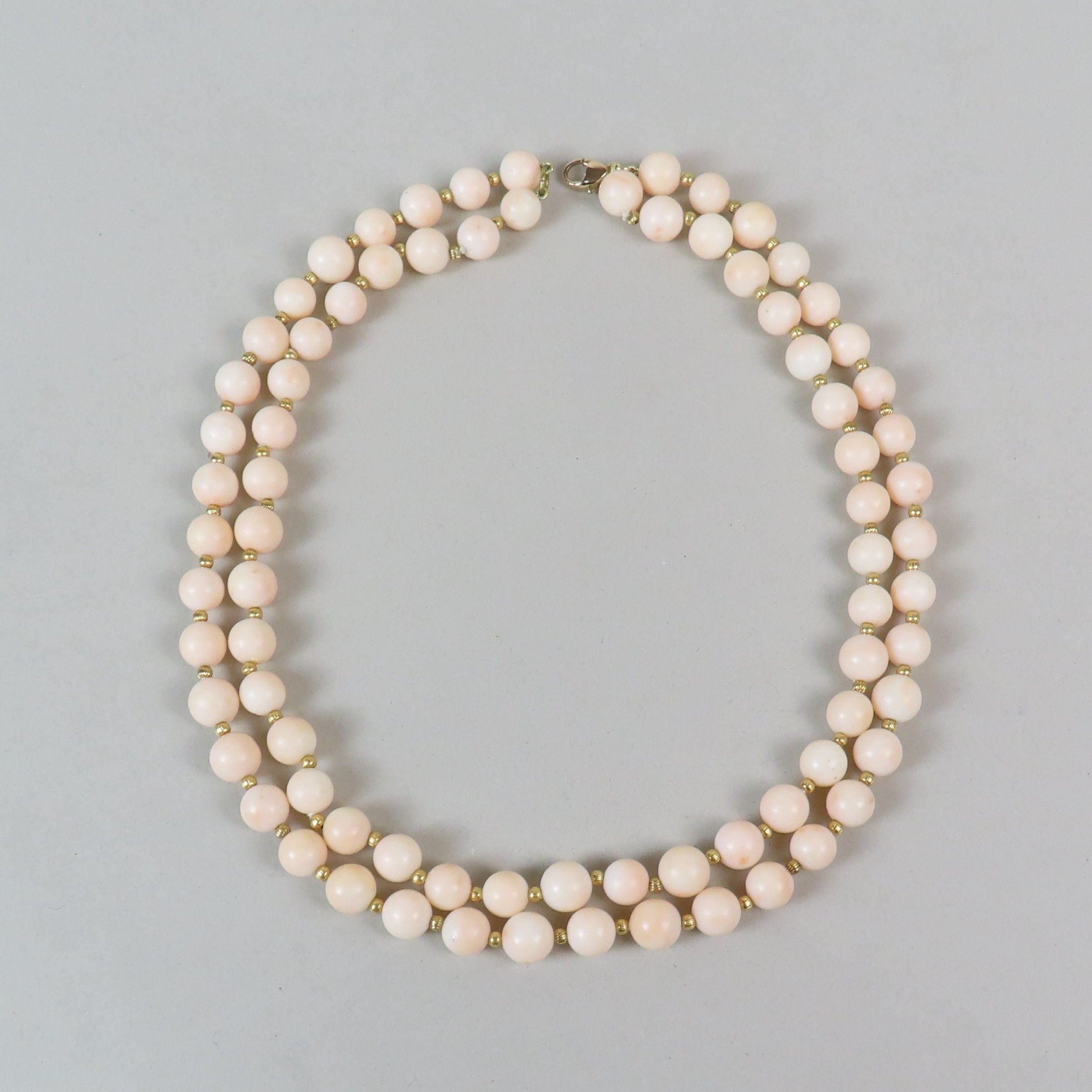 Pink coral pearl necklace (Diam. = 9 - 9.5 mm); gilt metal clasp. Length = 46 cm.