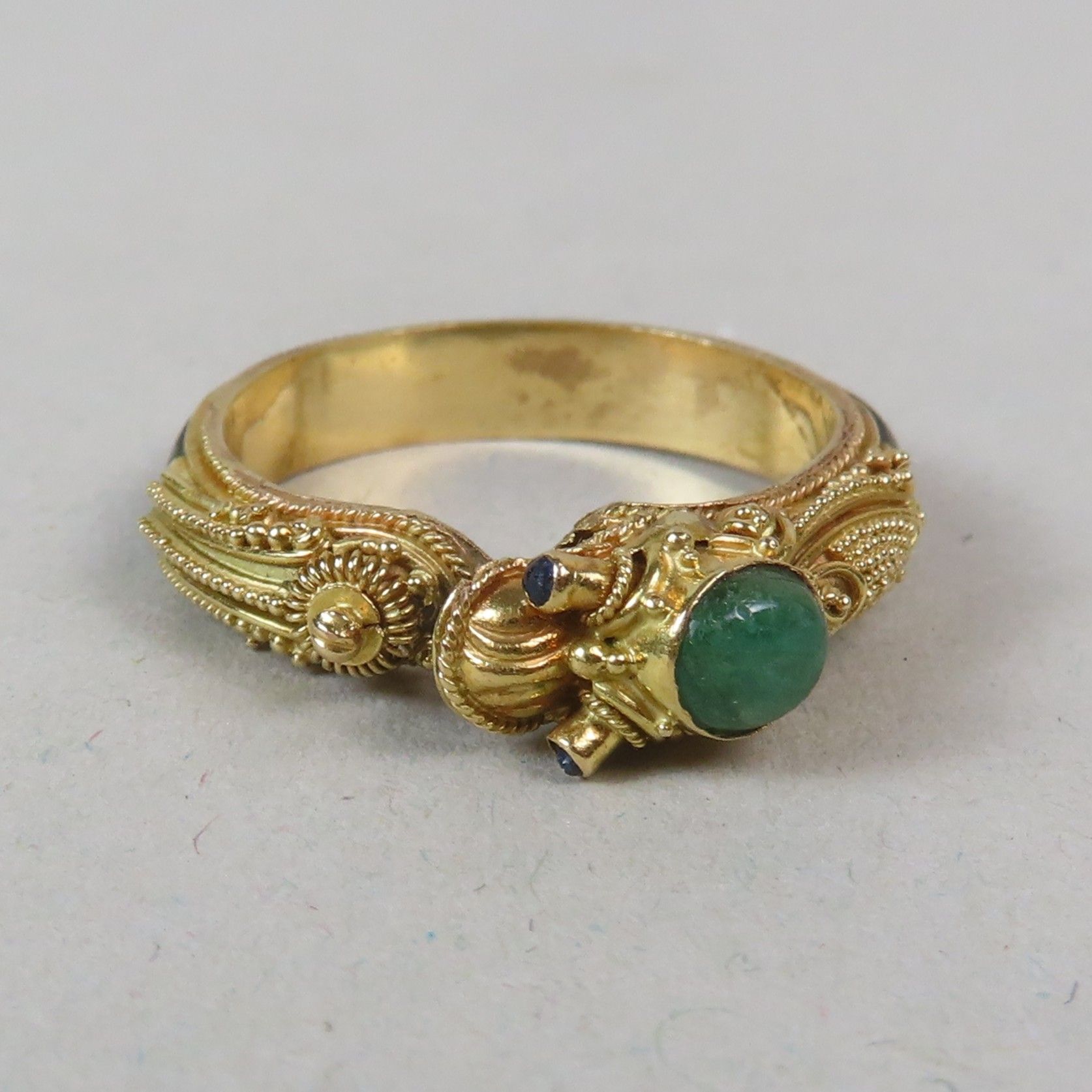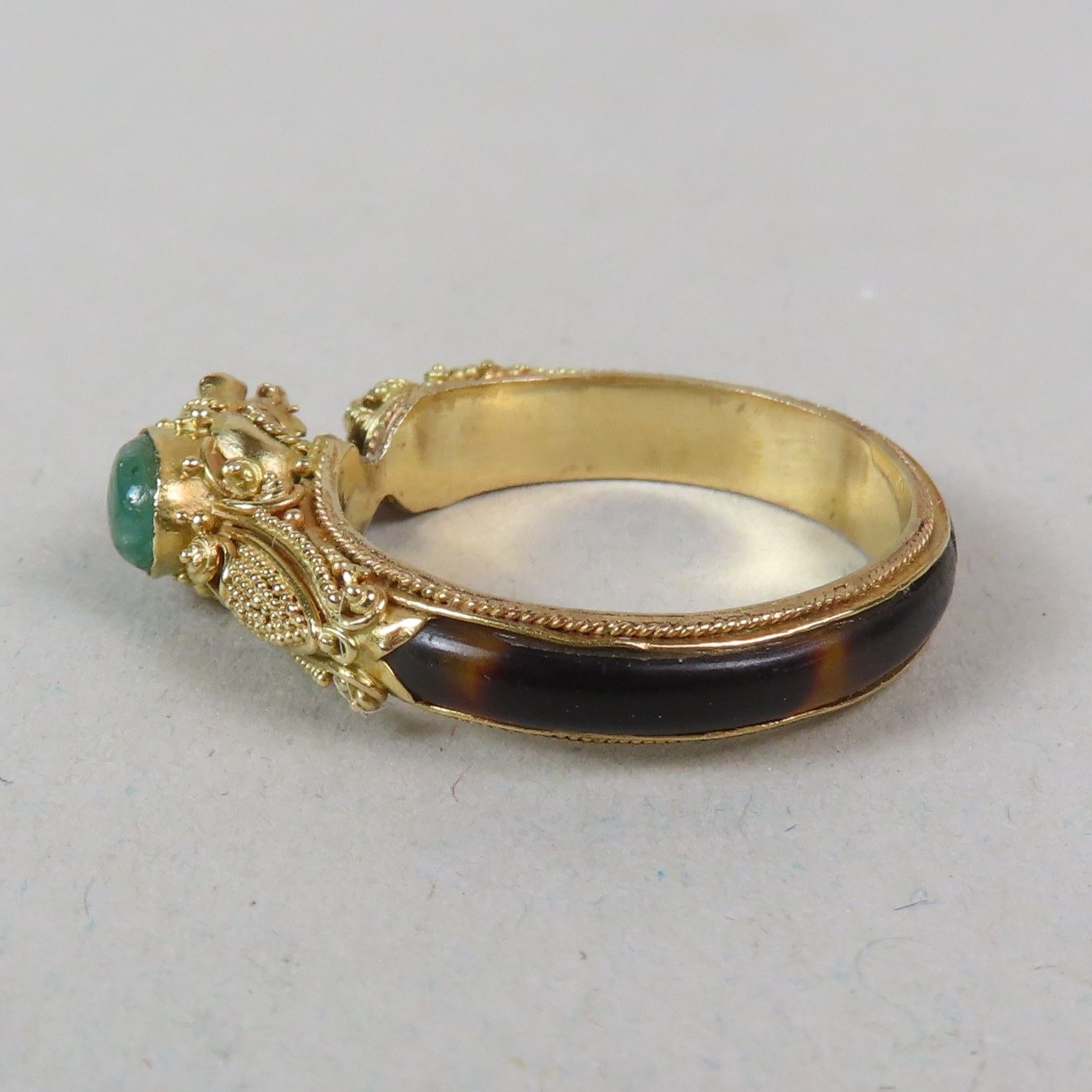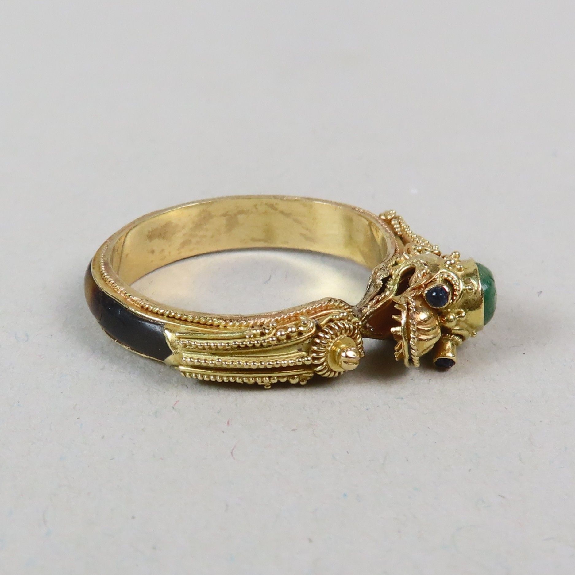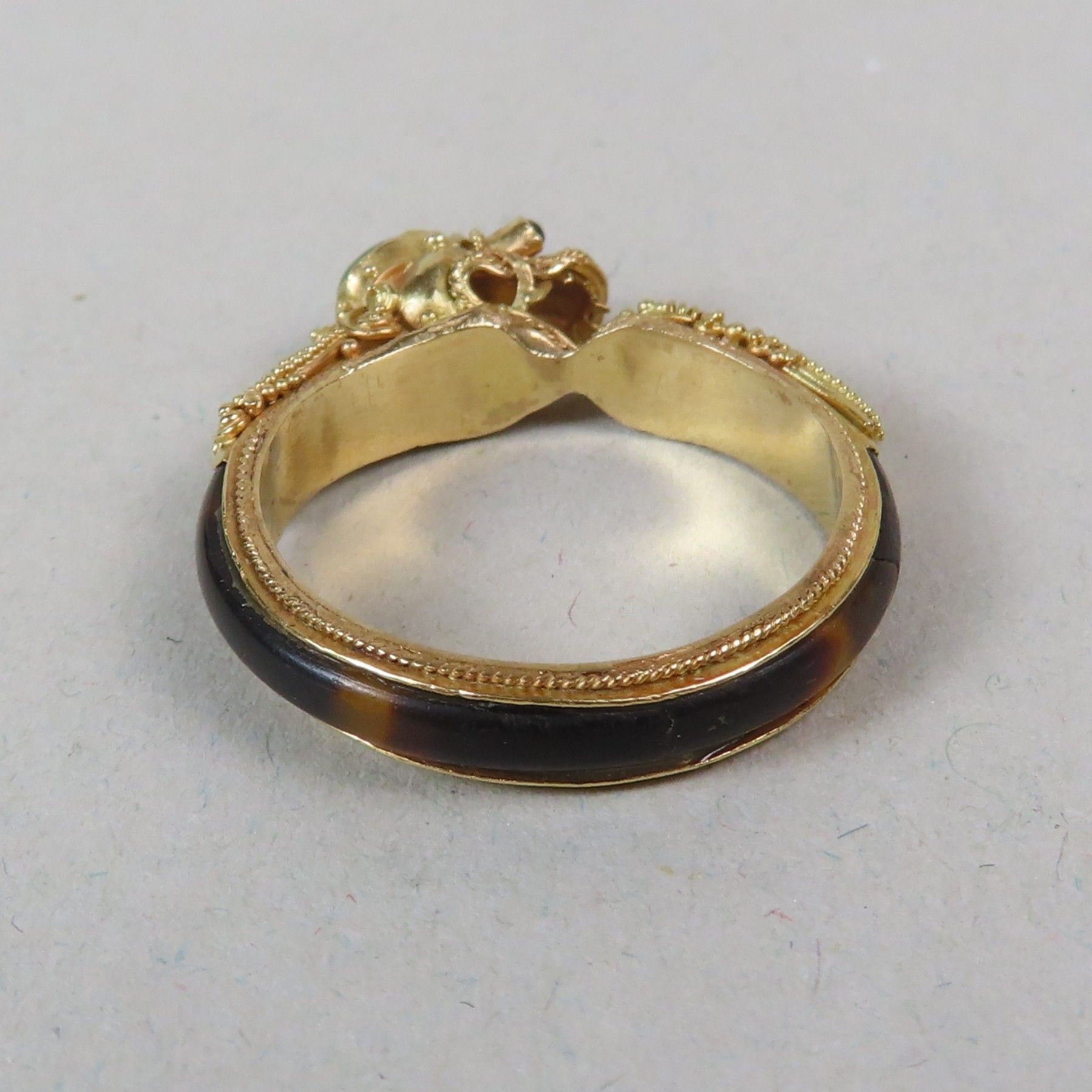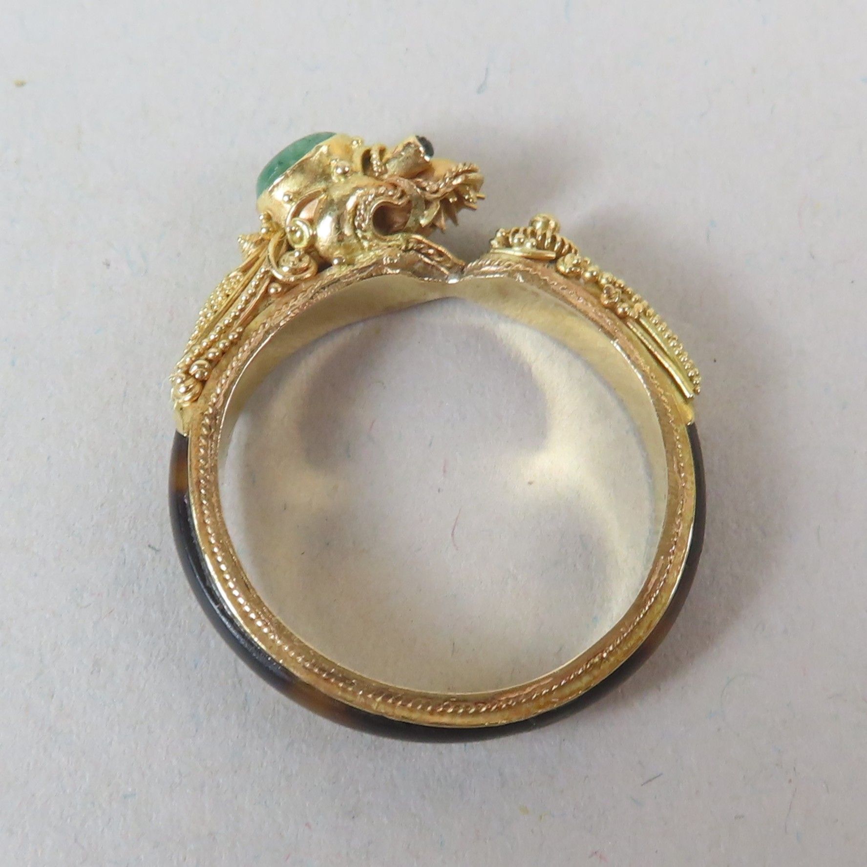 Ring in yellow gold (750/00) and tortoiseshell, decorated with a dragon's head set with three small coloured stones. TDD = 55/56. Gross weight = 3.4 g.