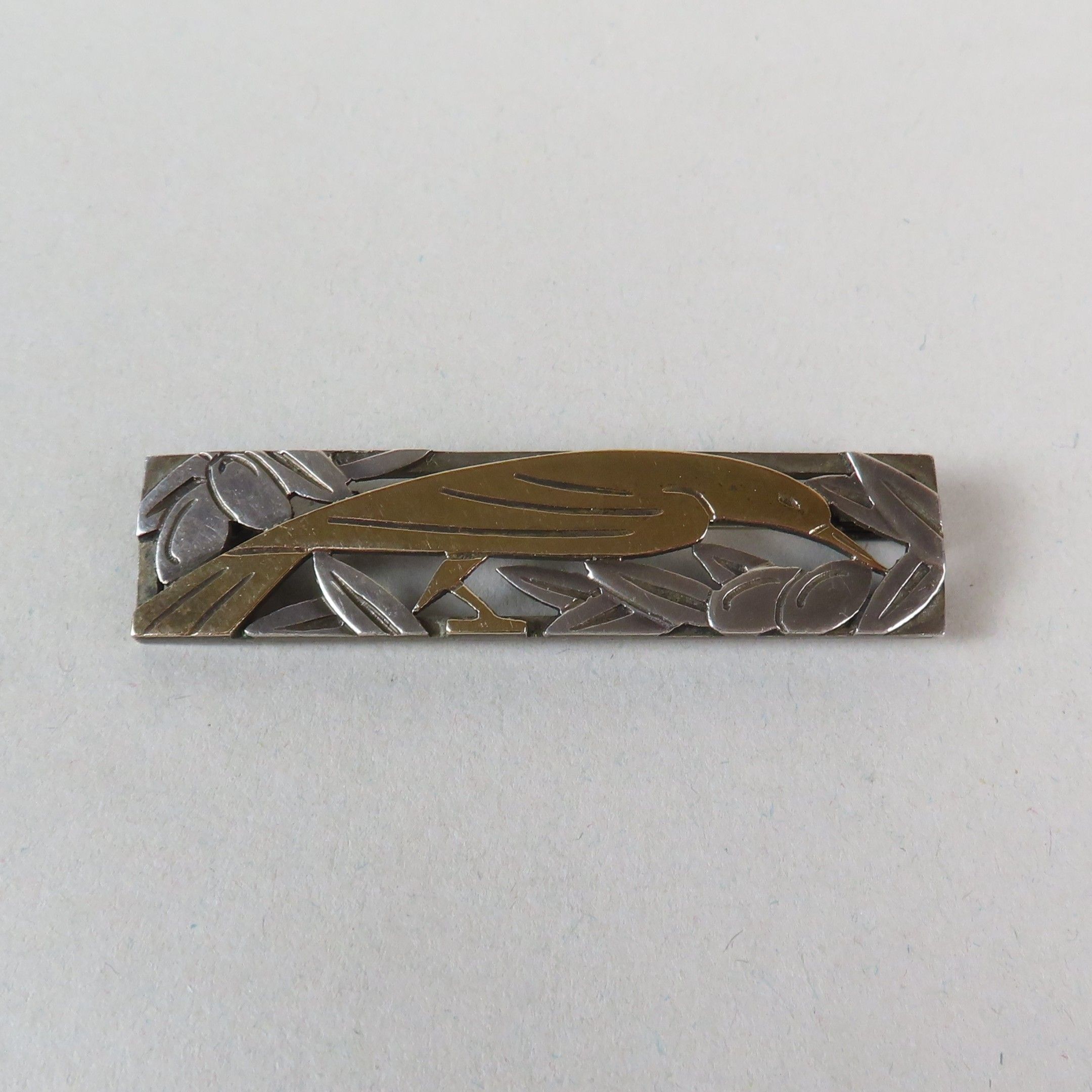 Jules DEON (1880-1956), Nancy, attributed to. Silver and yellow gold (585/00) brooch decorated with a bird. Art Deco period. Length = 51 mm. Weight = 7.2 g.