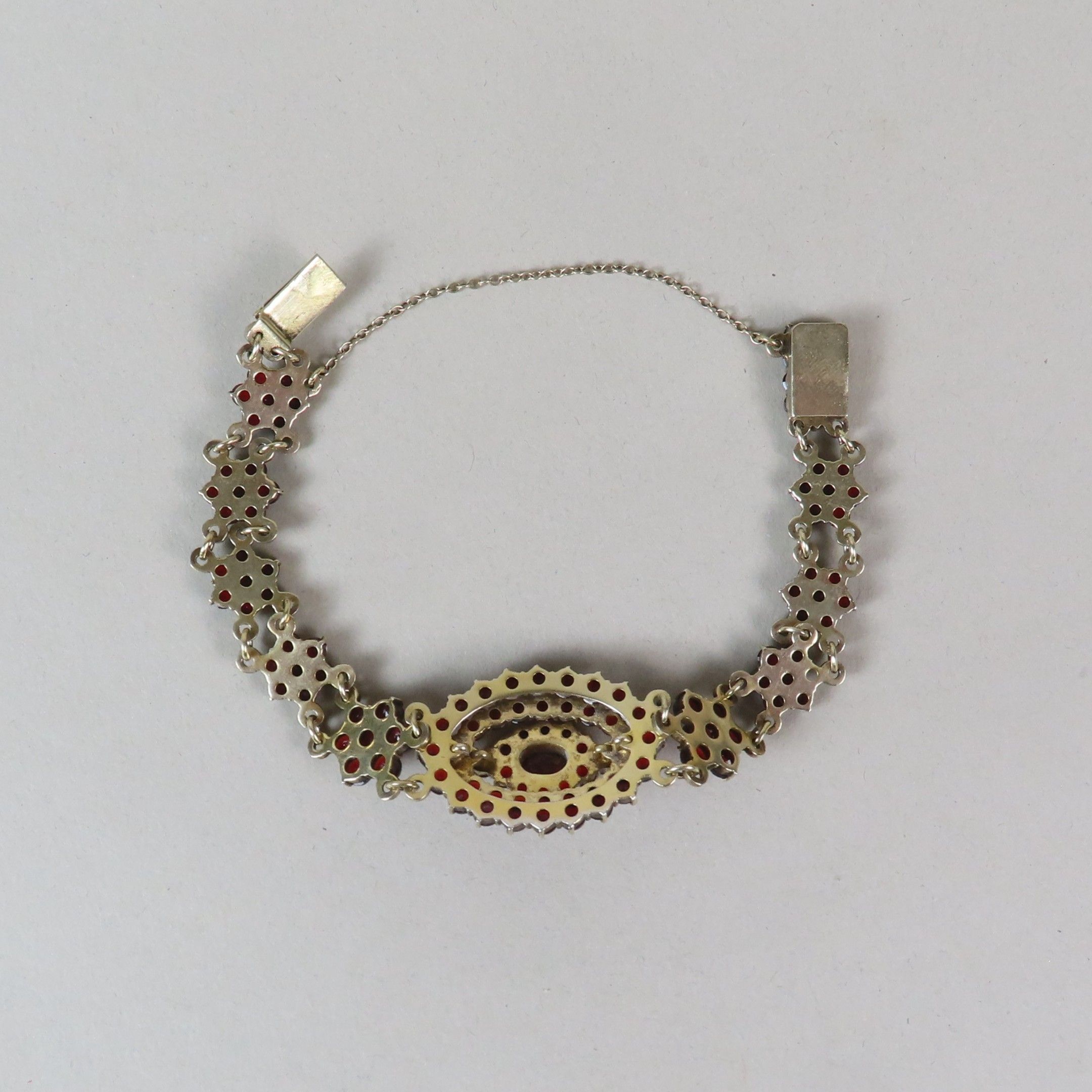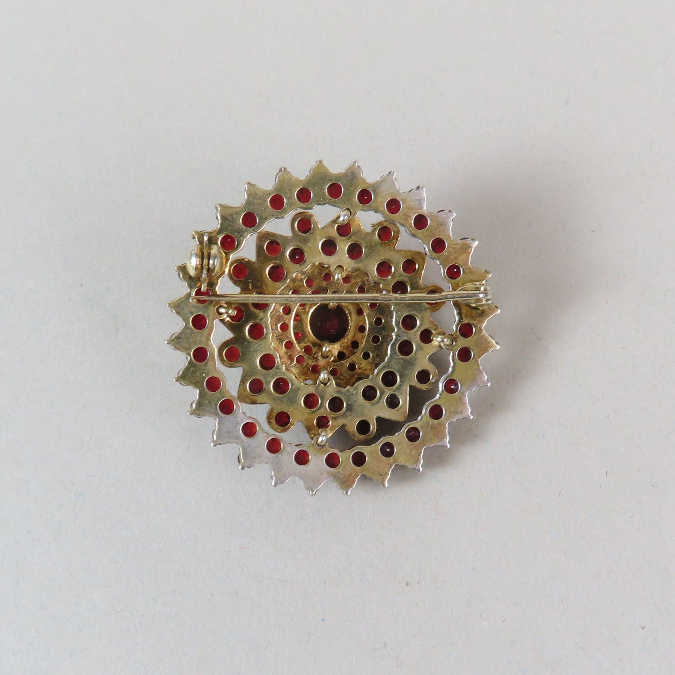 Set in silver gilt (900/00) and garnets, comprising a necklace (Length = 41 cm), a bracelet and a brooch (Diam. = 39 mm). Late 19th century. Gross weight = 55.1 g. (with two additional links)