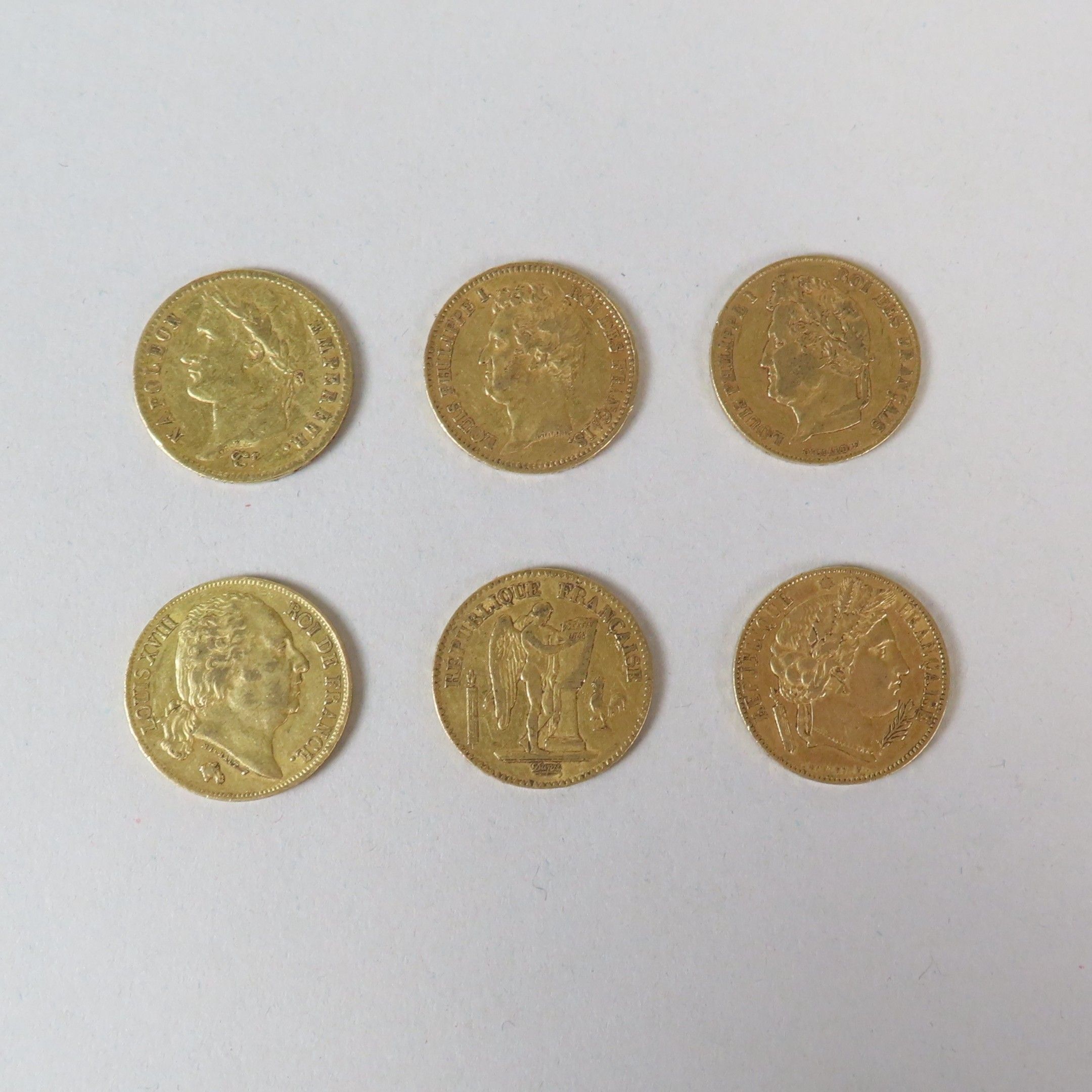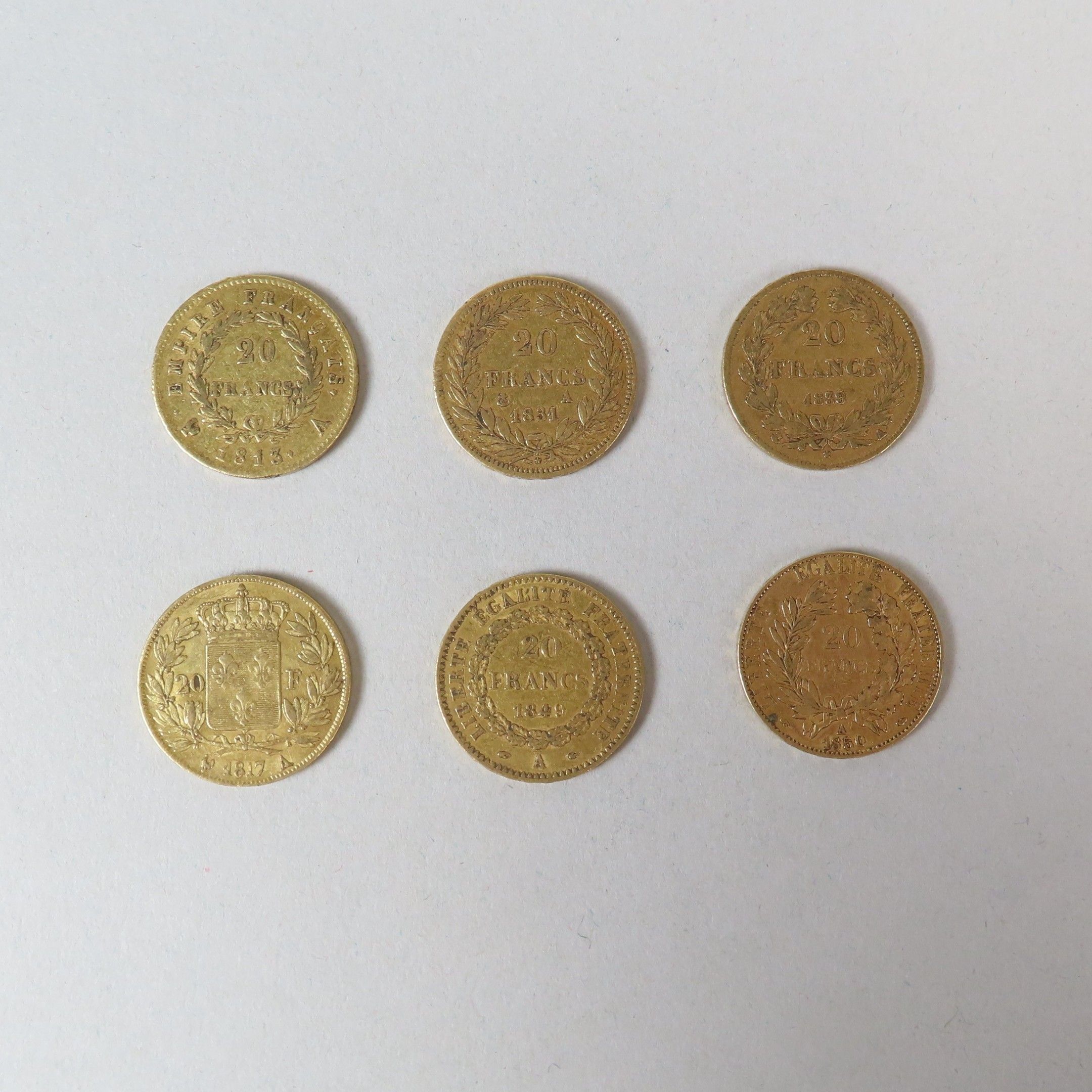 Six 20 F gold coins France : 1 x 20 F "Napoléon Ier" + 1 x 20 F "Louis XVIII" + 2 x 20 F "Louis Philippe" + 1 x 20 F "Génie" + 1 x 20 F "Cérès". (wear)