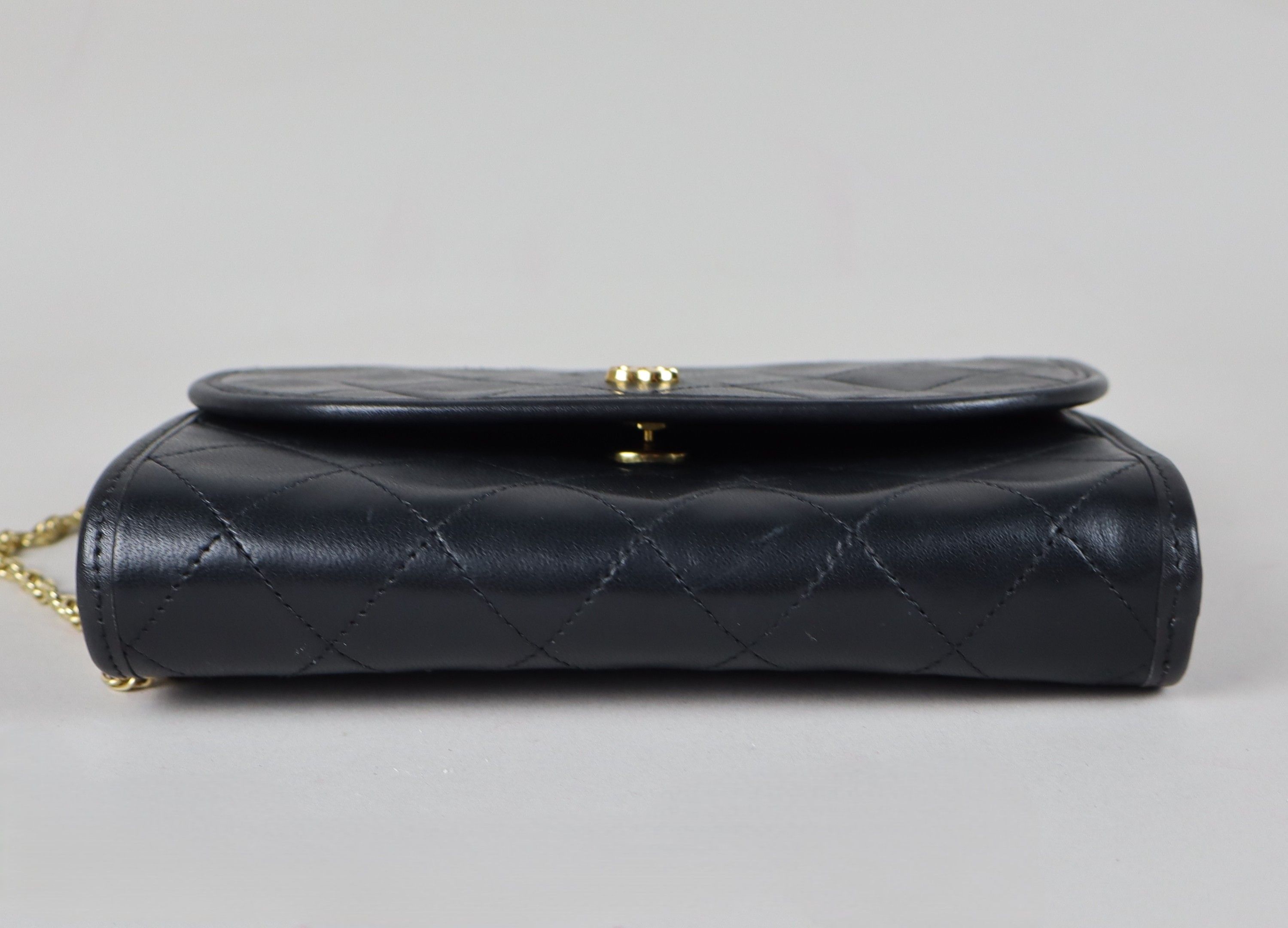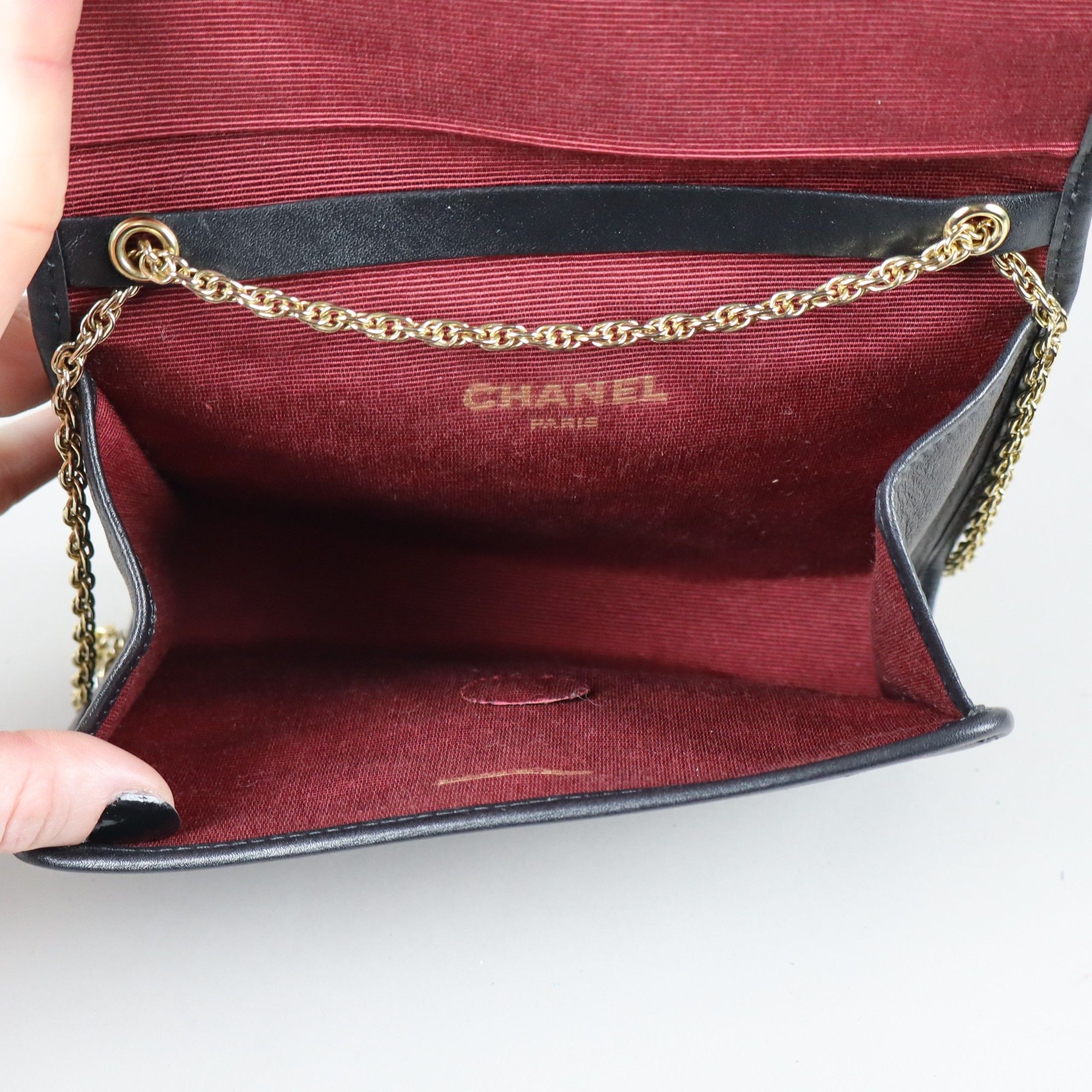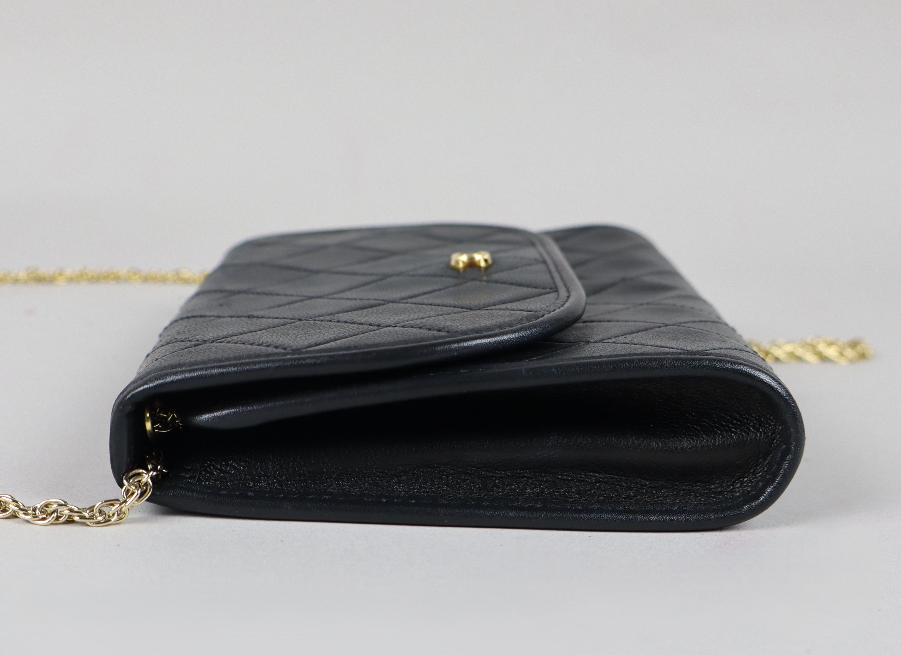 CHANEL. WOC" shoulder bag in quilted black leather; gold-tone metal chain for carrying over the shoulder; gold-tone metal clasp with brand name; burgundy fabric interior. Signed. 13 x 17 cm (slight wear)