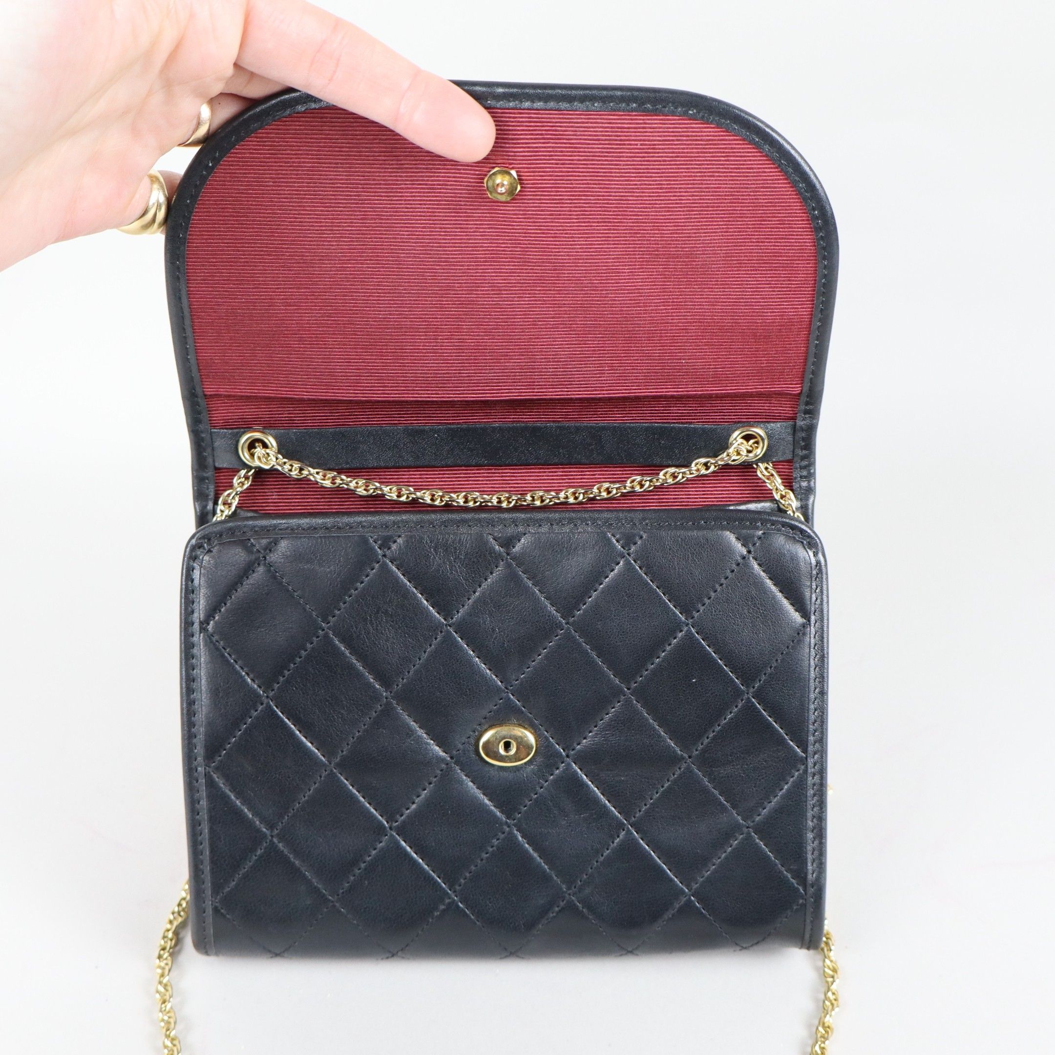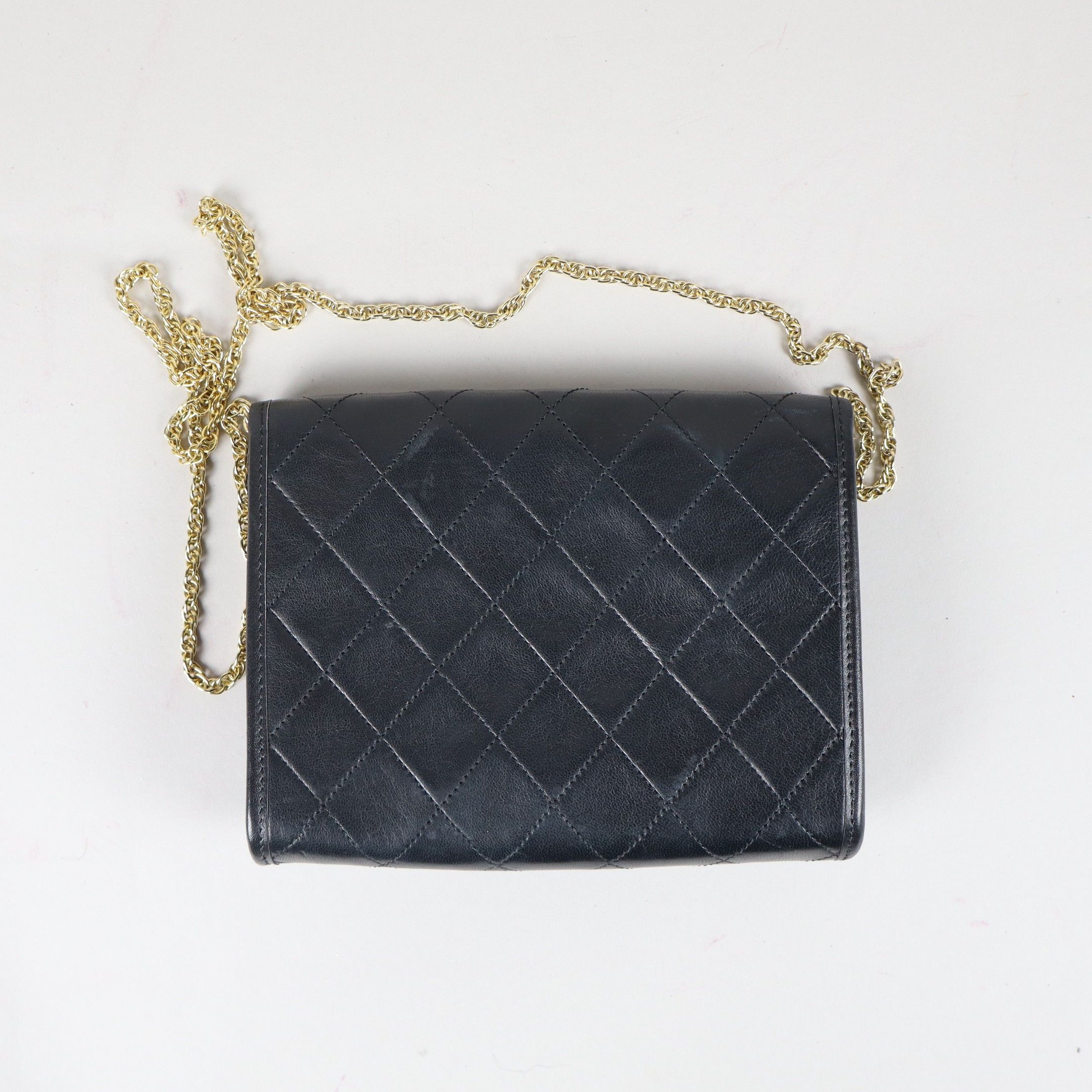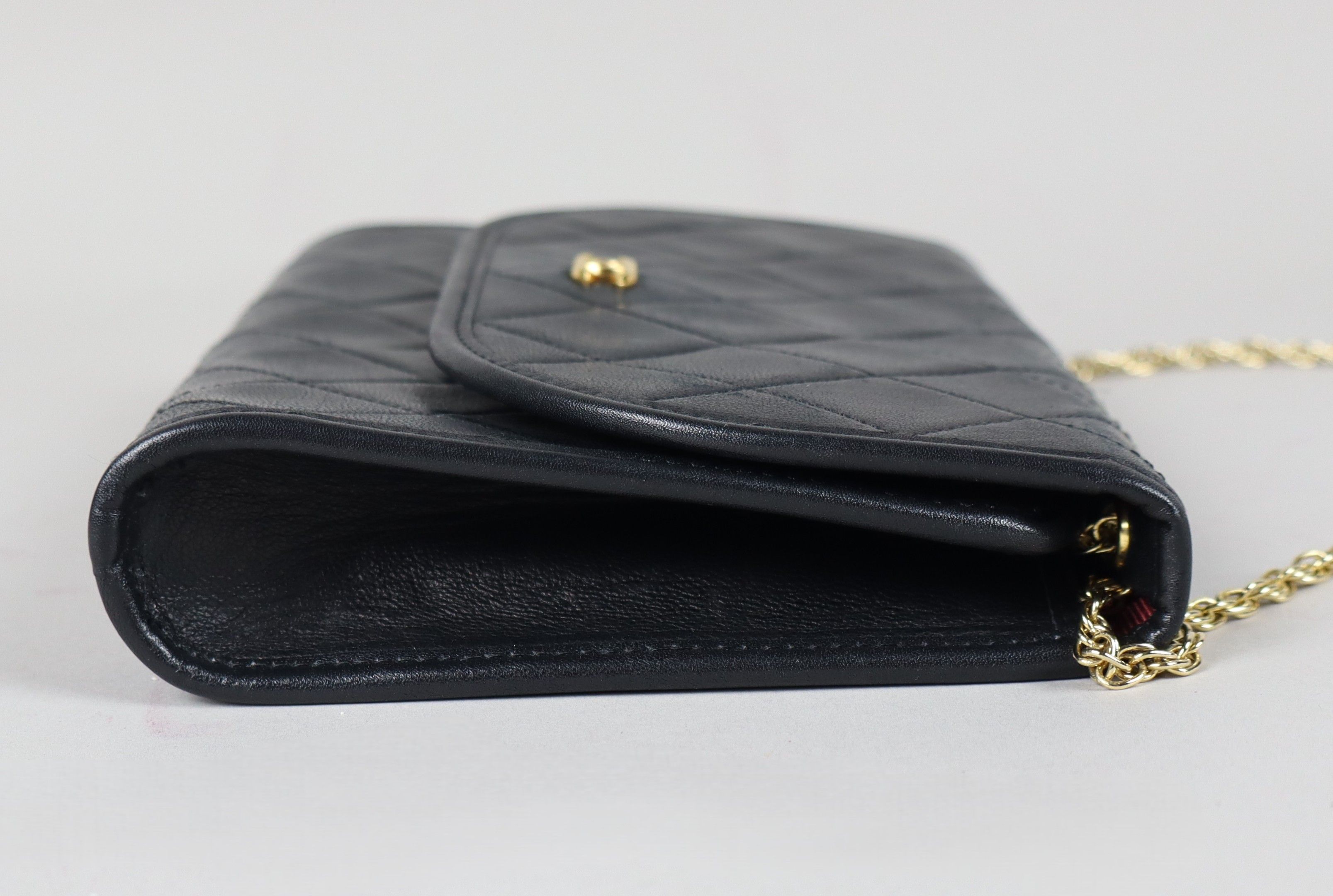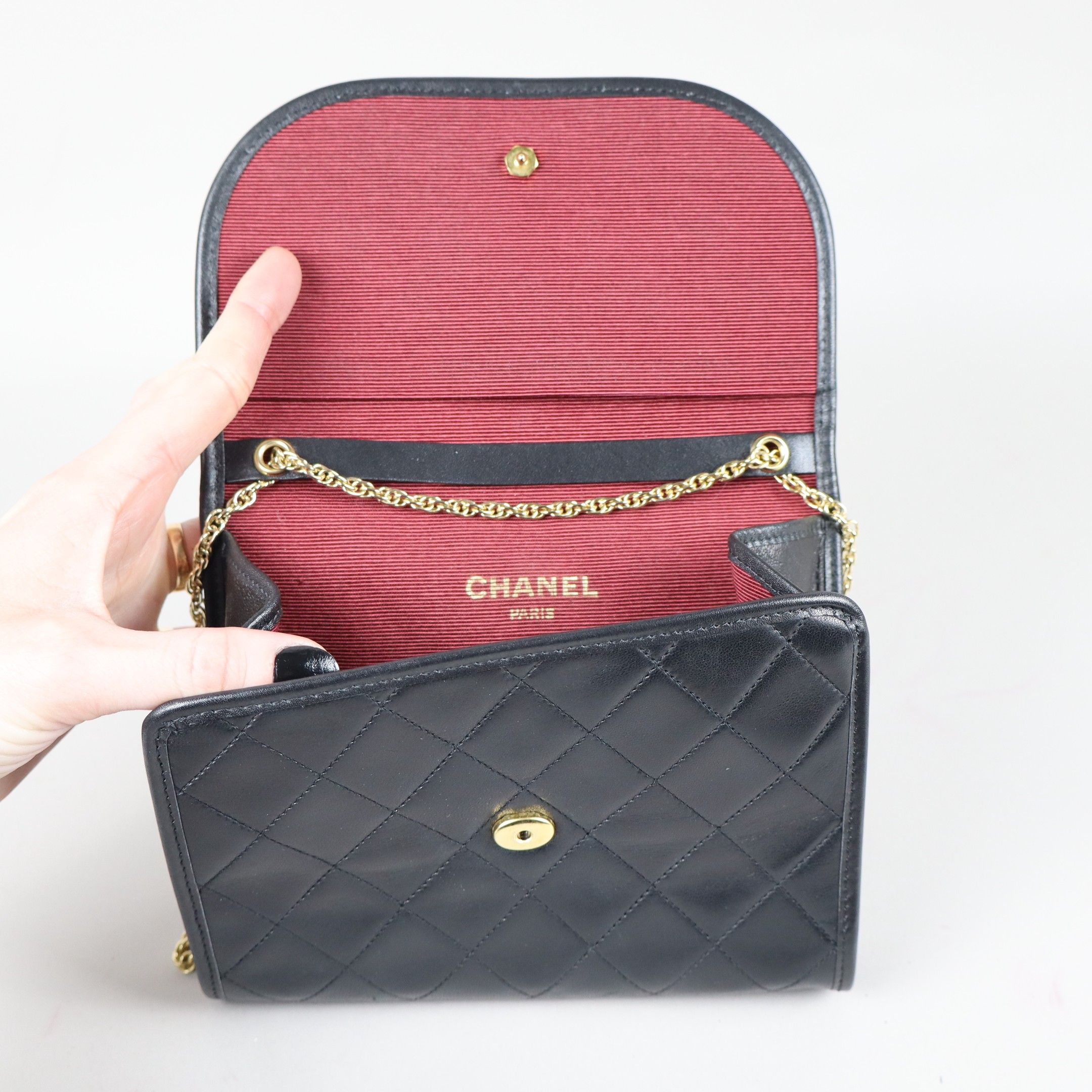 CHANEL. WOC" shoulder bag in quilted black leather; gold-tone metal chain for carrying over the shoulder; gold-tone metal clasp with brand name; burgundy fabric interior. Signed. 13 x 17 cm (slight wear)