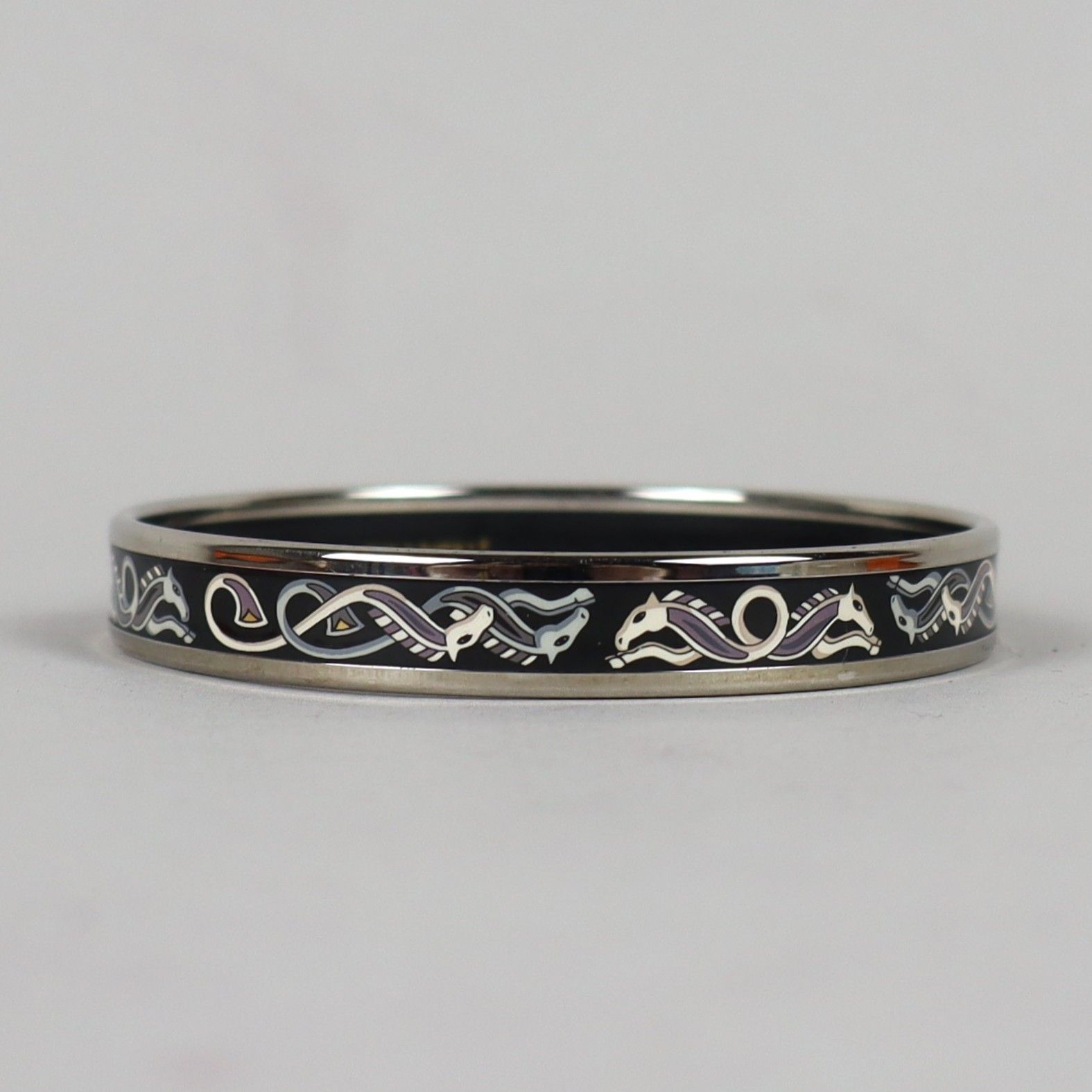 HERMES, Paris. Bracelet in silver-plated and enamelled metal, decorated with stylised horses on a black background. Signed. With box. Inside diameter = 62 mm; thickness = 9.5 mm (micro-scratches from use).