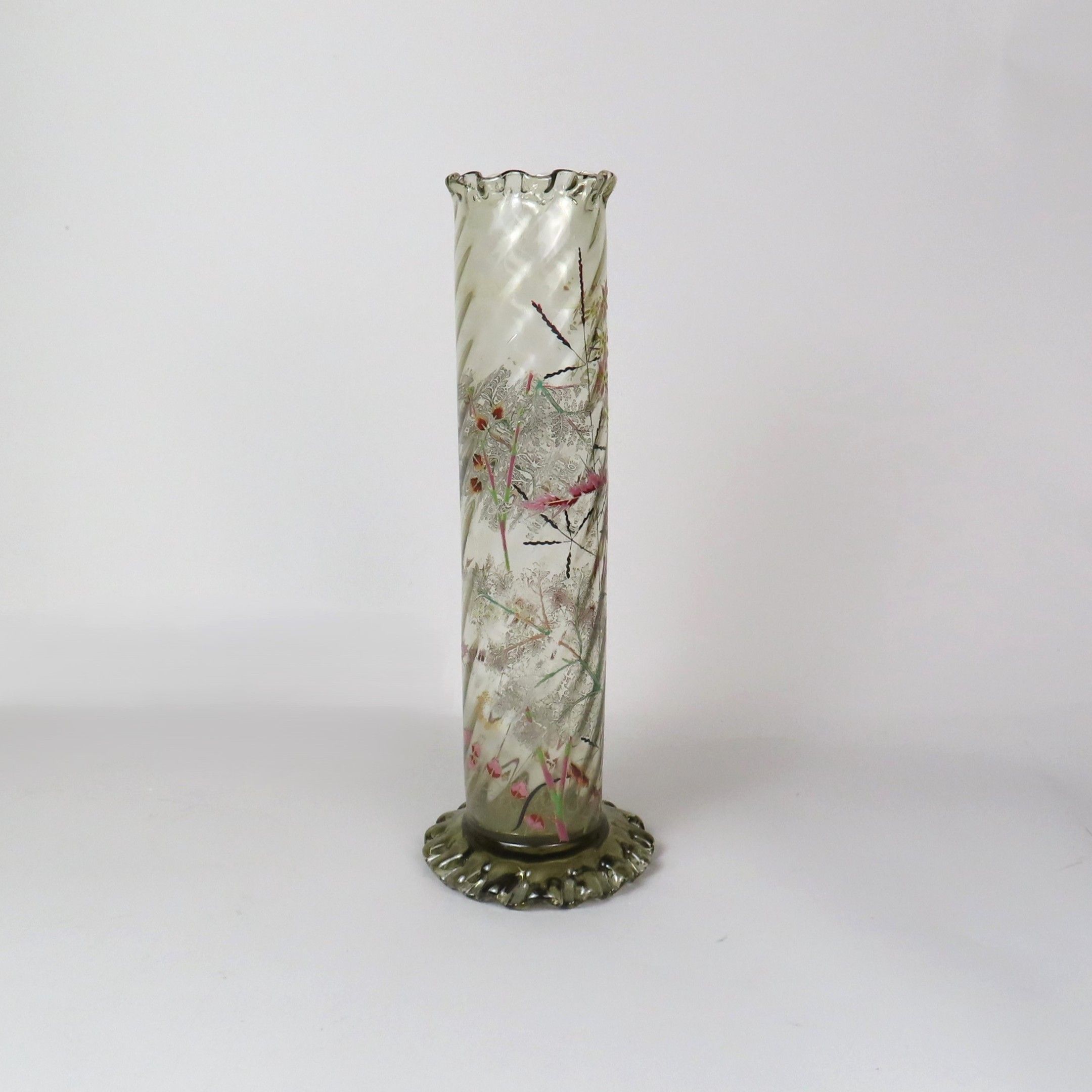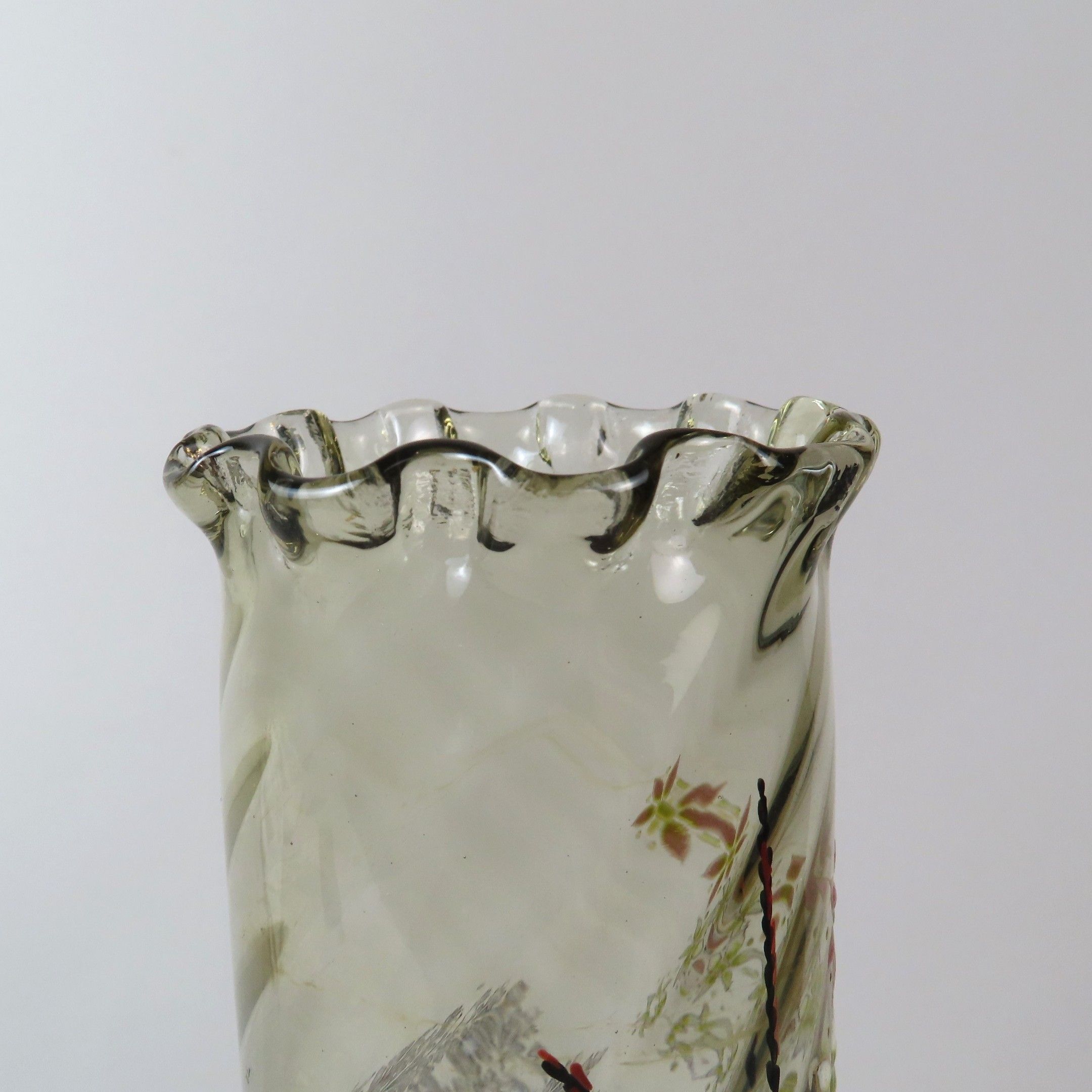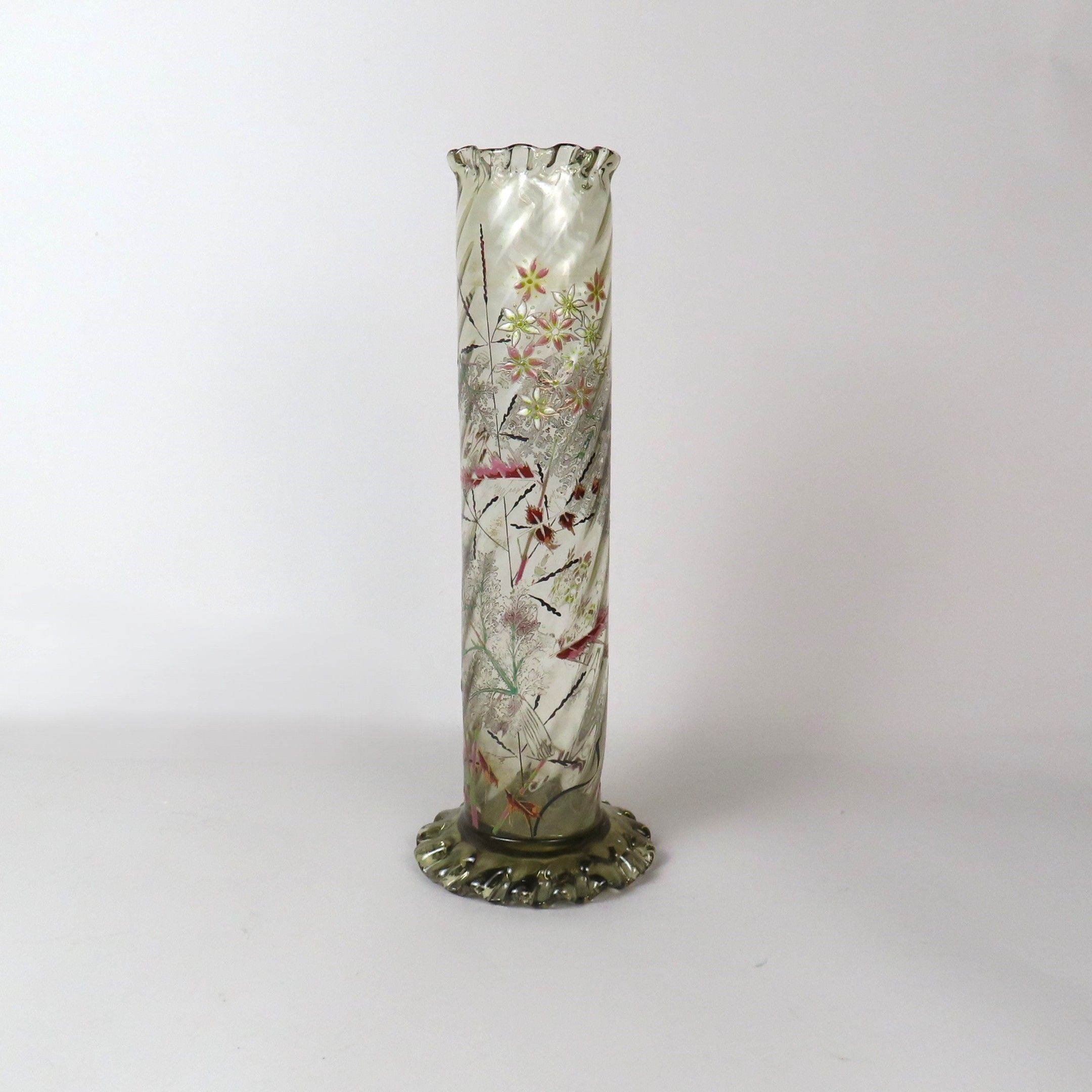 Emile GALLE (1846-1904). Twisted scroll vase in lightly smoked glass; the base and rim worked with tongs; the decoration enamelled and enhanced with gold, of grasses and field flowers. Signed under the base. Height 32.5 cm.