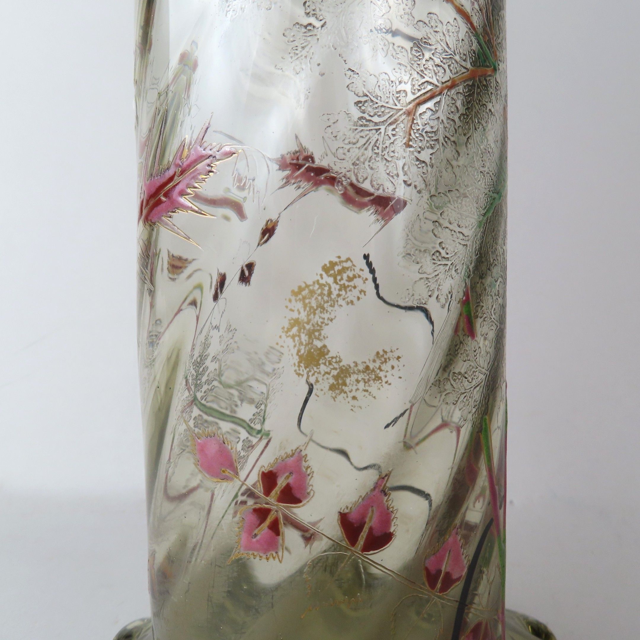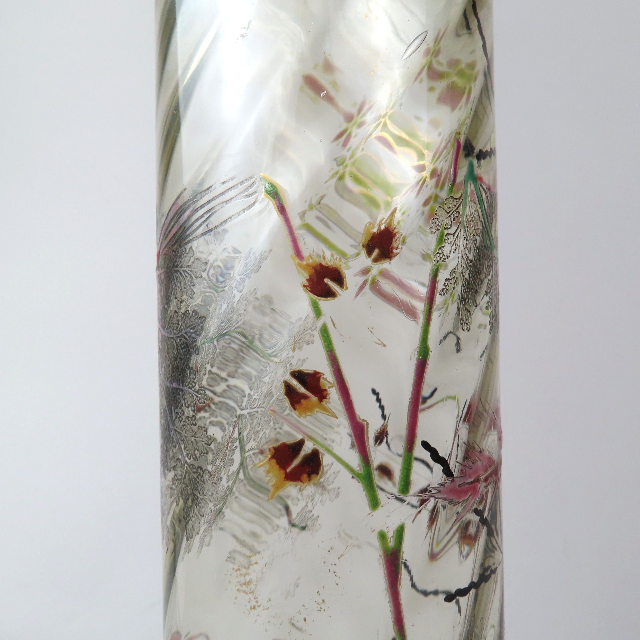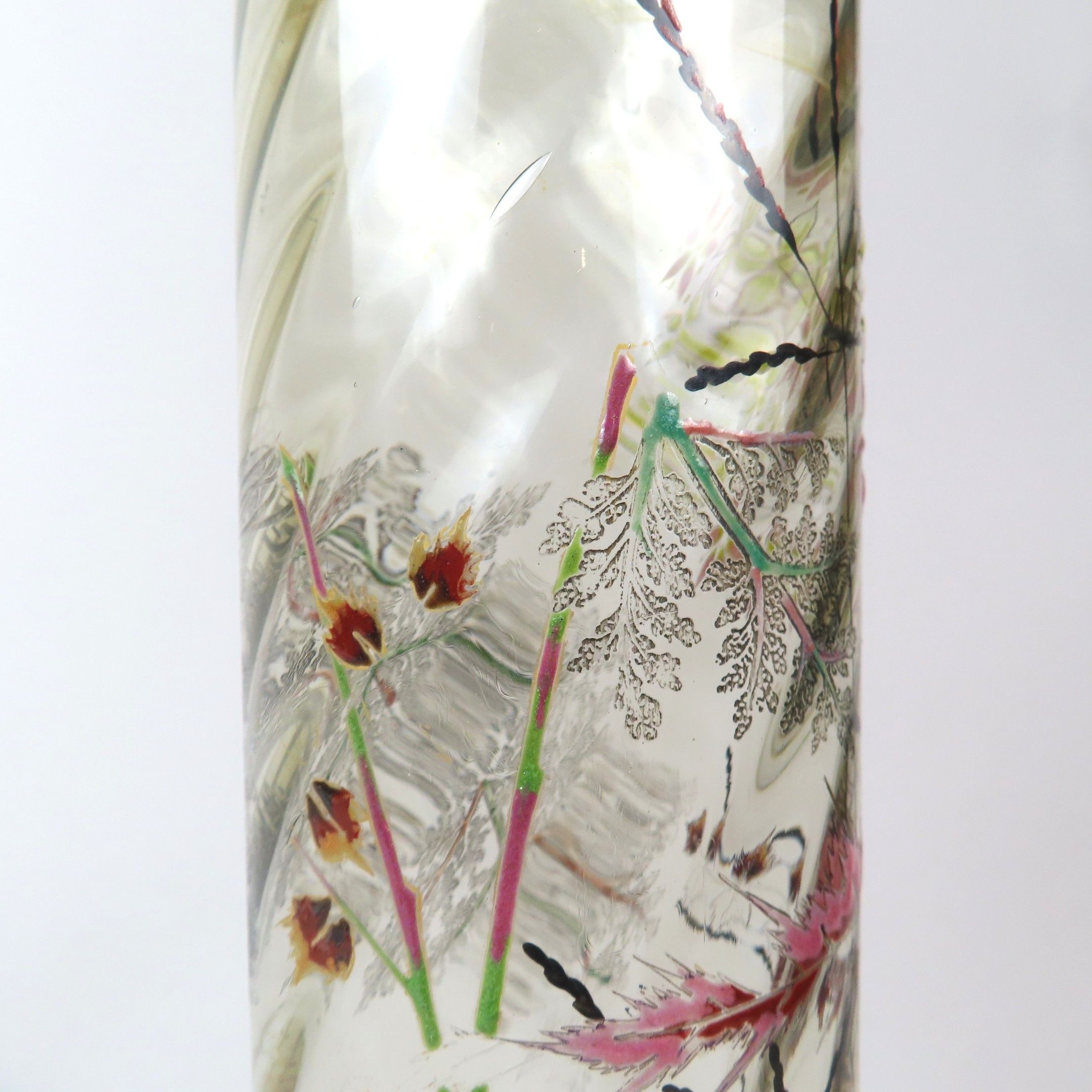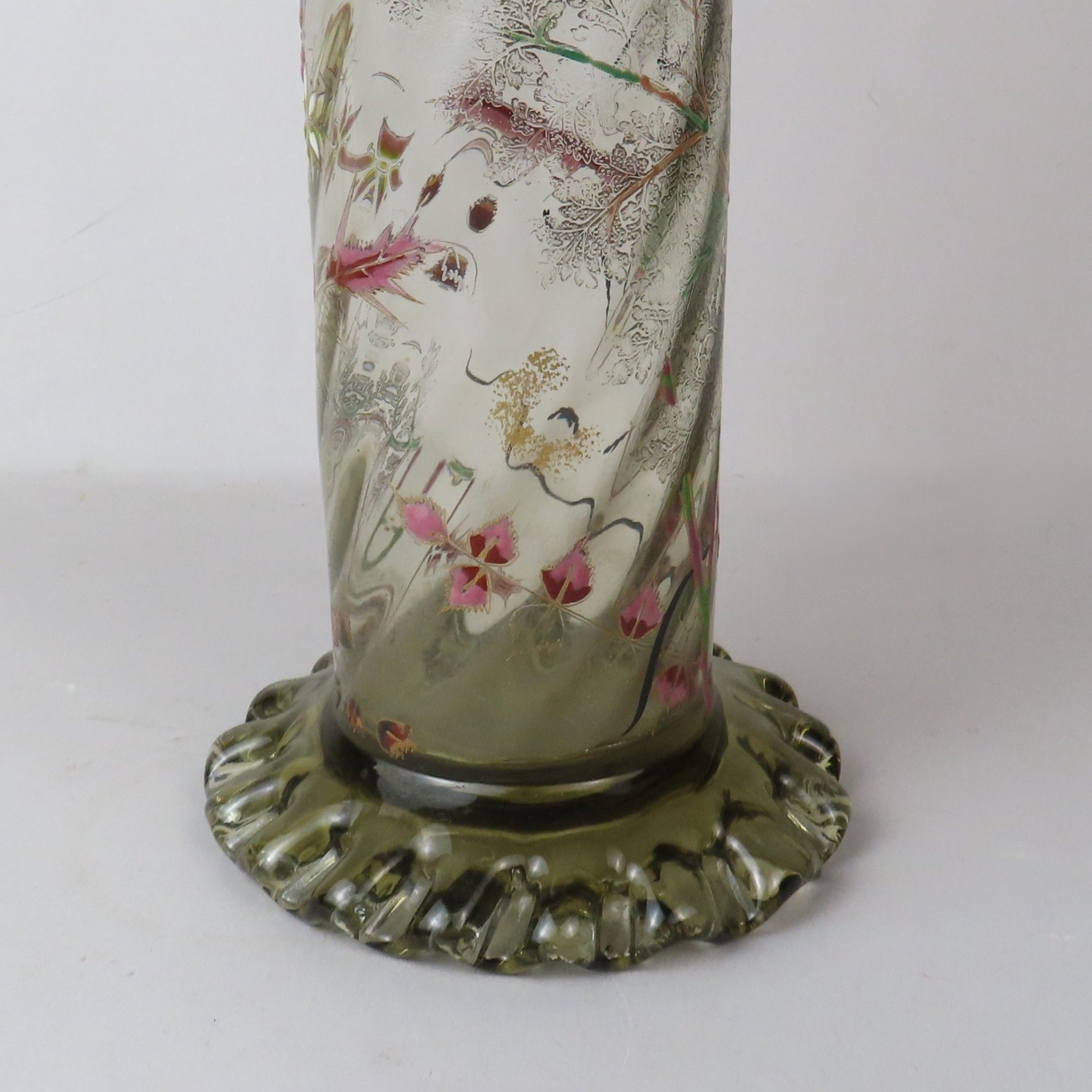Emile GALLE (1846-1904). Twisted scroll vase in lightly smoked glass; the base and rim worked with tongs; the decoration enamelled and enhanced with gold, of grasses and field flowers. Signed under the base. Height 32.5 cm.