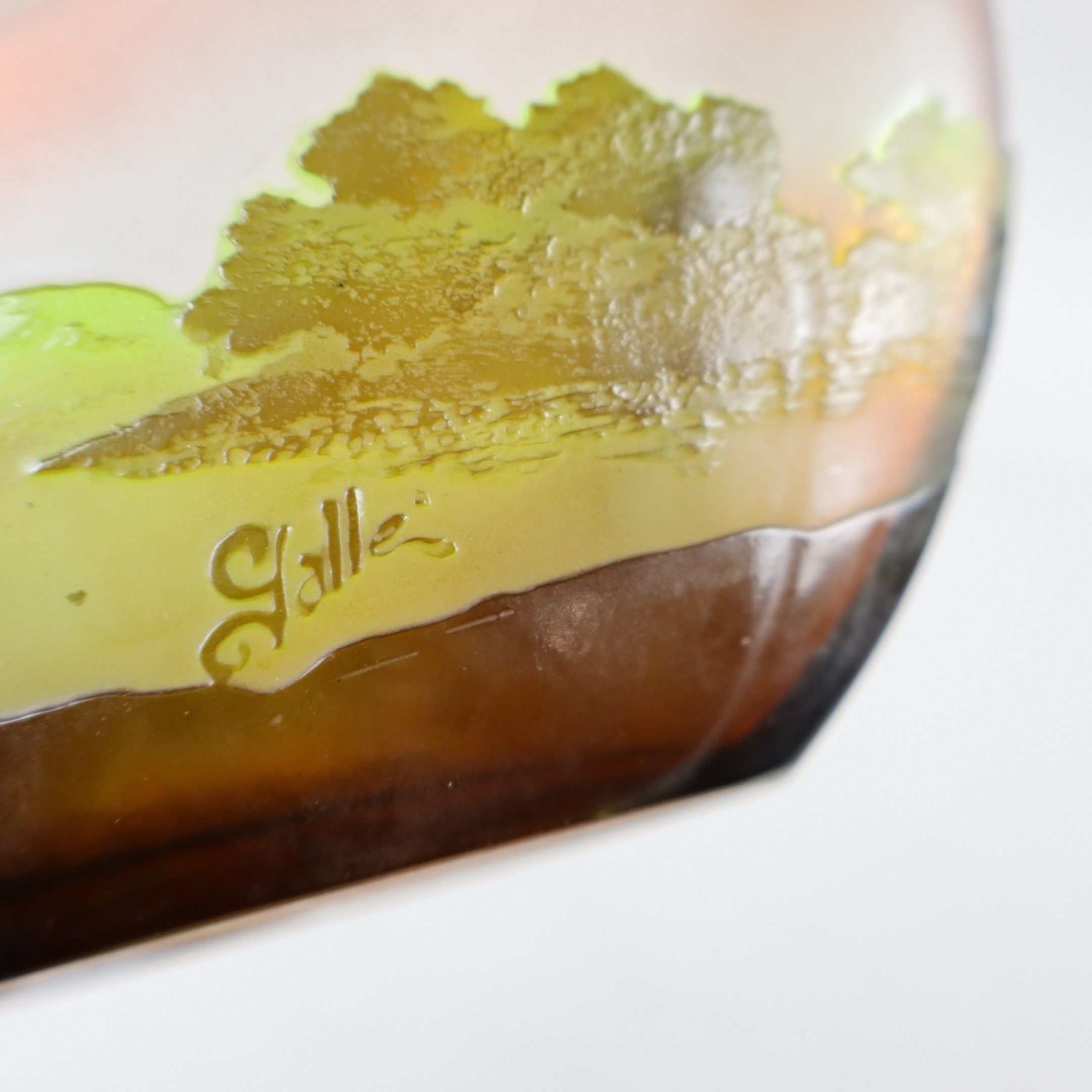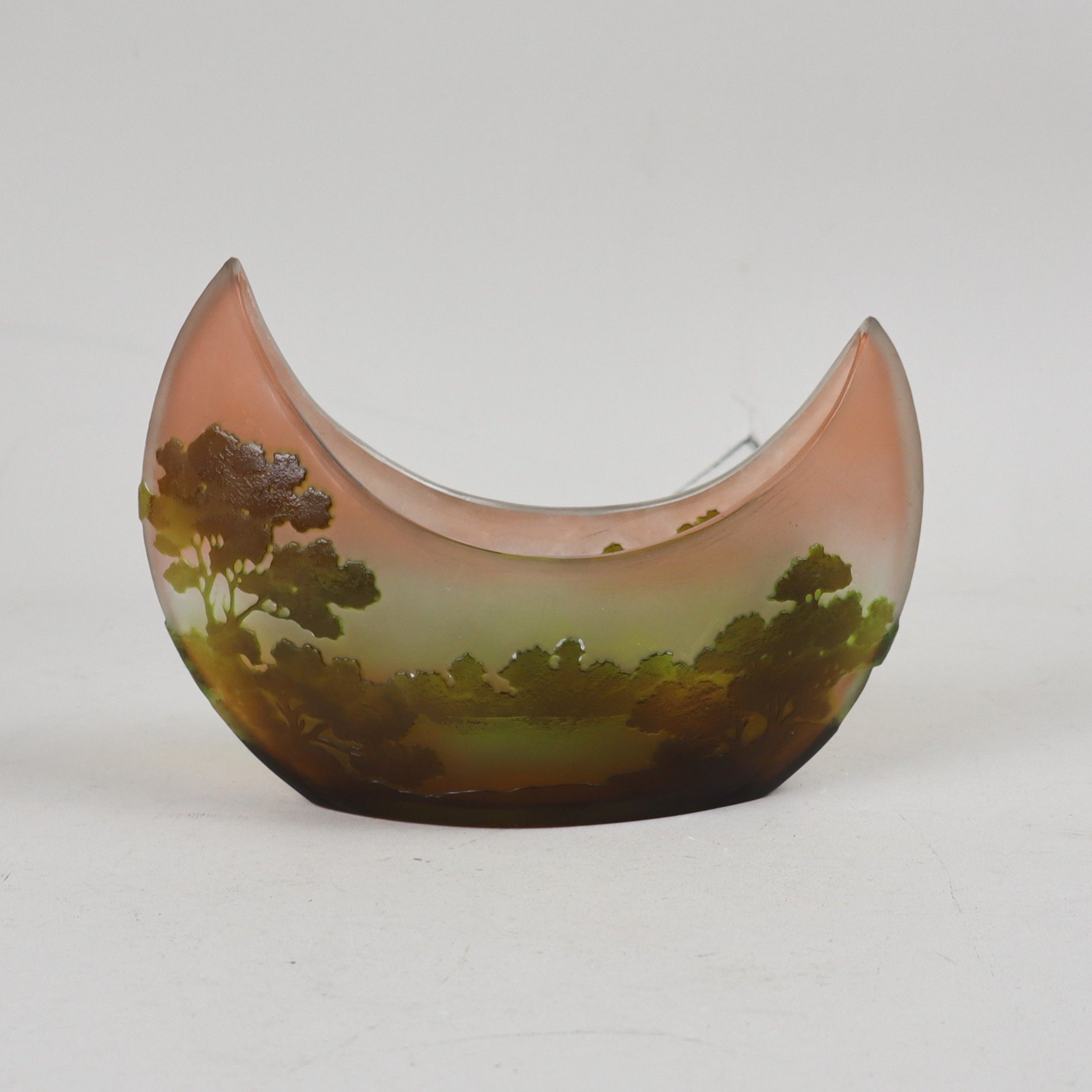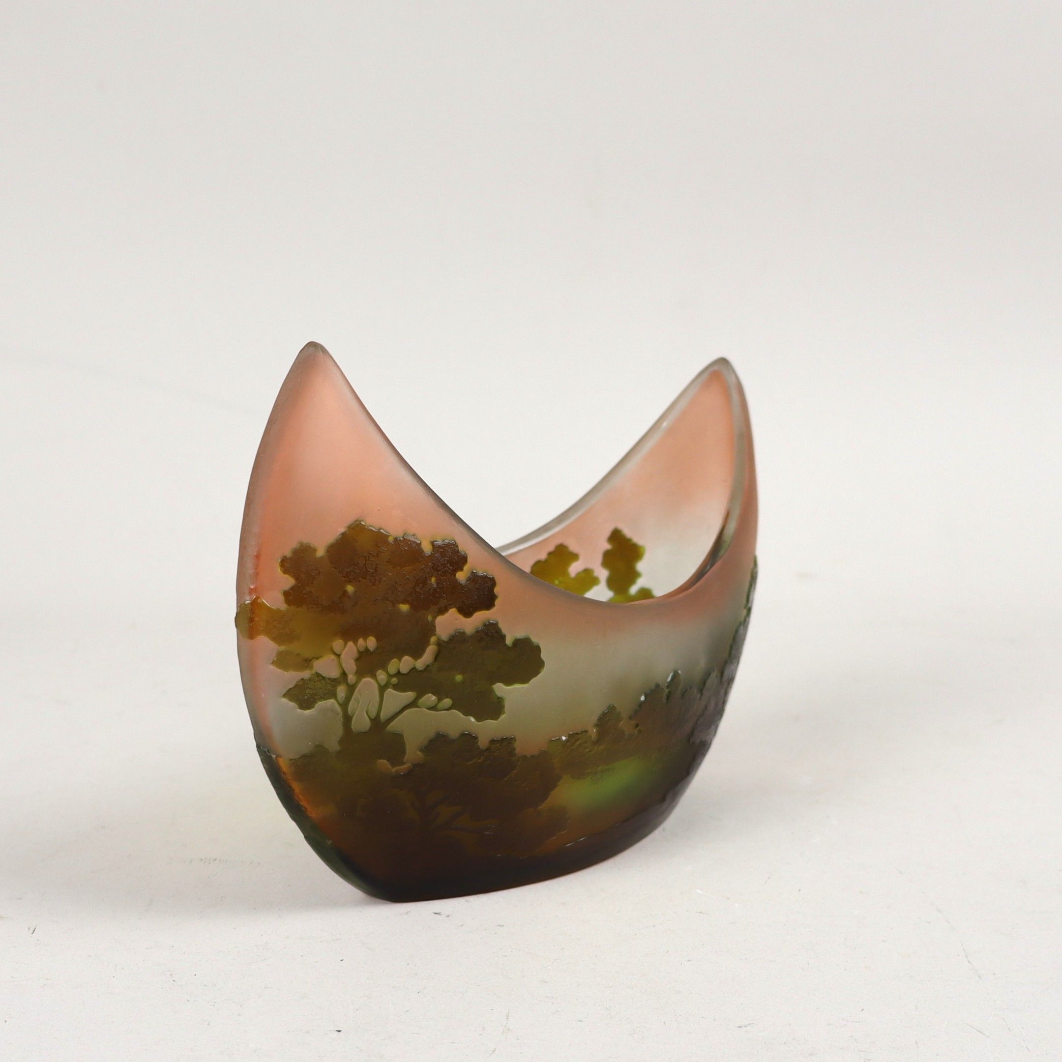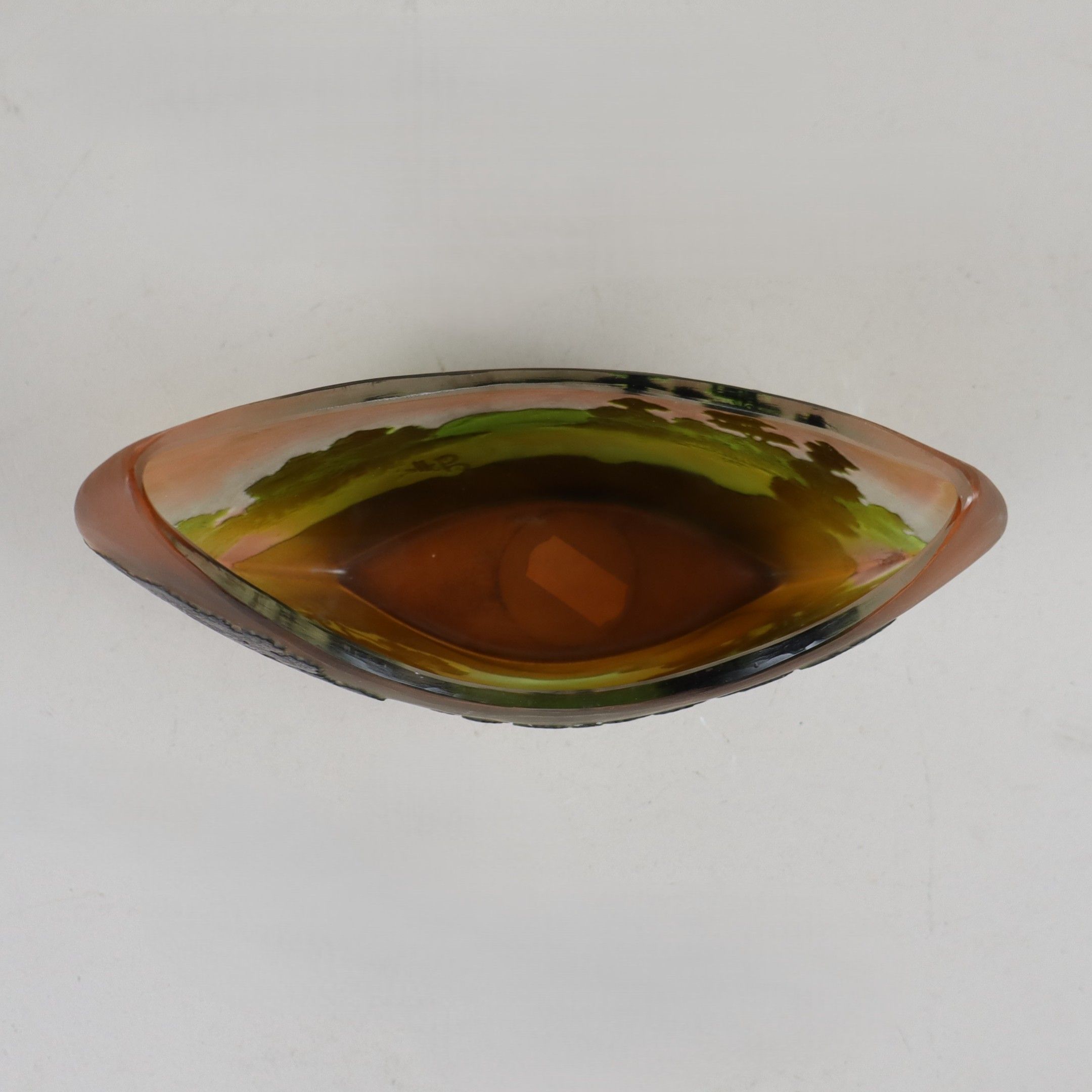 GALLE company. Multi-layered glass "navette" shaped bowl with acid-etched decoration of lakeside landscapes. Signed in the decoration. Early 20th century. 13 x 18 x 7 cm.