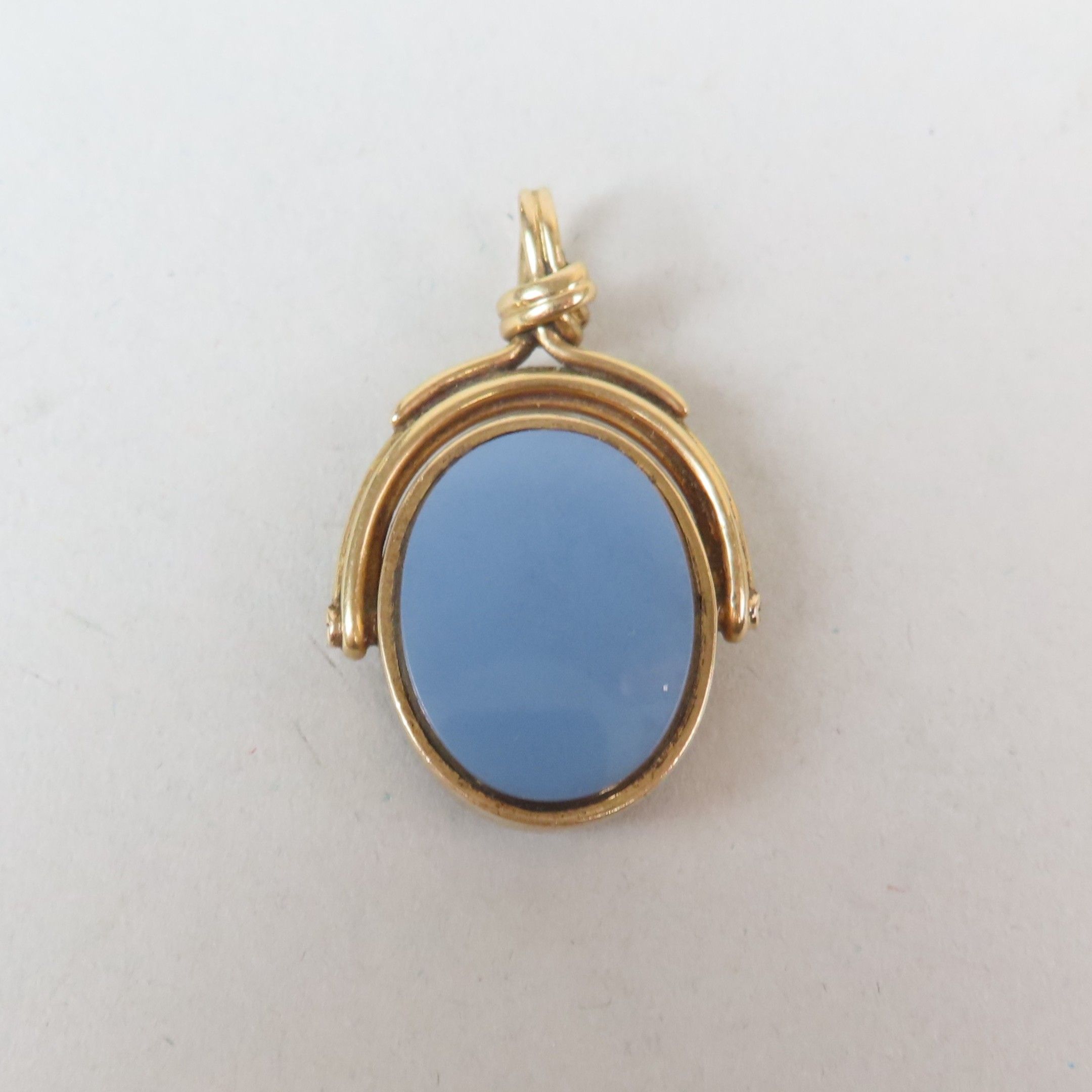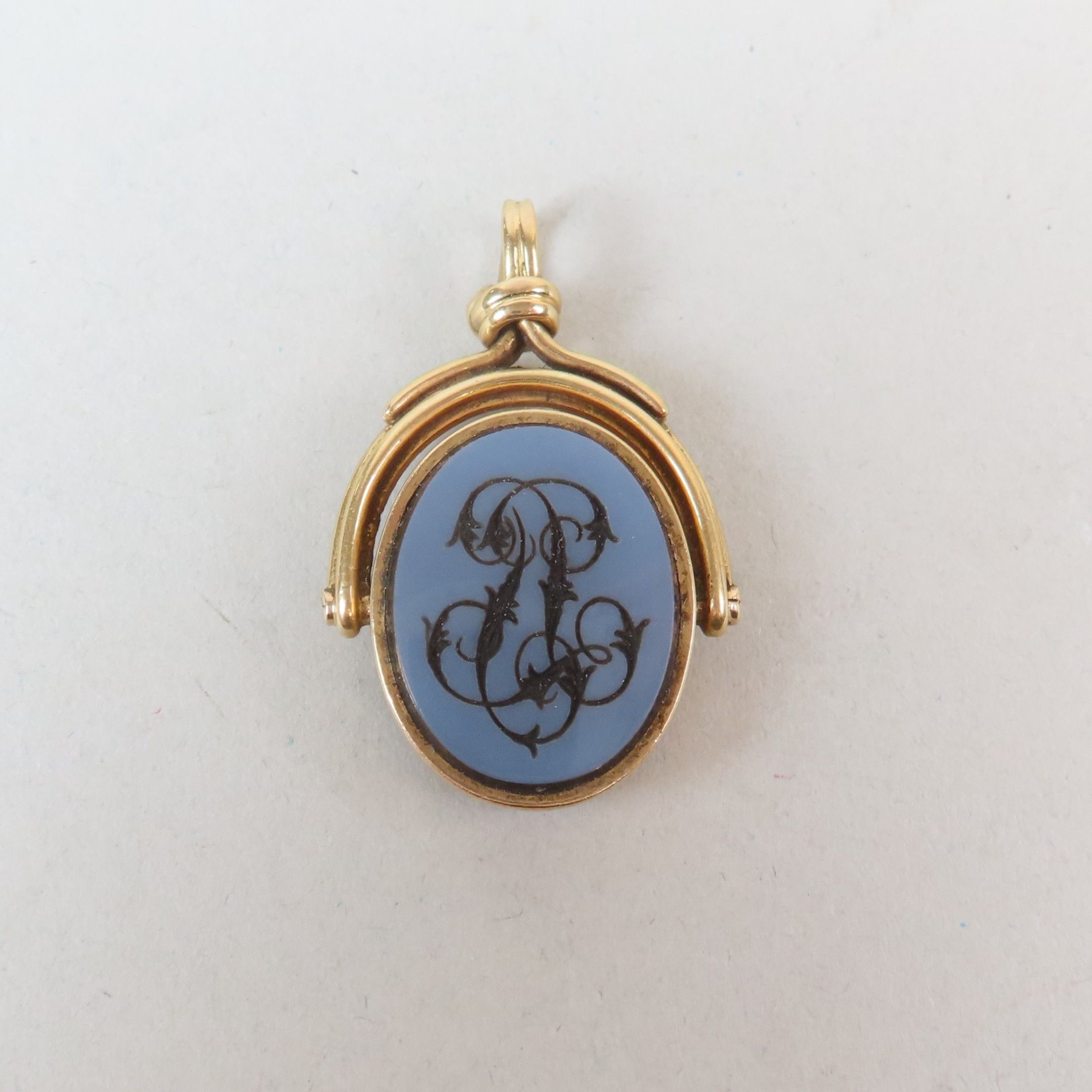 Reunion of two buttons, a fragment of an earring and a pendant with a monogrammed intaglio (height = 34 mm), in yellow gold (750/00). Gross weight = 11.2 g.