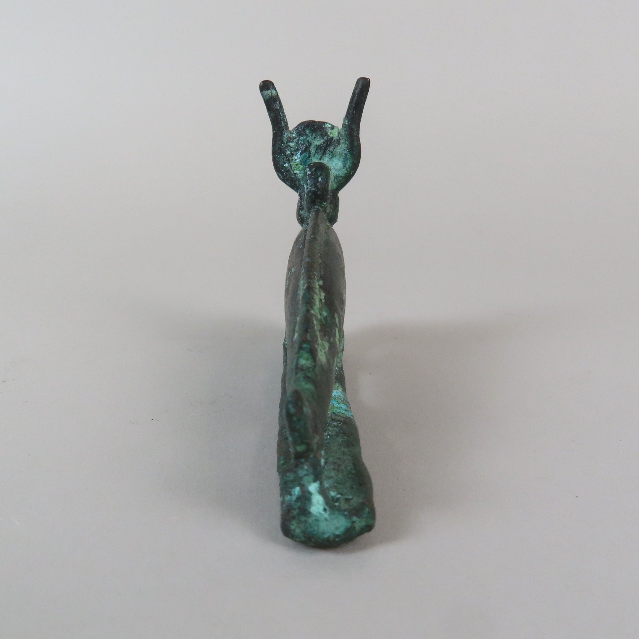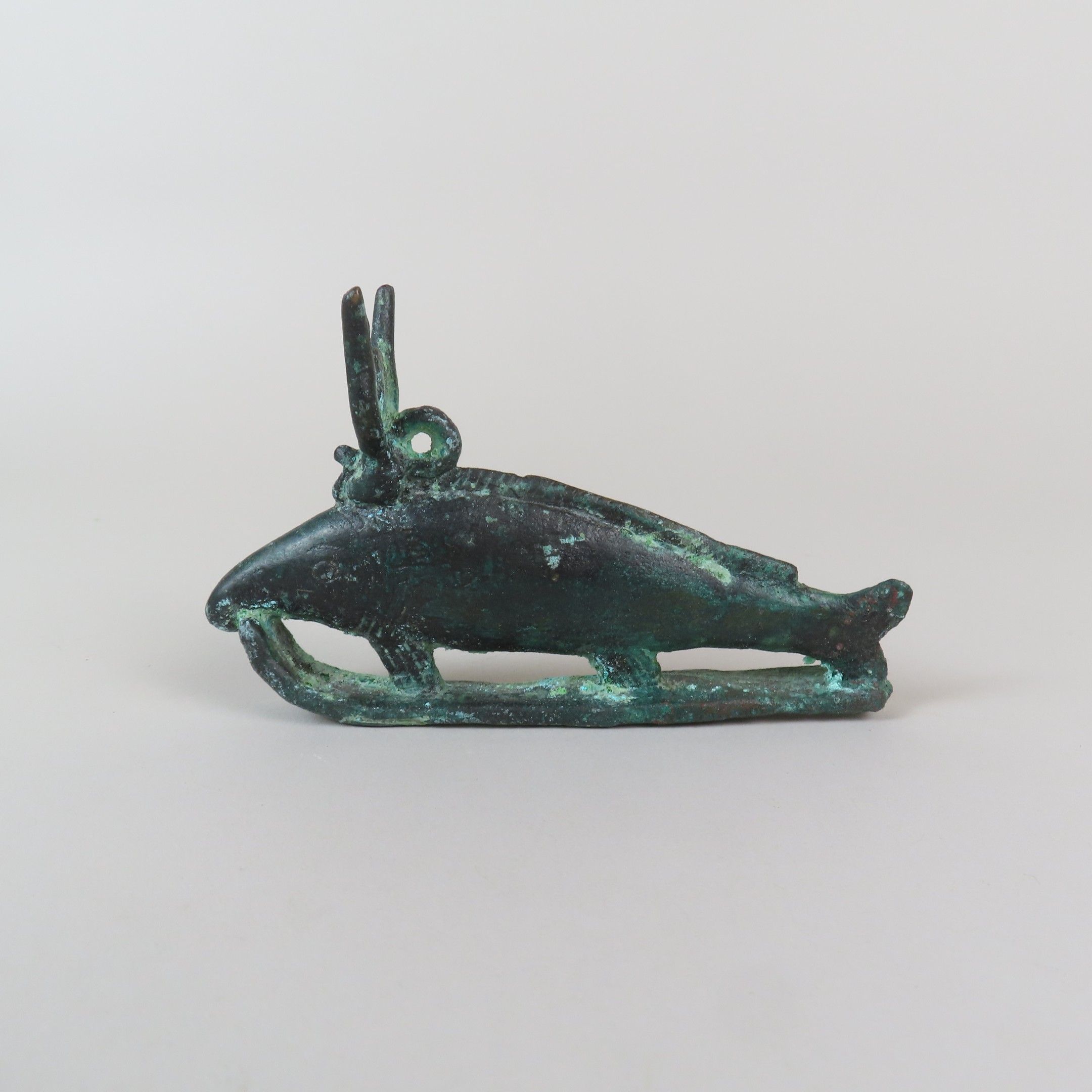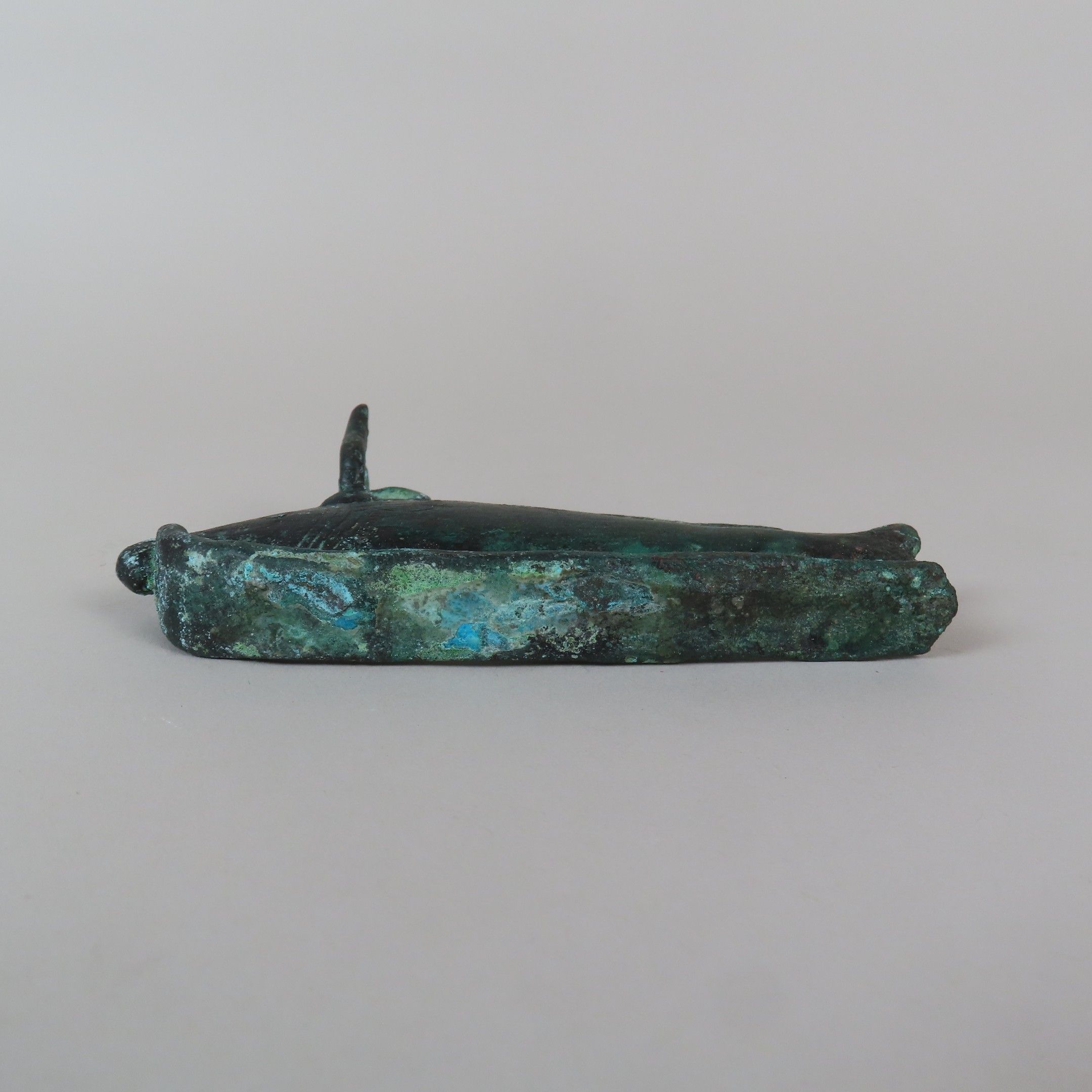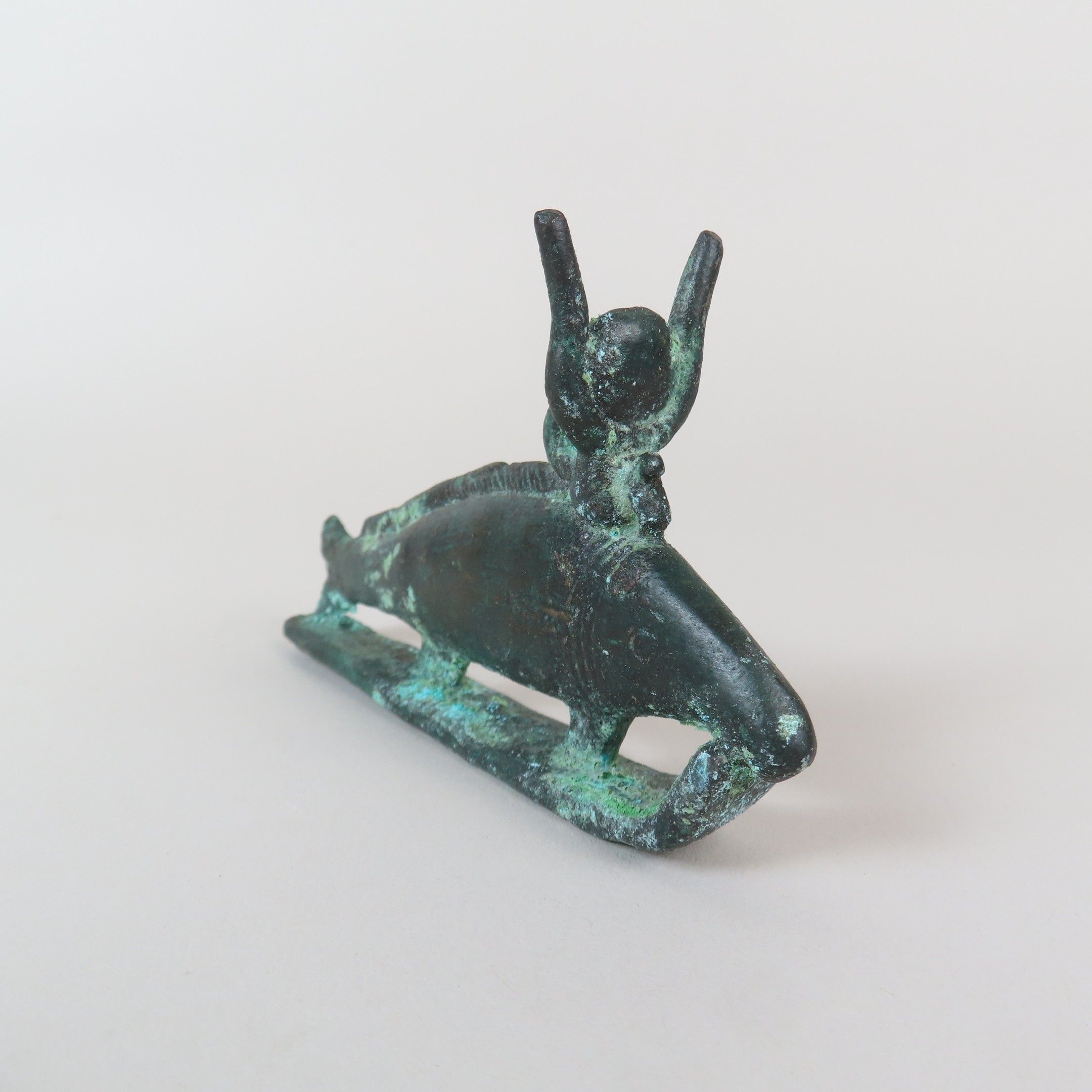 Figurine of an oxyrhynchus wearing a hathoric crown. Bronze with a smooth dark green patina. Partially corroded. Egypt, Late Period or Ptolemaic period, 664 30 BC. L. = 10.5 cm.