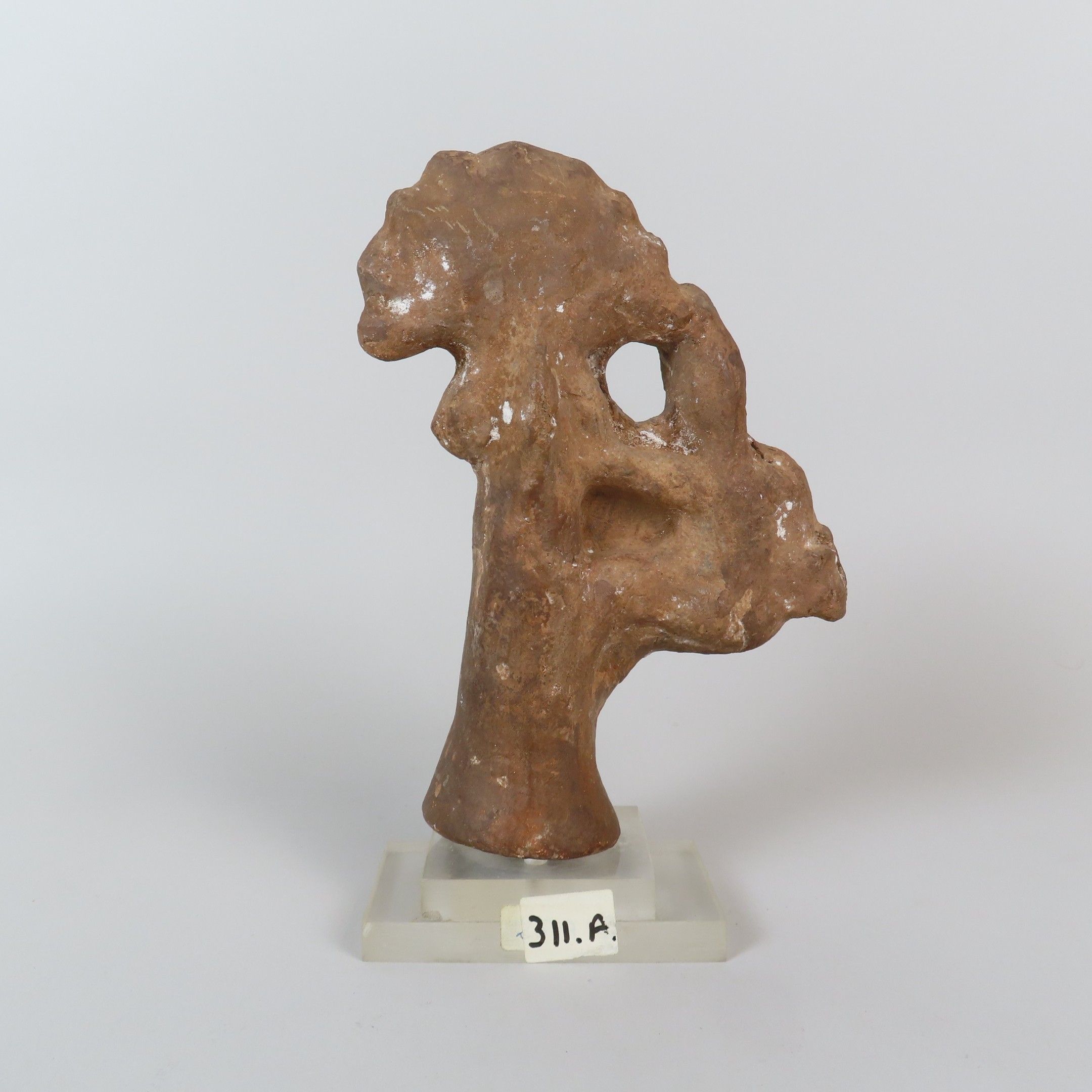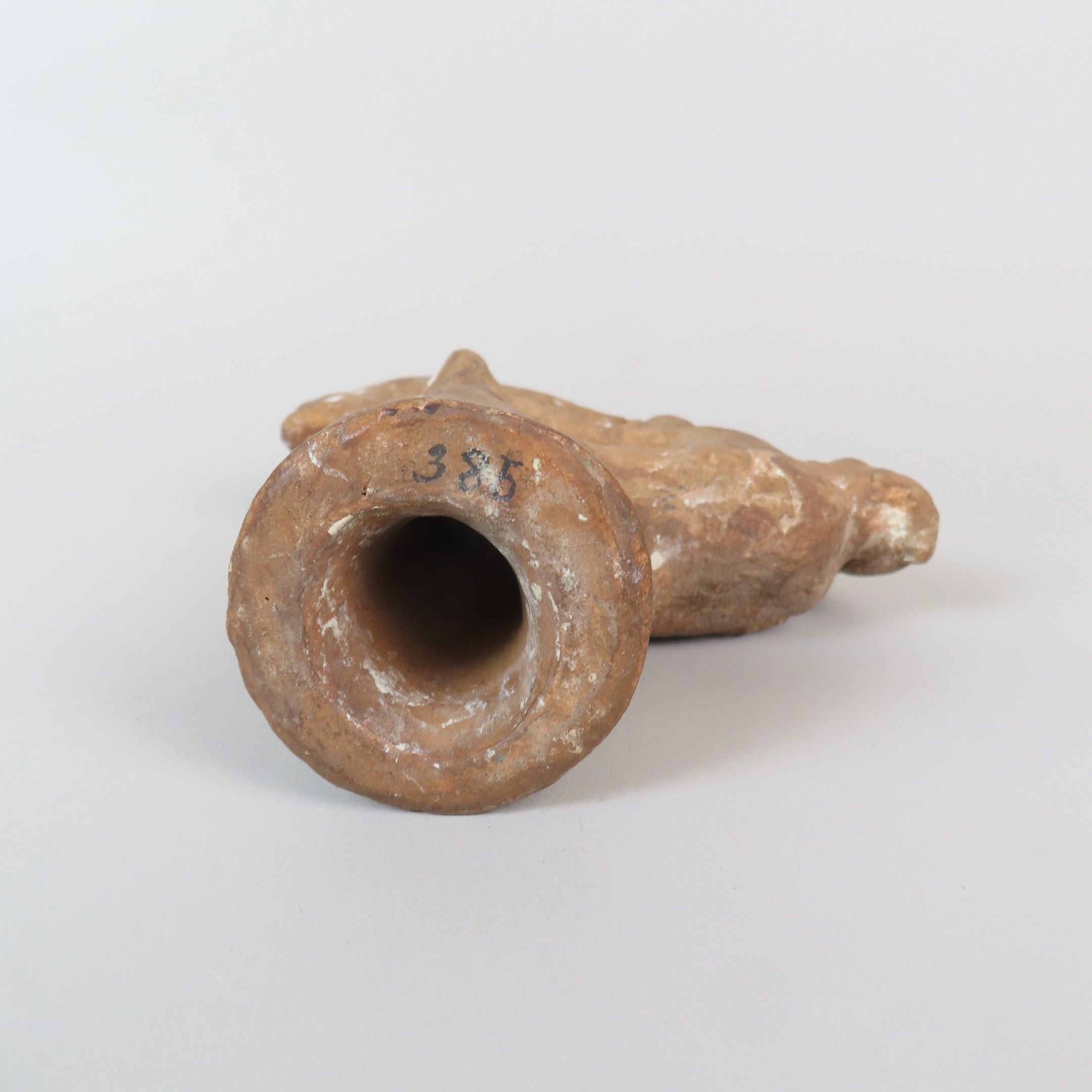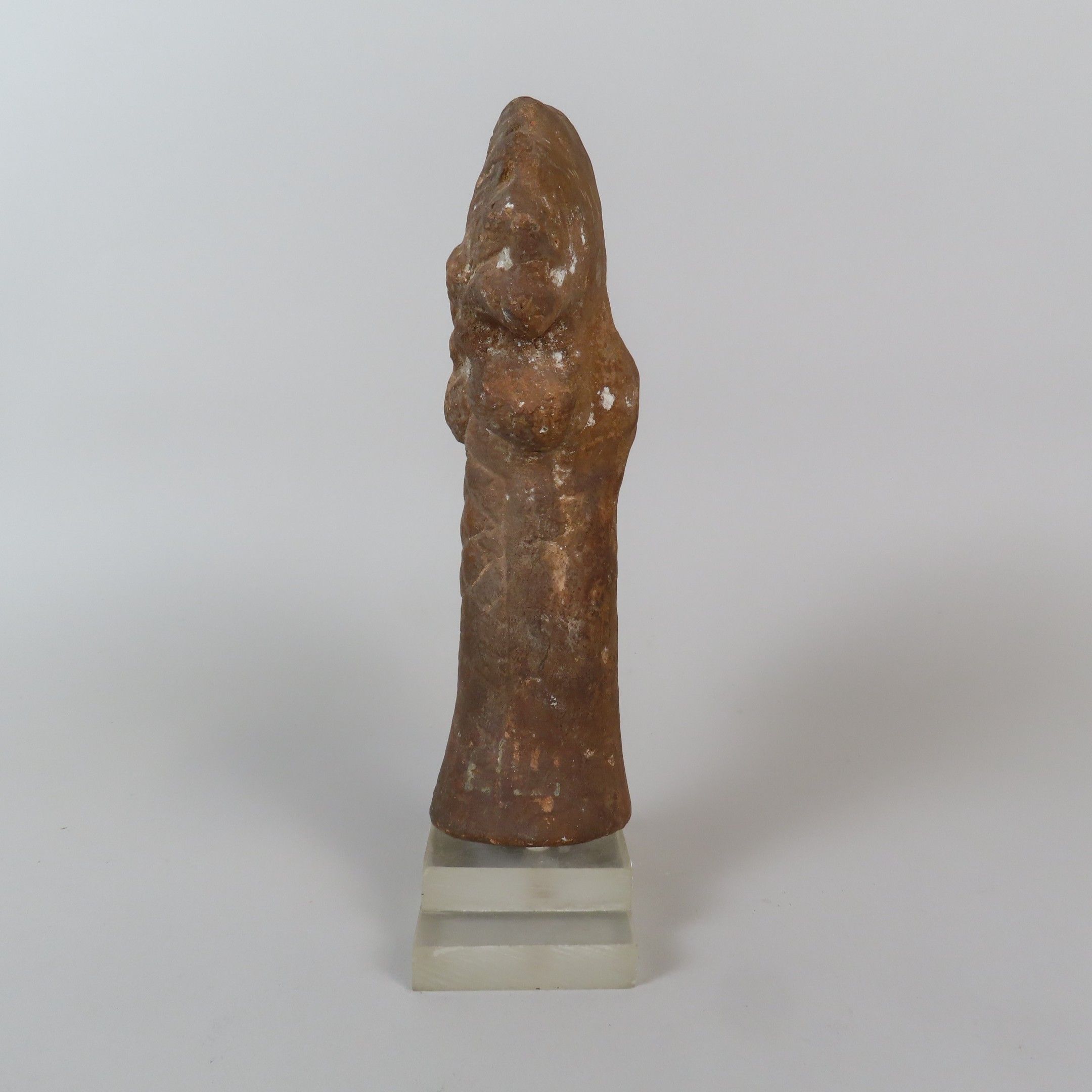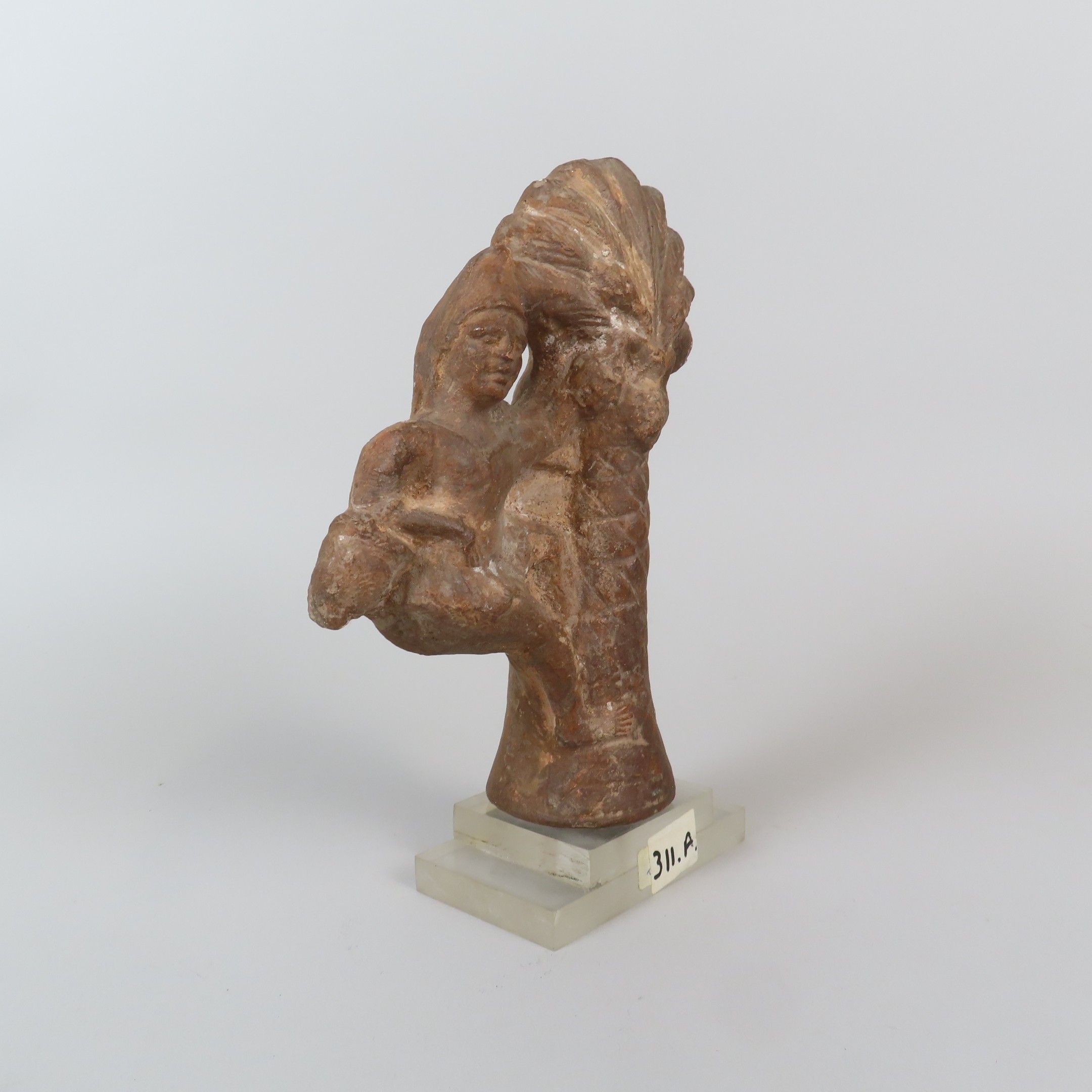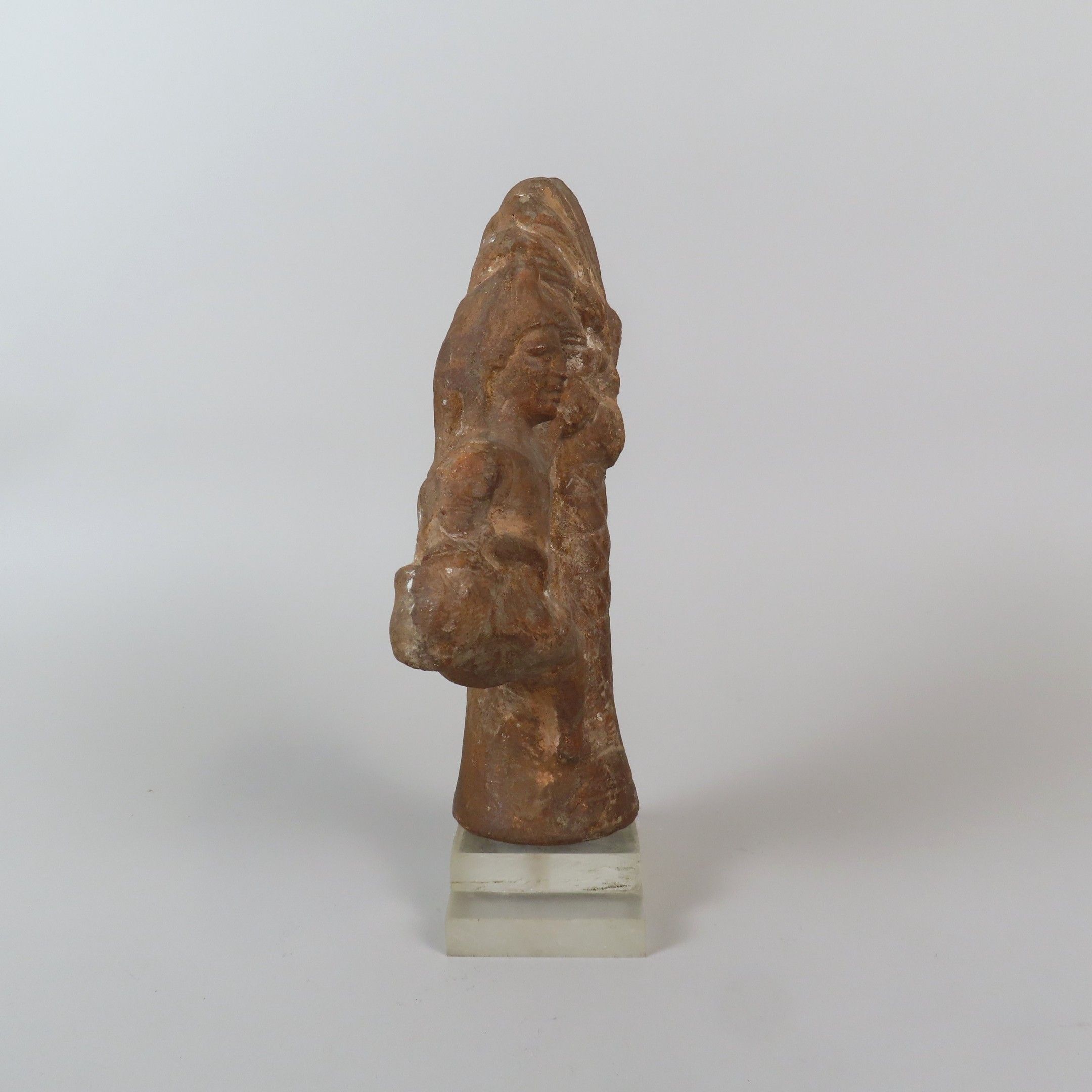 Statuette depicting a man wearing a short tunic and pointed cap, holding a basket with his right arm and climbing a date palm. Rare iconography. Ochre terracotta. Egypt, Roman period. H. = 17.5 cm (excluding base)