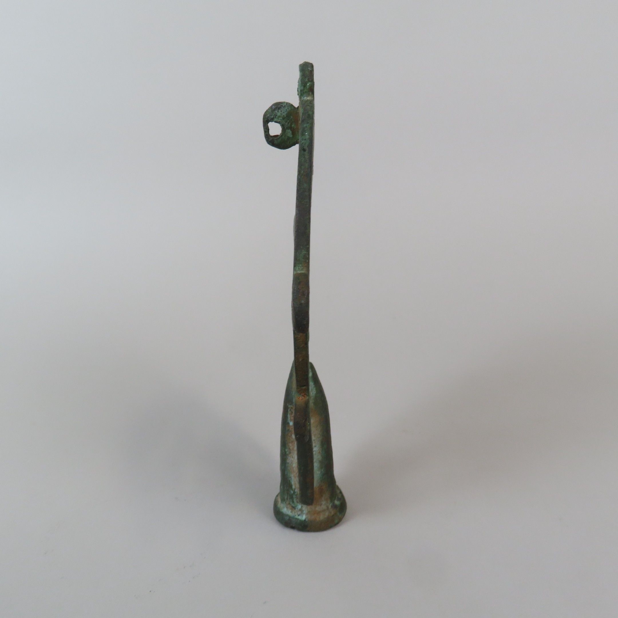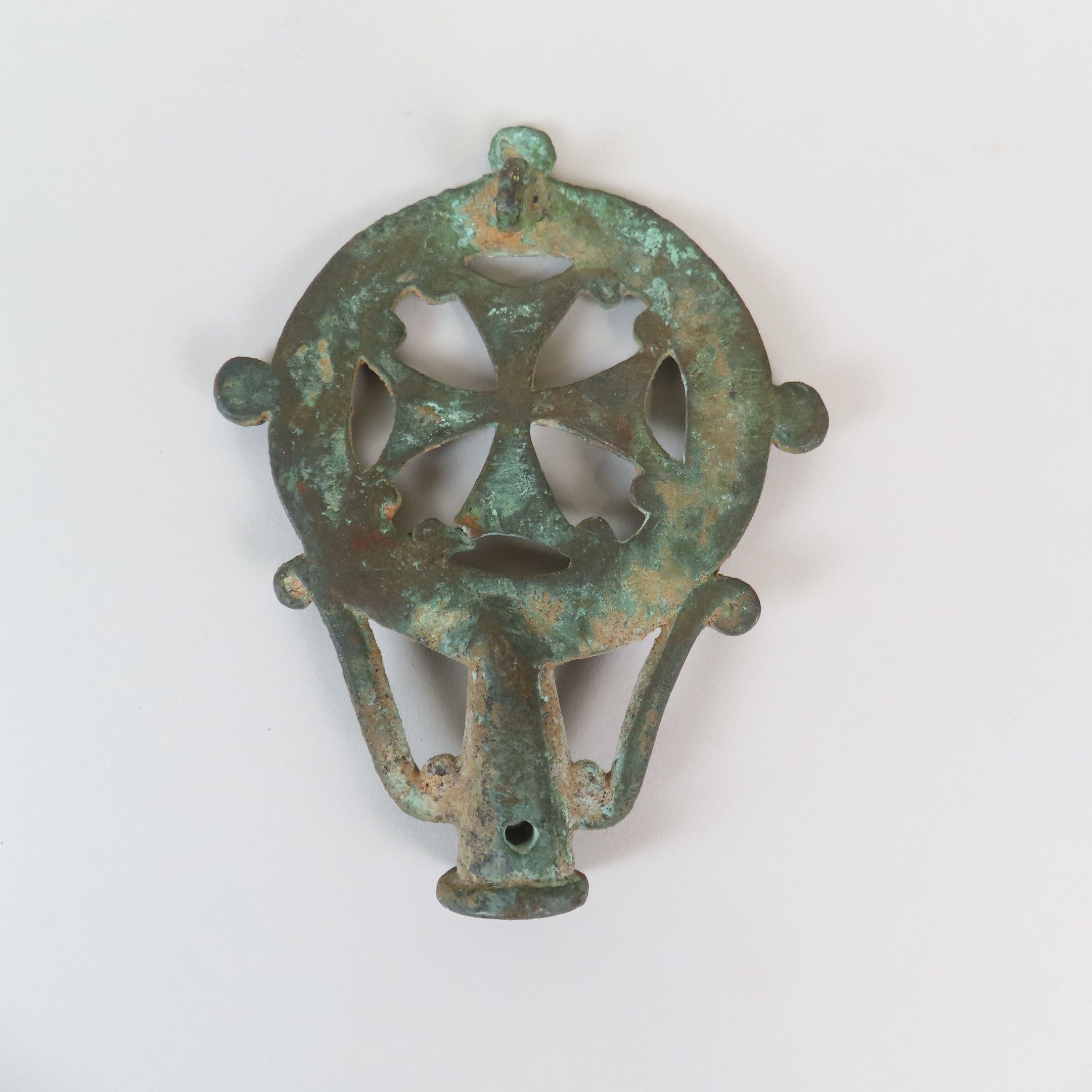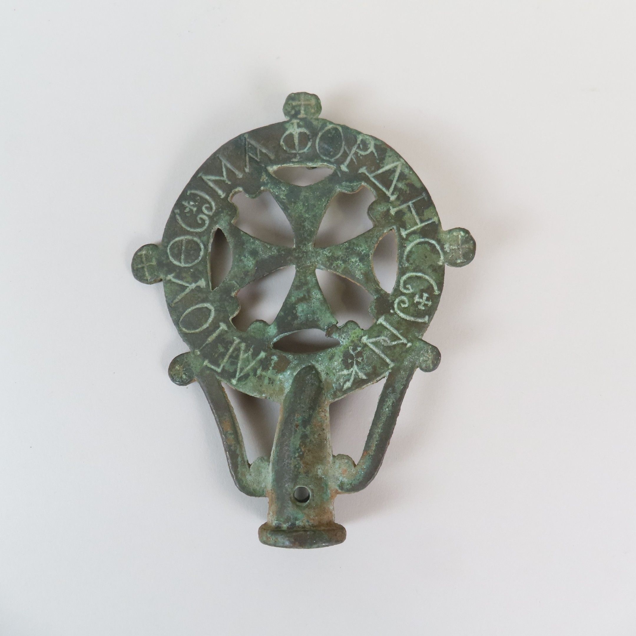 An openwork processional staff depicting a cross framed by a circular inscription in Greek: "Saint Thomas, for the sun". Bronze. Near East, 7th-9th century. Height = 14 cm.