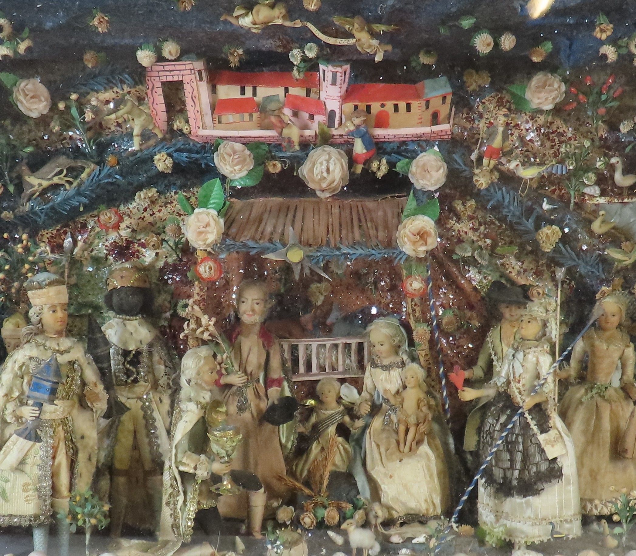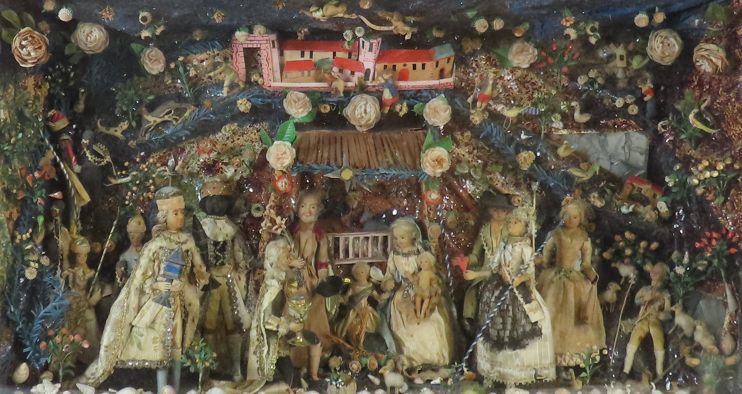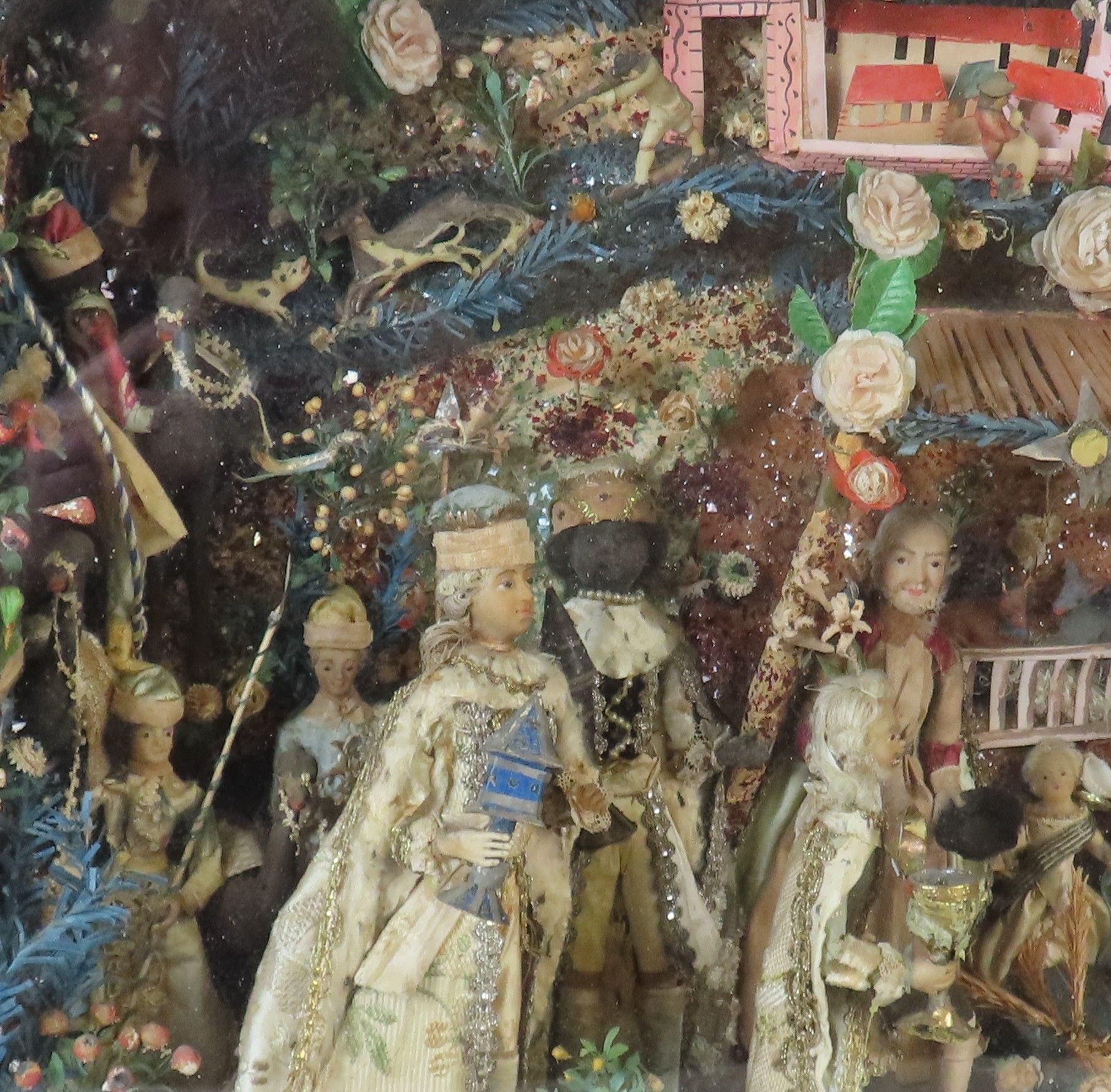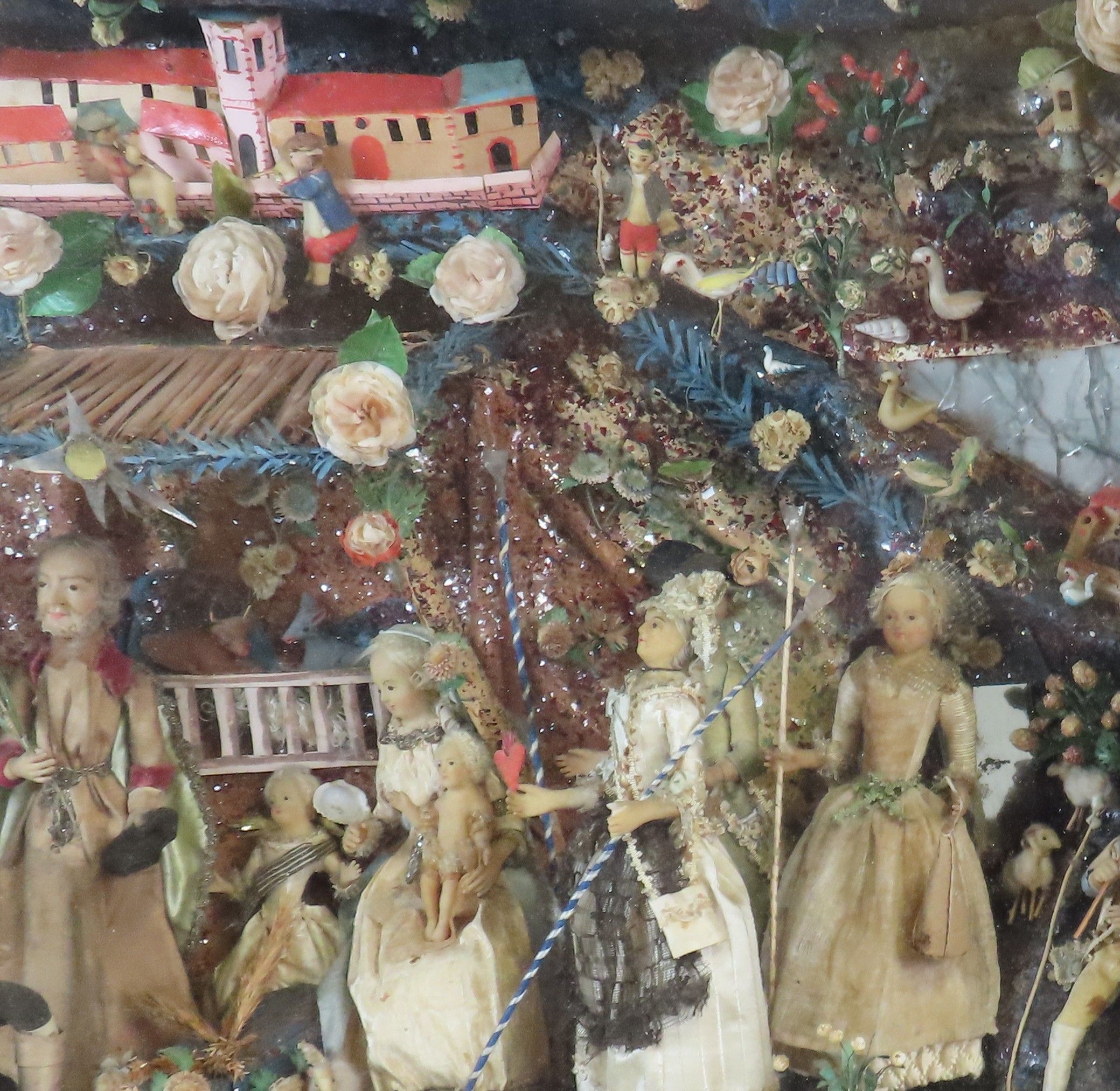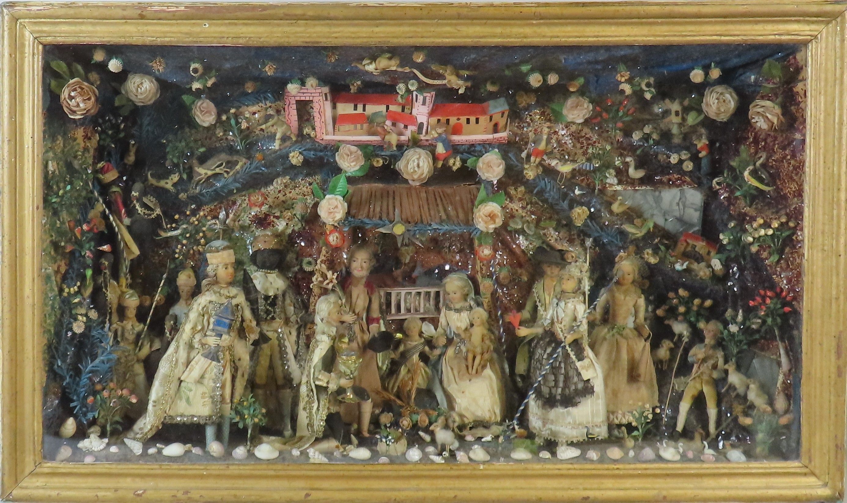 Large composition of dressed wax depicting the Nativity and the arrival of the Three Wise Men, in a window frame decorated with shells, glassware, animals, plants and architectural elements in various materials. 18th century. Length 73 cm; height 43 cm; D. 19 cm (restorations)