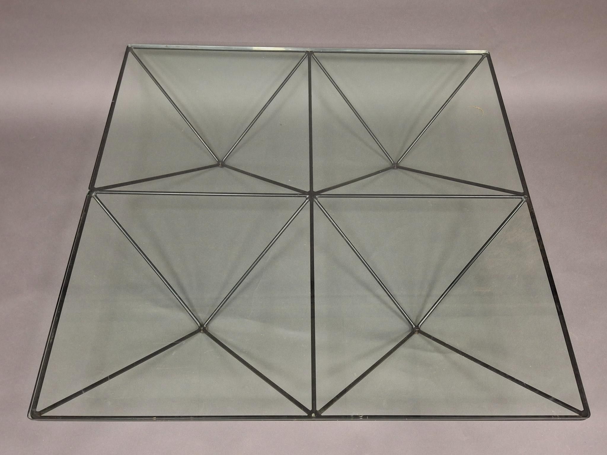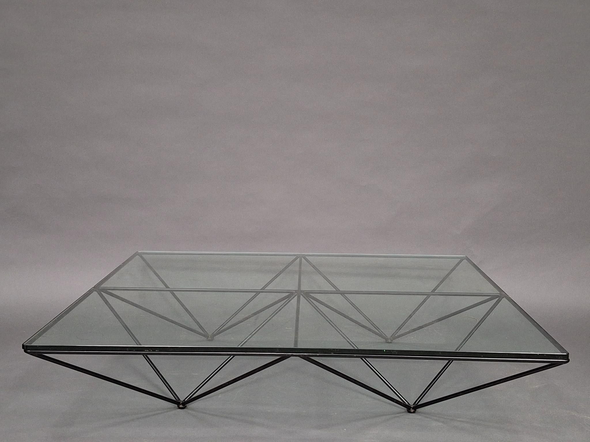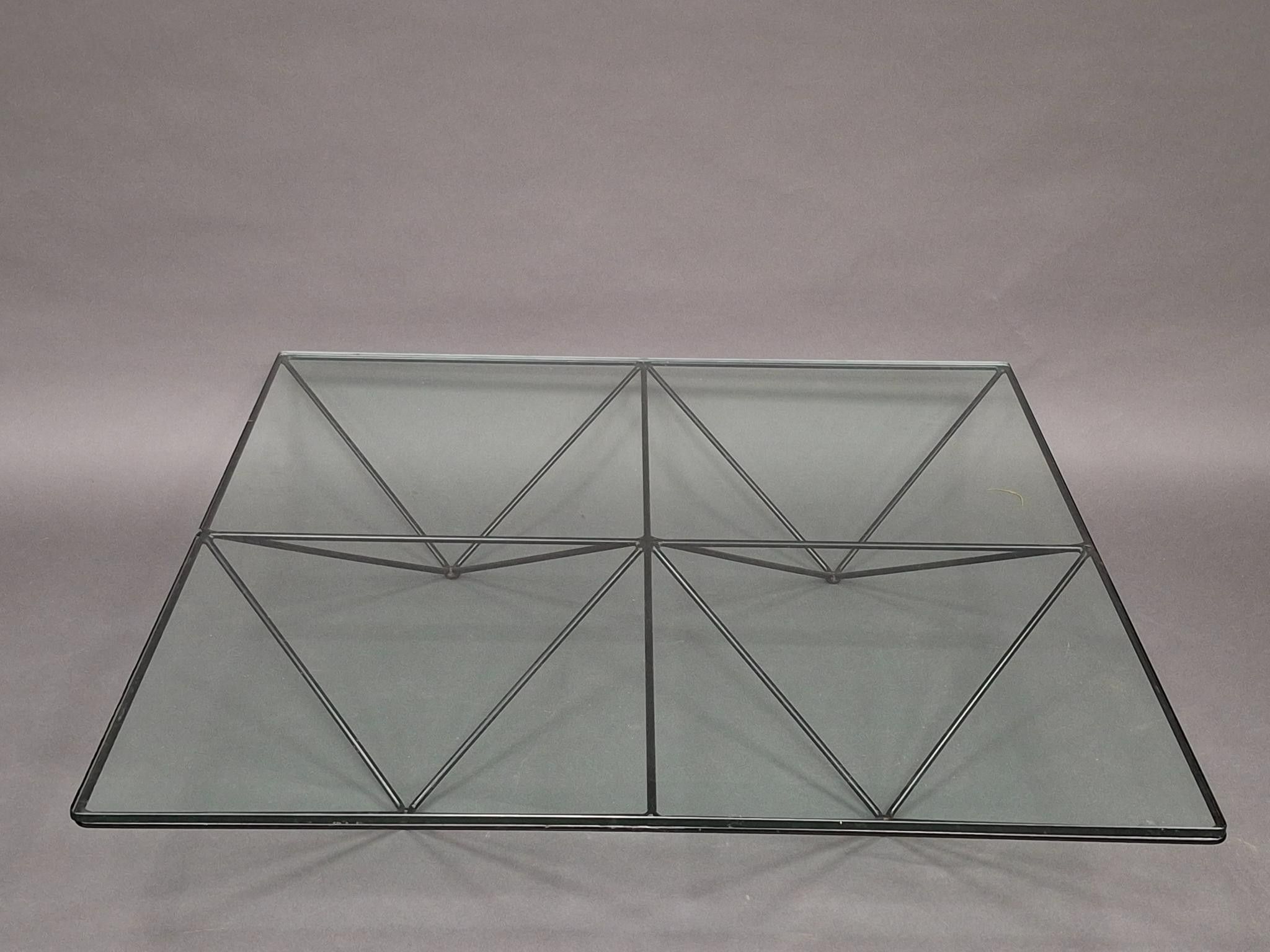 Paolo PIVA (1950-2017) "Alanda" coffee table. Black lacquered metal structure and glass top. Height 26 cm, length 100 x 100 cm (minor wear to lacquering, chip to top).