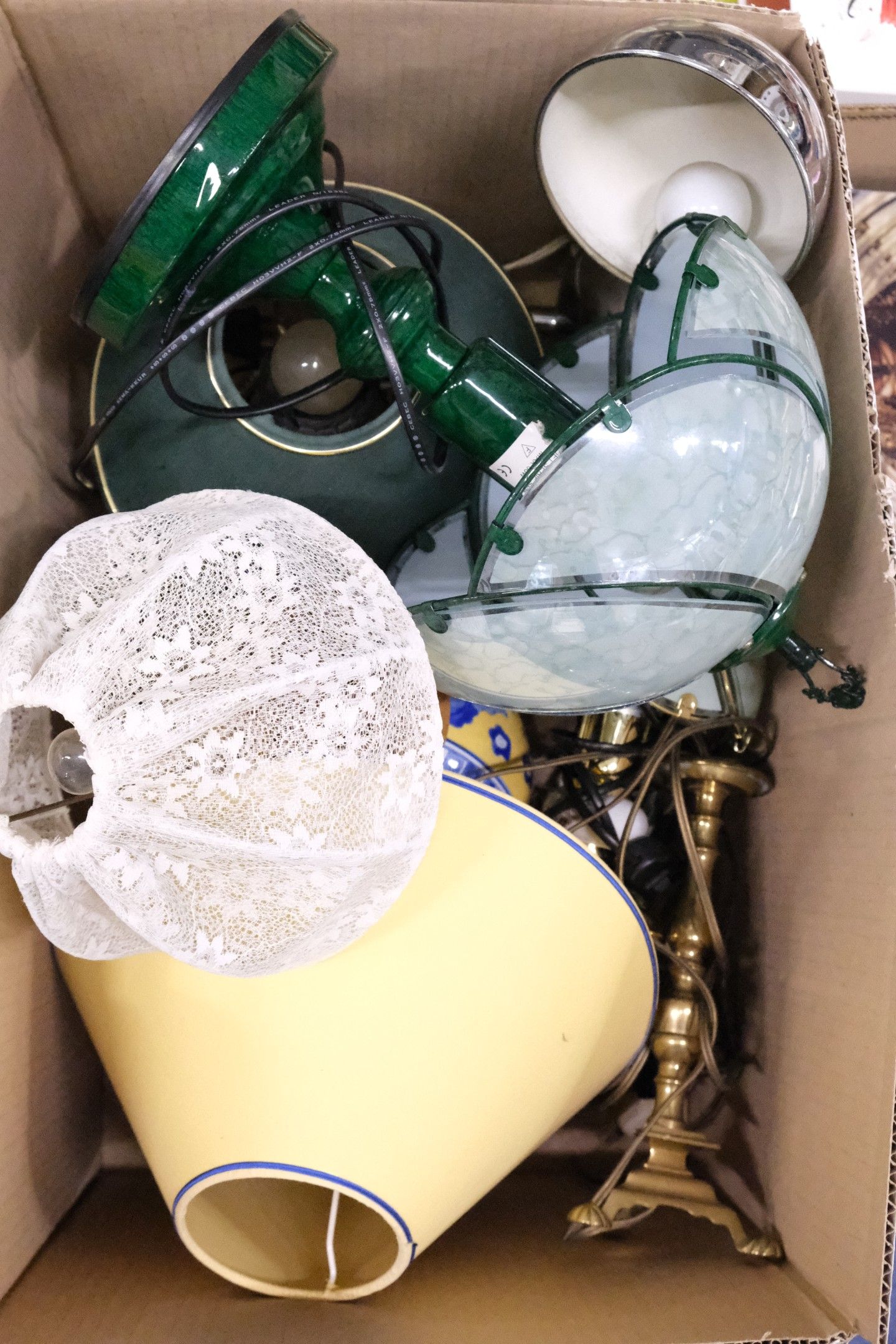 Set of seven lamps including two industrial desk lamps, a bronze lamp base and miscellaneous.
