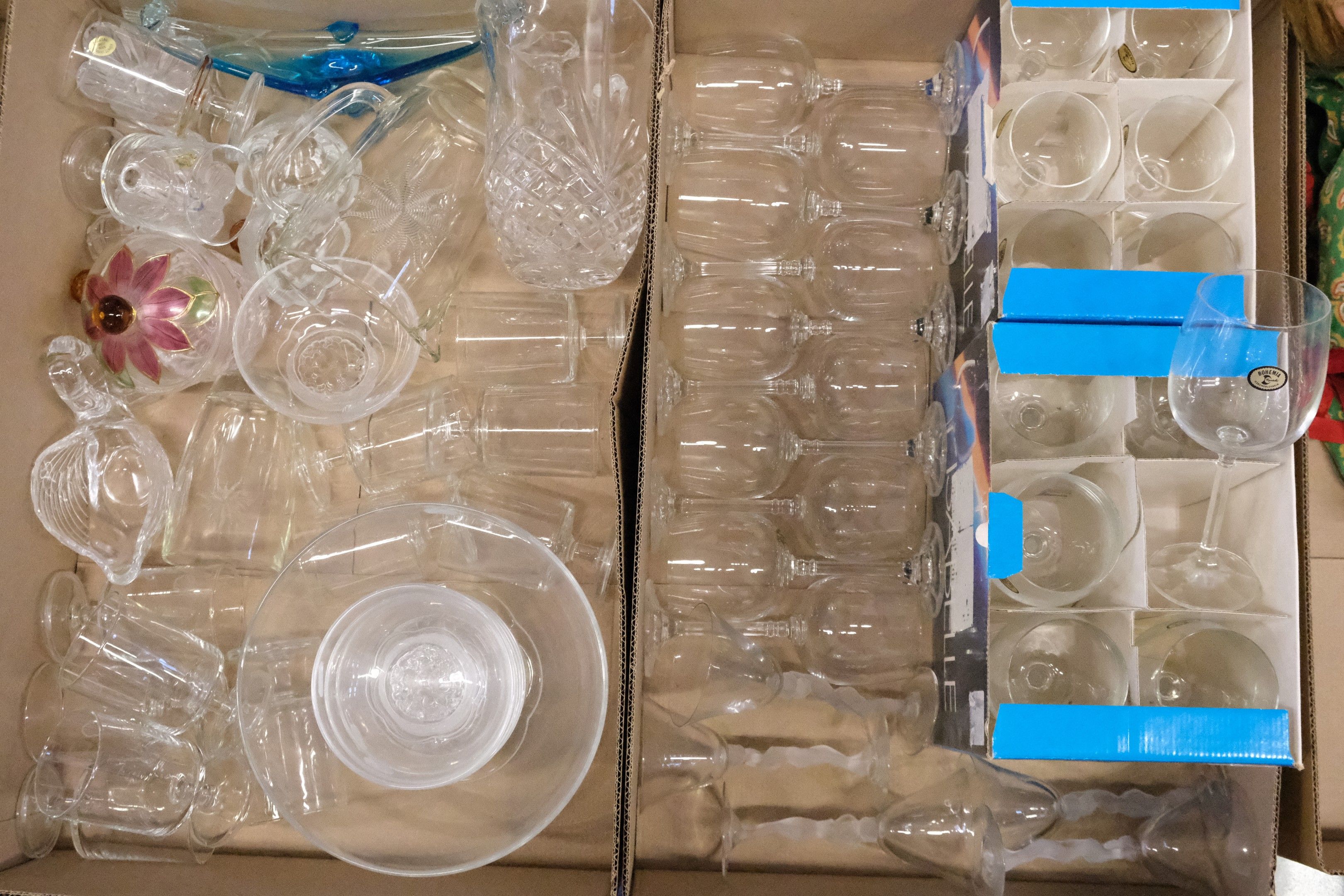 Lot of glassware including carafes, wine glasses, water glasses, candy box and miscellaneous (two boxes).