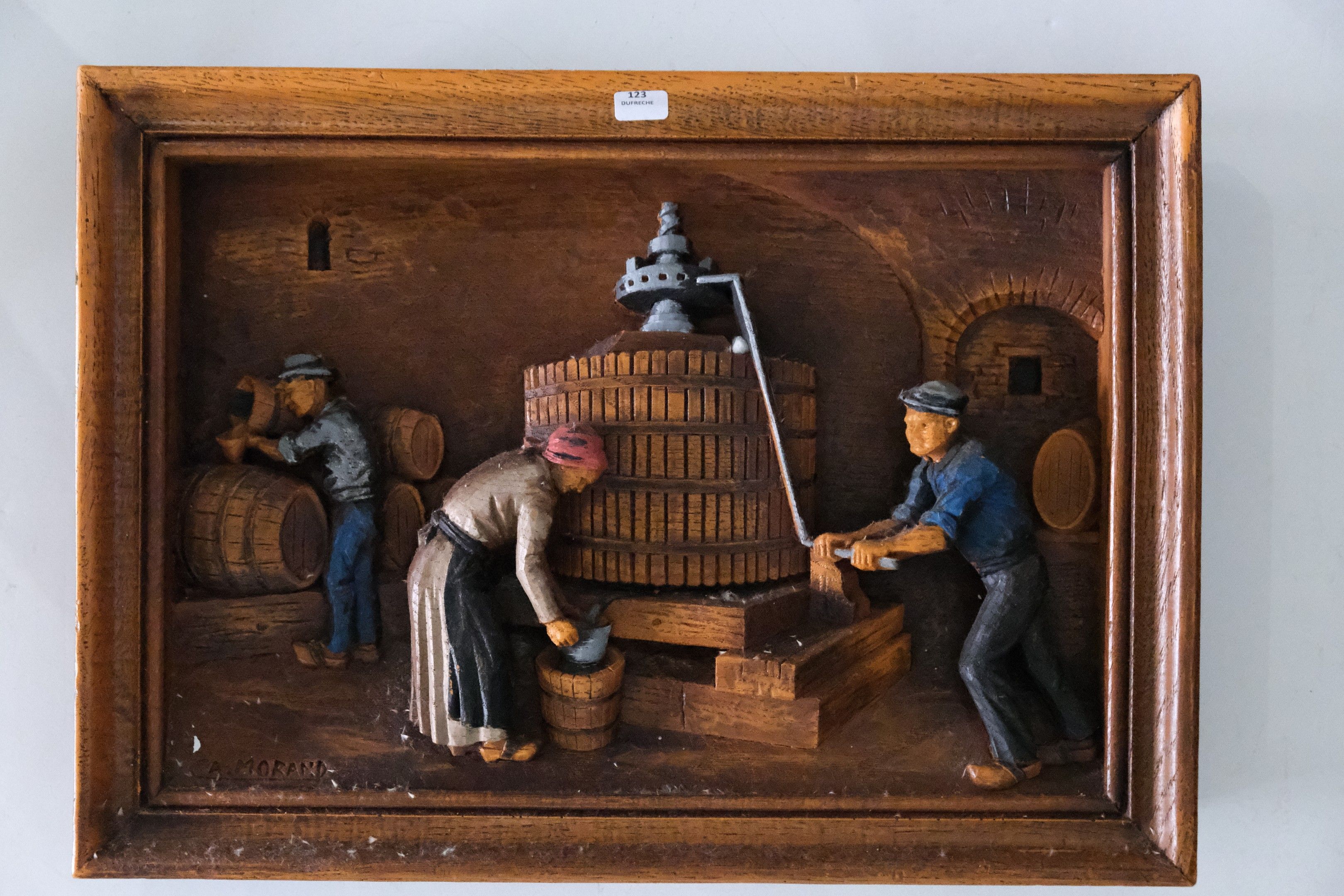 Bas-relief in natural wood depicting winegrowers signed MORAND.