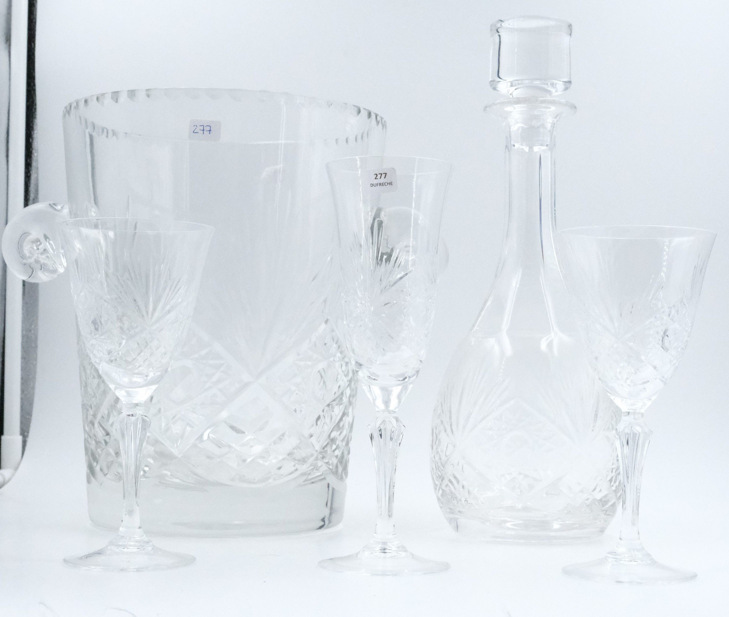 BERTRICHAMPS KLEIN in BACCARAT. Crystal service including an ice bucket, six champagne flutes, eighteen wine glasses (a chip on one neck) and a decanter with stopper. Sold with the boxes.