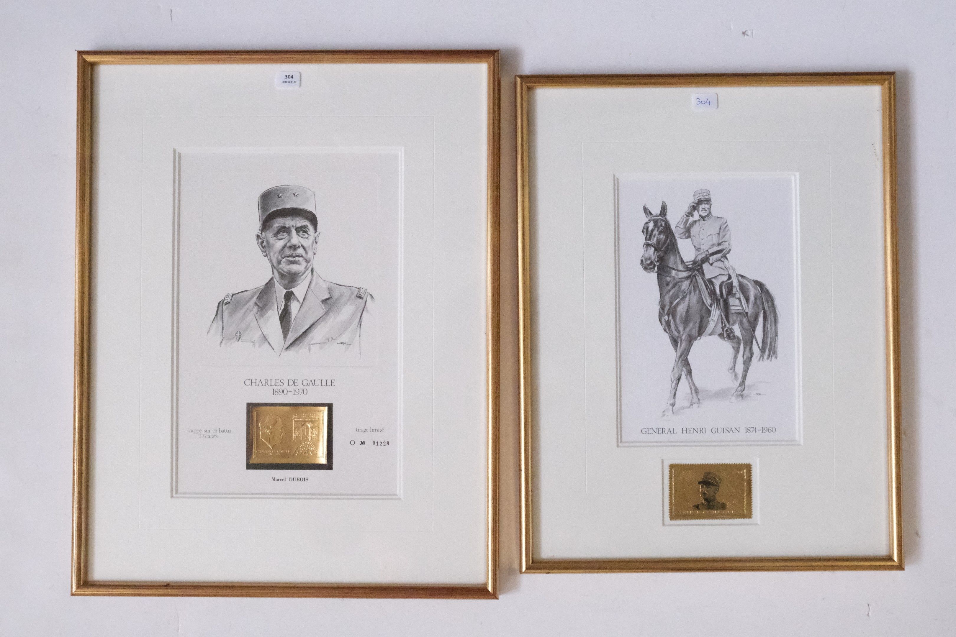 FRANCE. Stamp struck on 23 carat beaten gold bearing the effigy of General De Gaulle, limited edition number 01228. Also included is a stamp of General Henri Guisan.