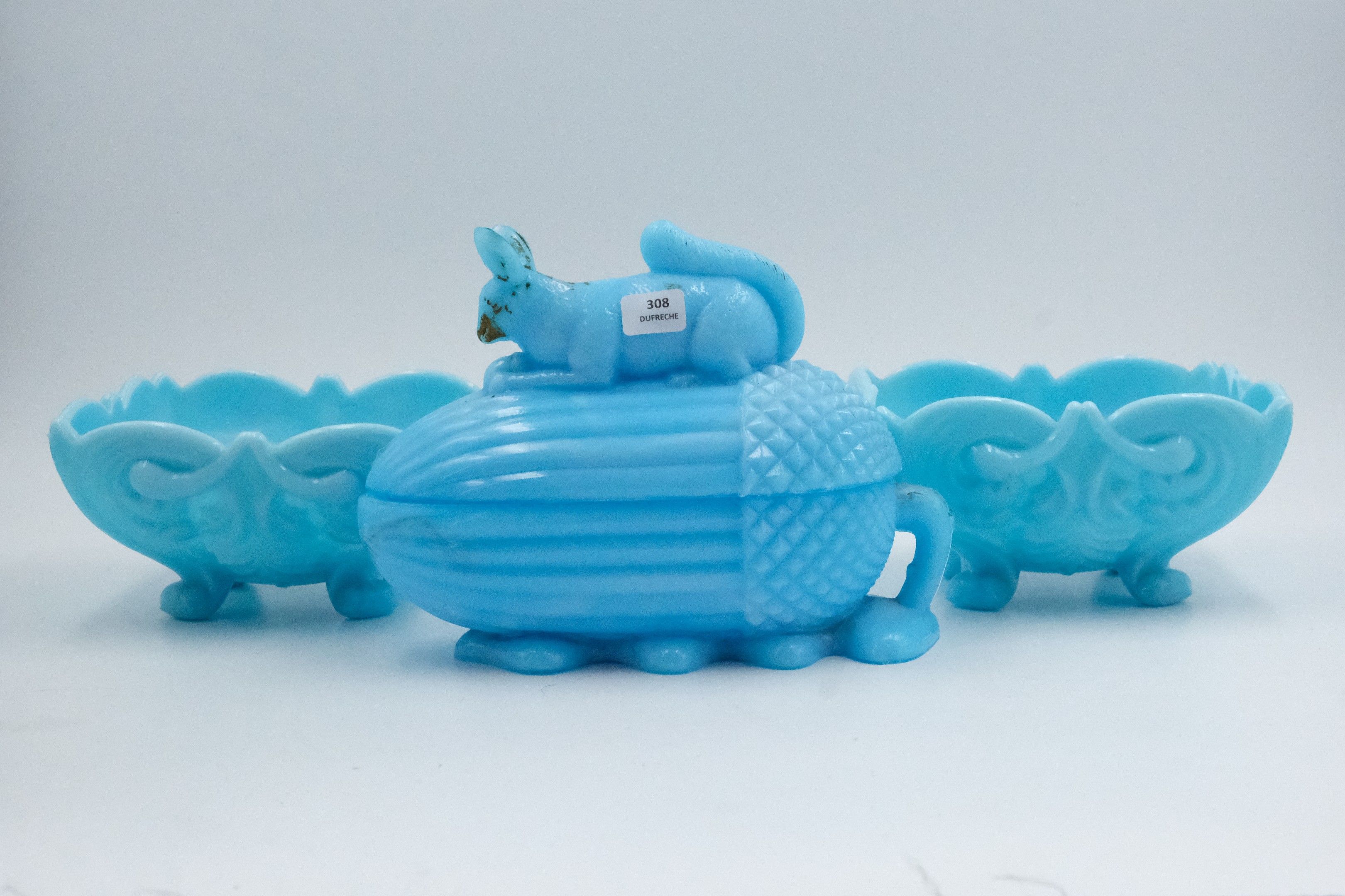 A bonbonnière depicting a squirrel on an acorn and two blue opaline bowls.