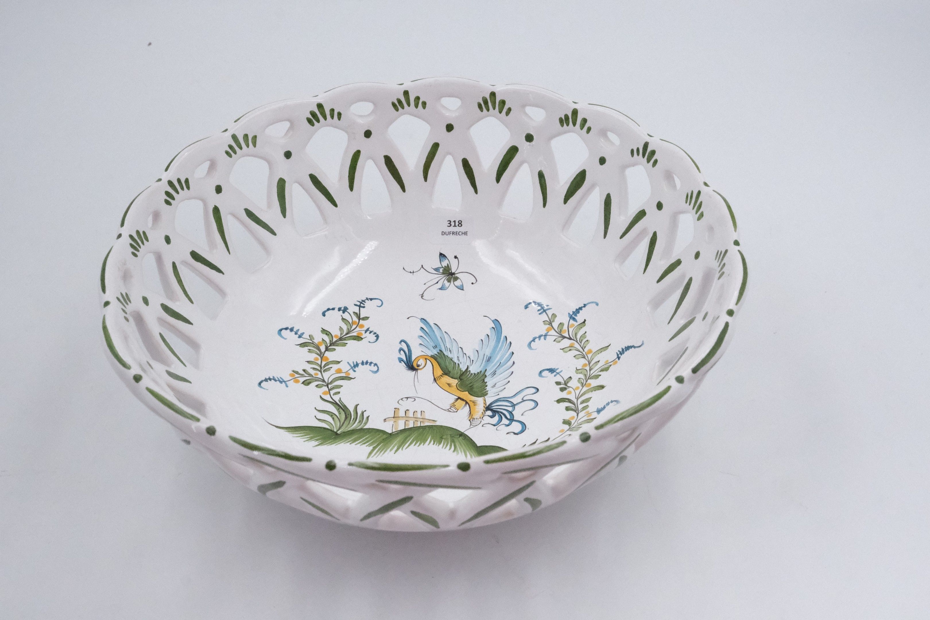 MOUSTIERS. Earthenware basket decorated with a bird.