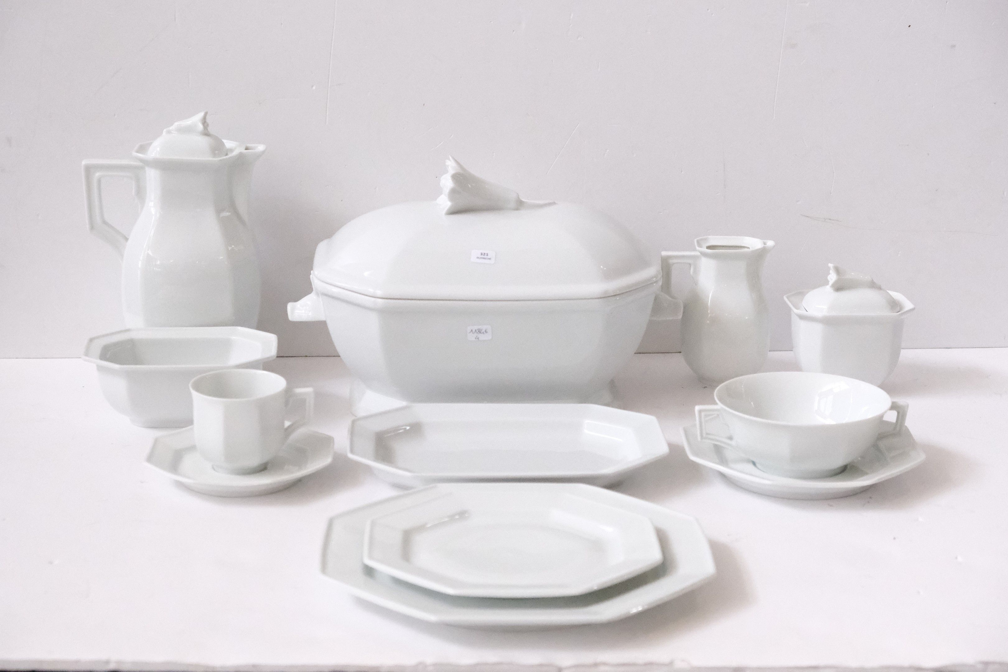 LIMOGES FRANCE. Part of a "COQUET" model Lotus porcelain dinner service comprising a coffee pot, a milk jug, a sugar bowl, ten cups with saucers, twelve dinner plates, six dessert plates, two ravioli dishes, a sauce boat with saucer, twelve soup bowls (one slightly chipped) with saucers and a tureen.