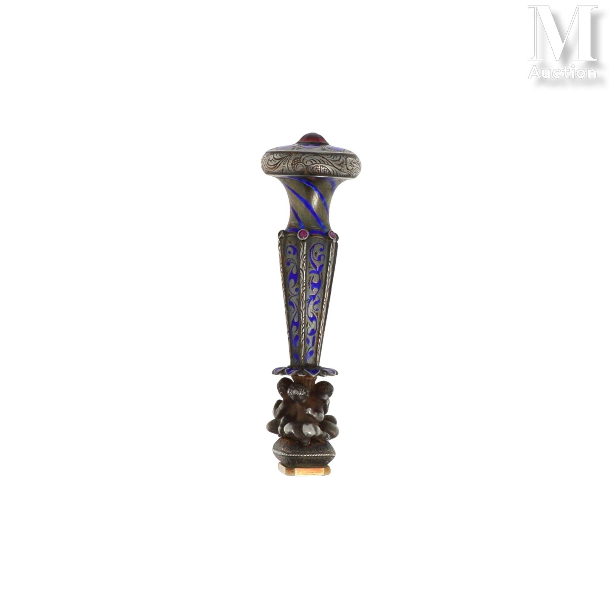 Silver (800°/°°) and vermeil cachet with cut sides underlined by small rubies, partially chased and with blue enamelled decoration of volutes, arabesques, and collars; the whole supported by three putti sitting on a cushion, the circular grip surmounted by a facetted garnet. The die engraved "SA, 20 August 1840".