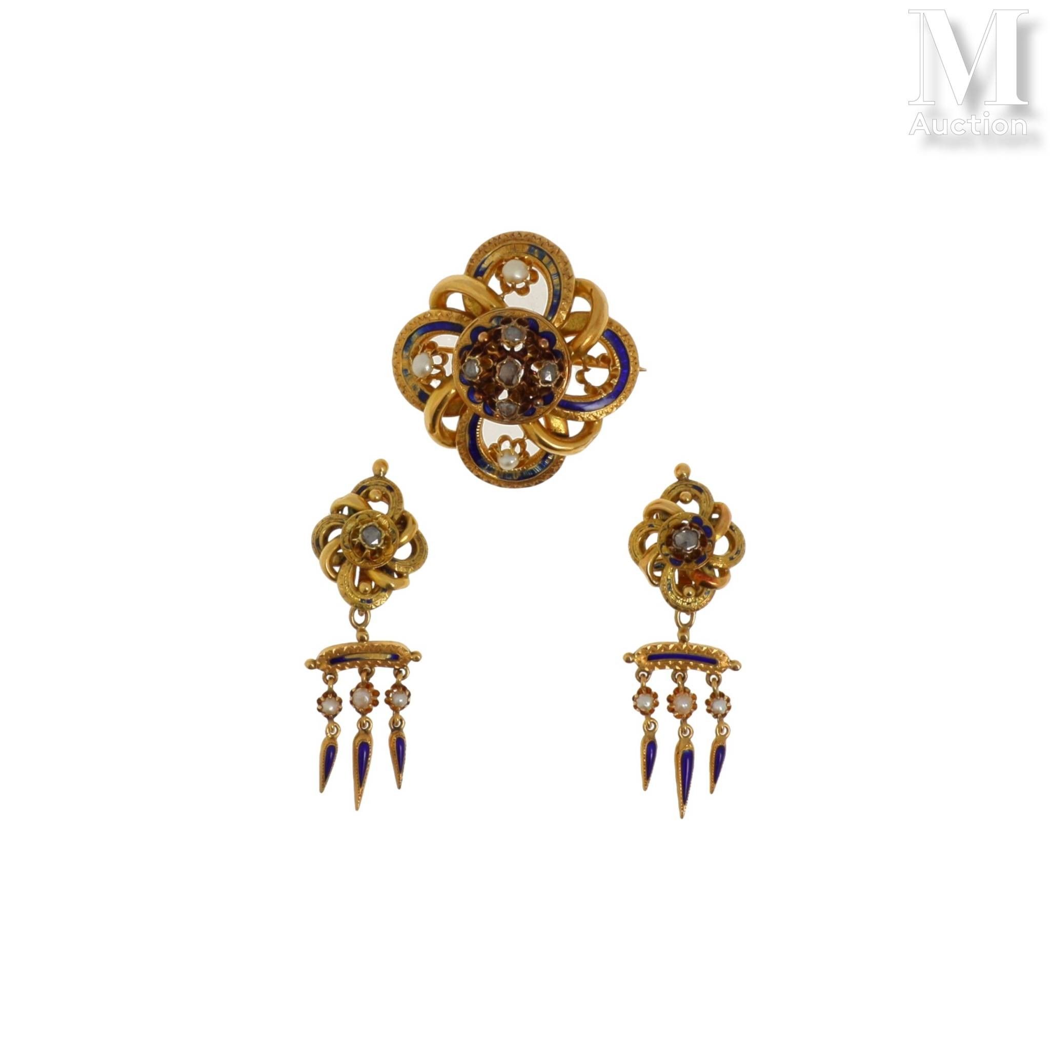 Half set in 18K (750°/°°) yellow gold comprising a pair of earrings and a brooch, each enamelled blue and adorned with half pearls* and diamond chips.
