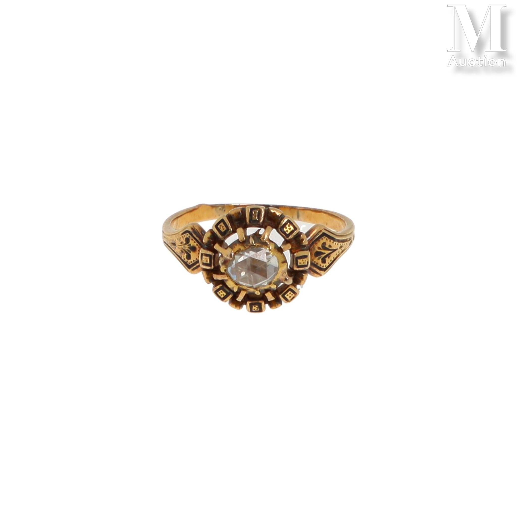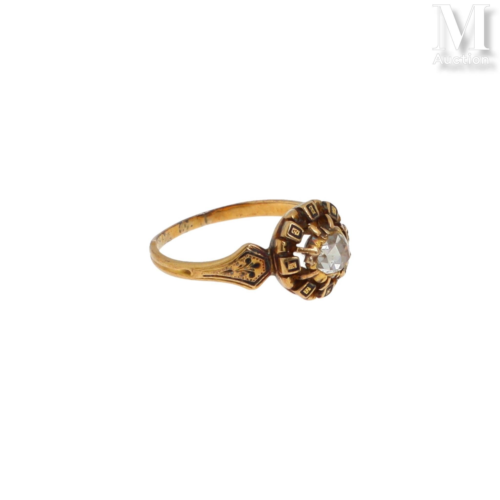 Ring in 18K (750°/°°) yellow gold, centred on a rose-cut diamond surrounded by black enamel motifs.