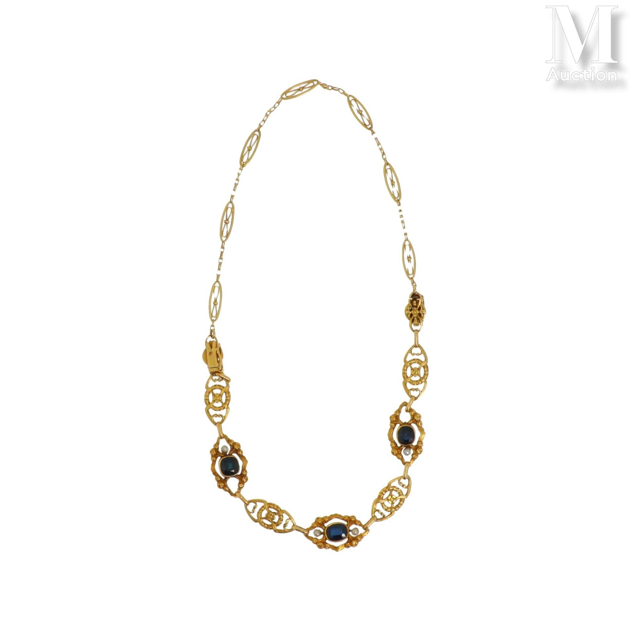 Necklace in 18K (750°/°°) yellow gold, convertible into a bracelet, with filigree navette links, the central motif adorned with three sapphires with small button pearls*; ratchet clasps.
